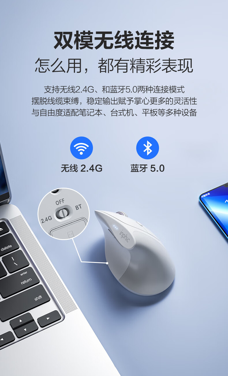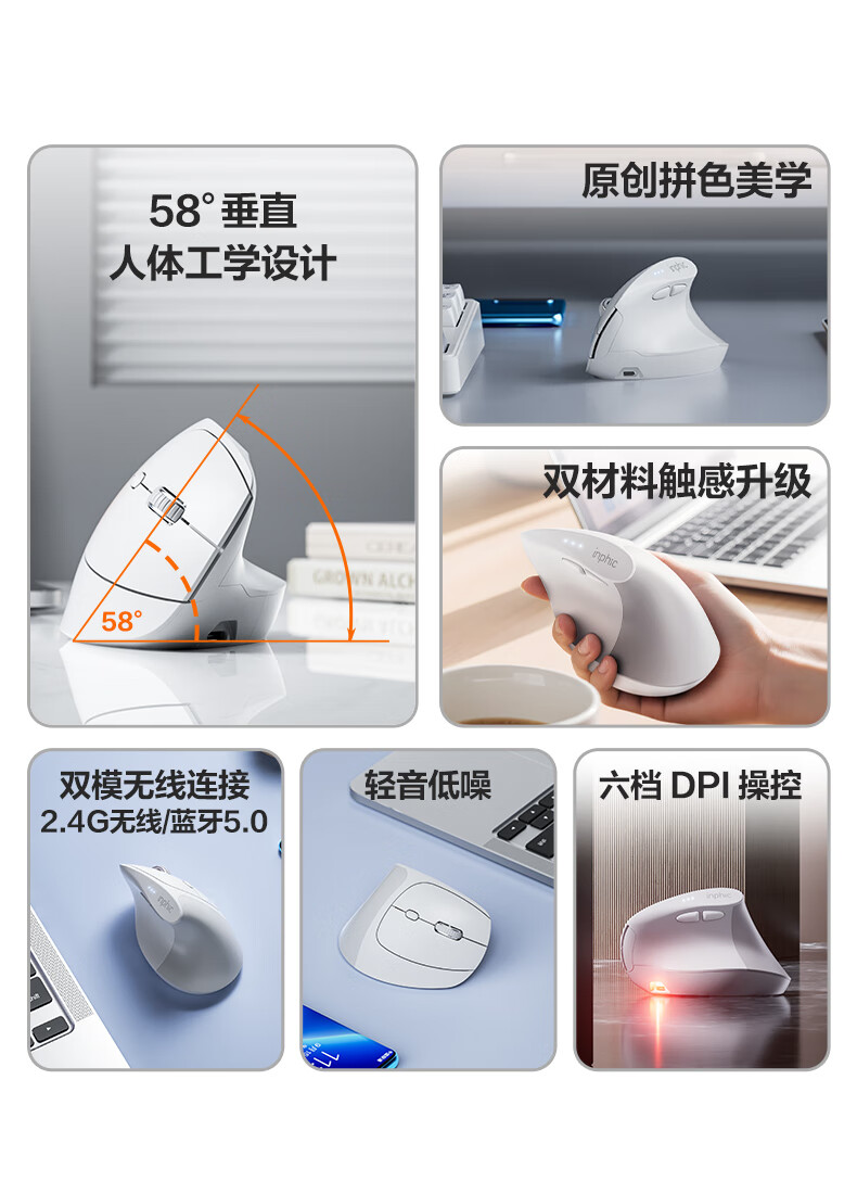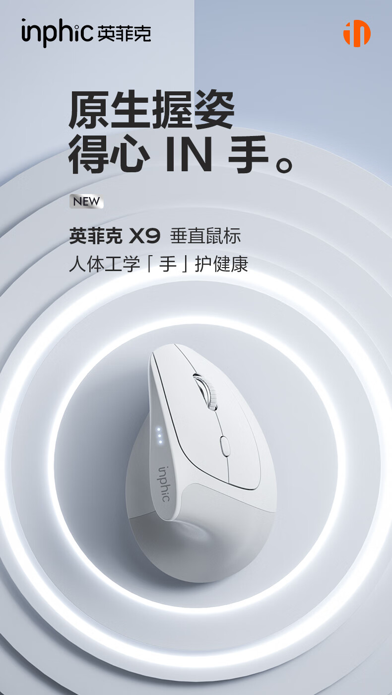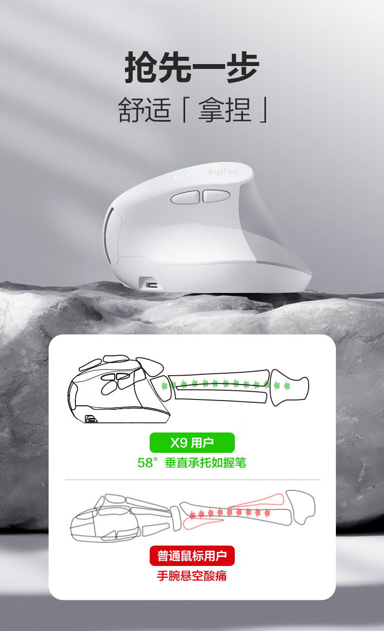 英菲克(INPHIC)X9人体工学垂直立式鼠标无线蓝牙双模充电静音办公电脑笔记本竖握立体鼠标防鼠标手专用 竖握滑鼠 【店长推荐】X9PRO灰蓝牙版【1k回报+宏编程】