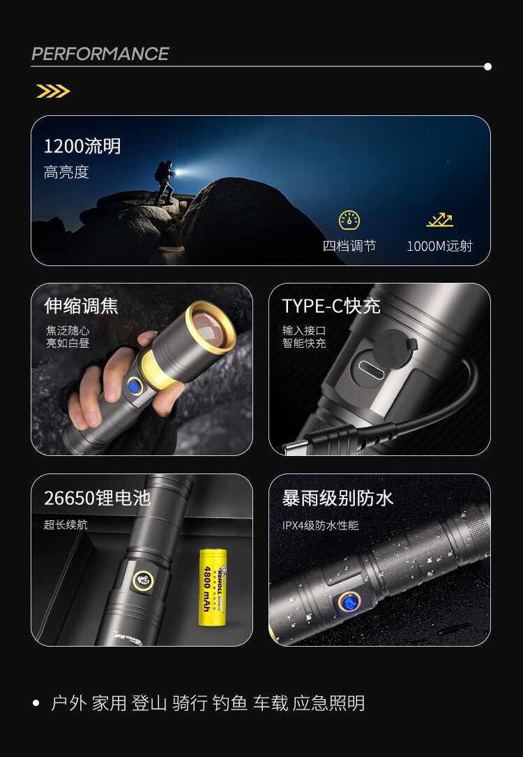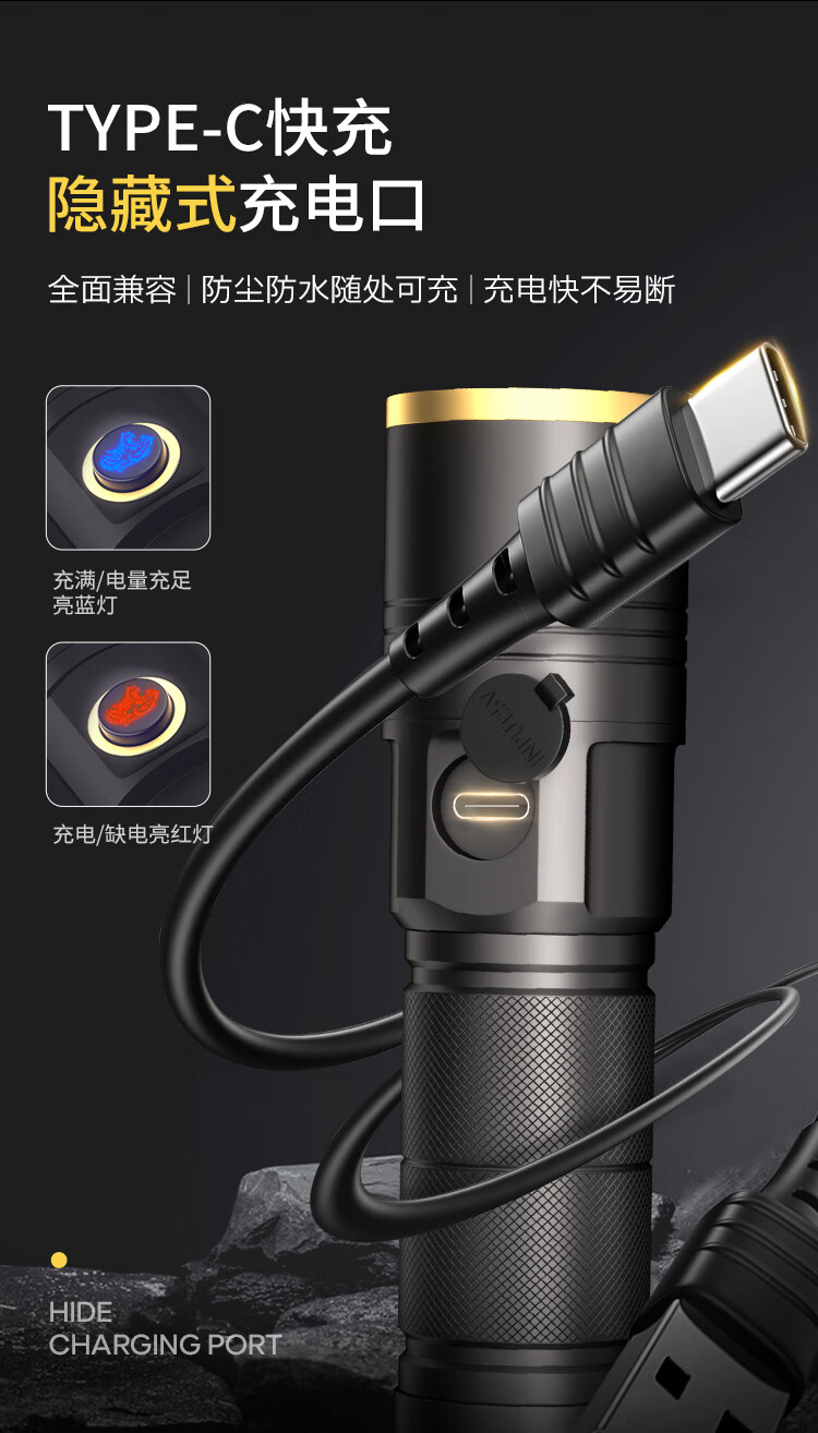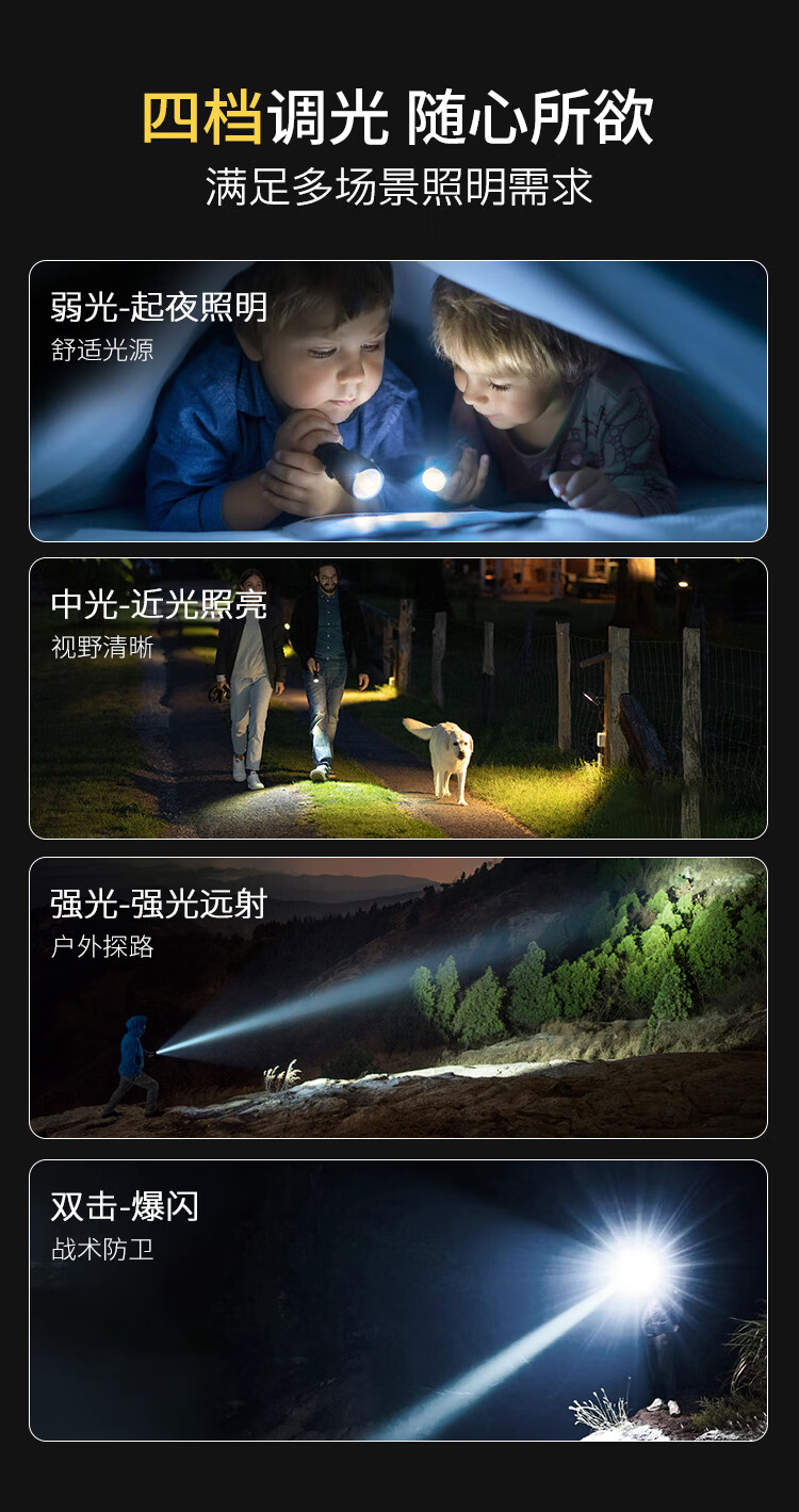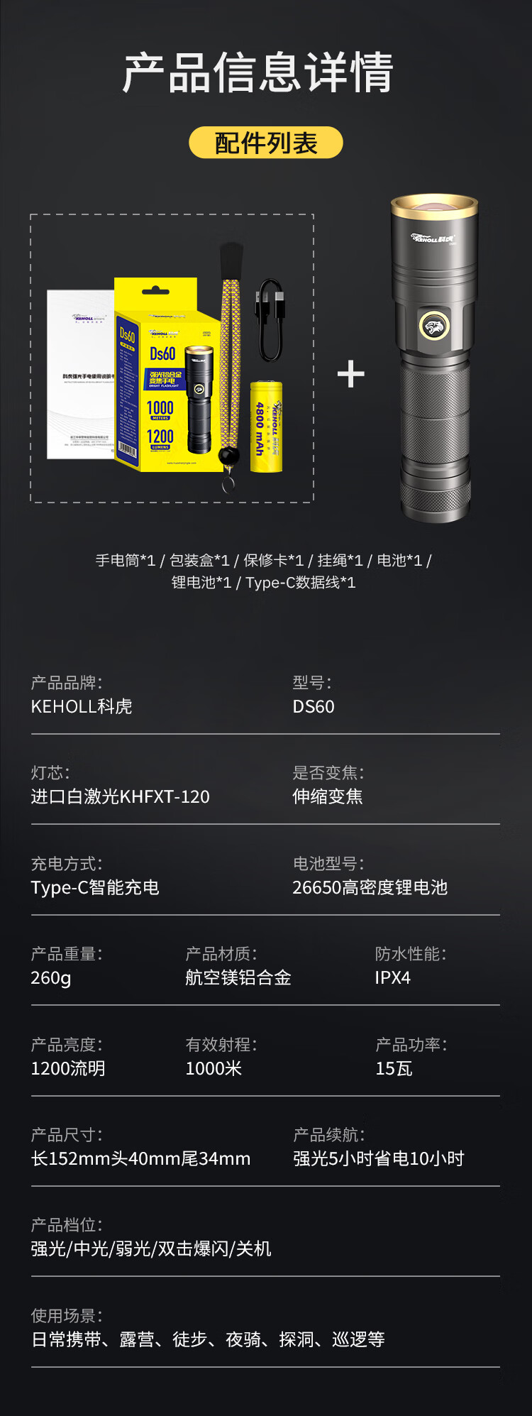 科虎强光手电筒长续航充电LED照明灯远射变焦户外露营铝合金防水手电 DS60铝合金1200流明【锂电池*2】