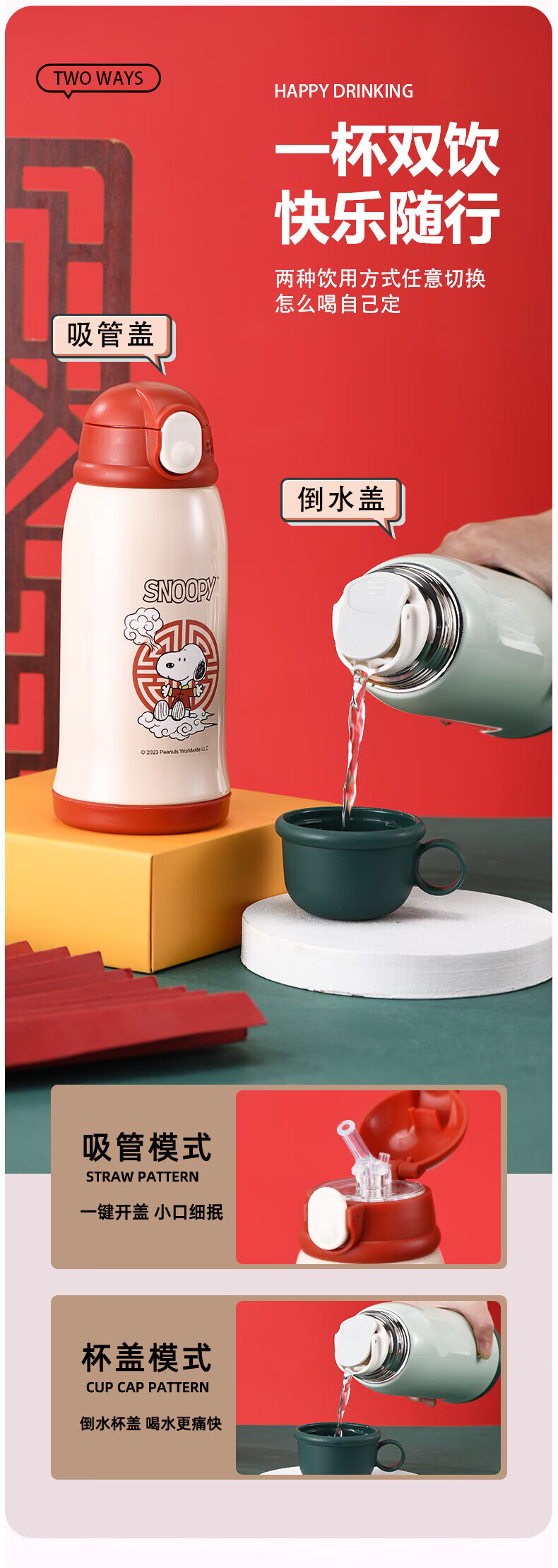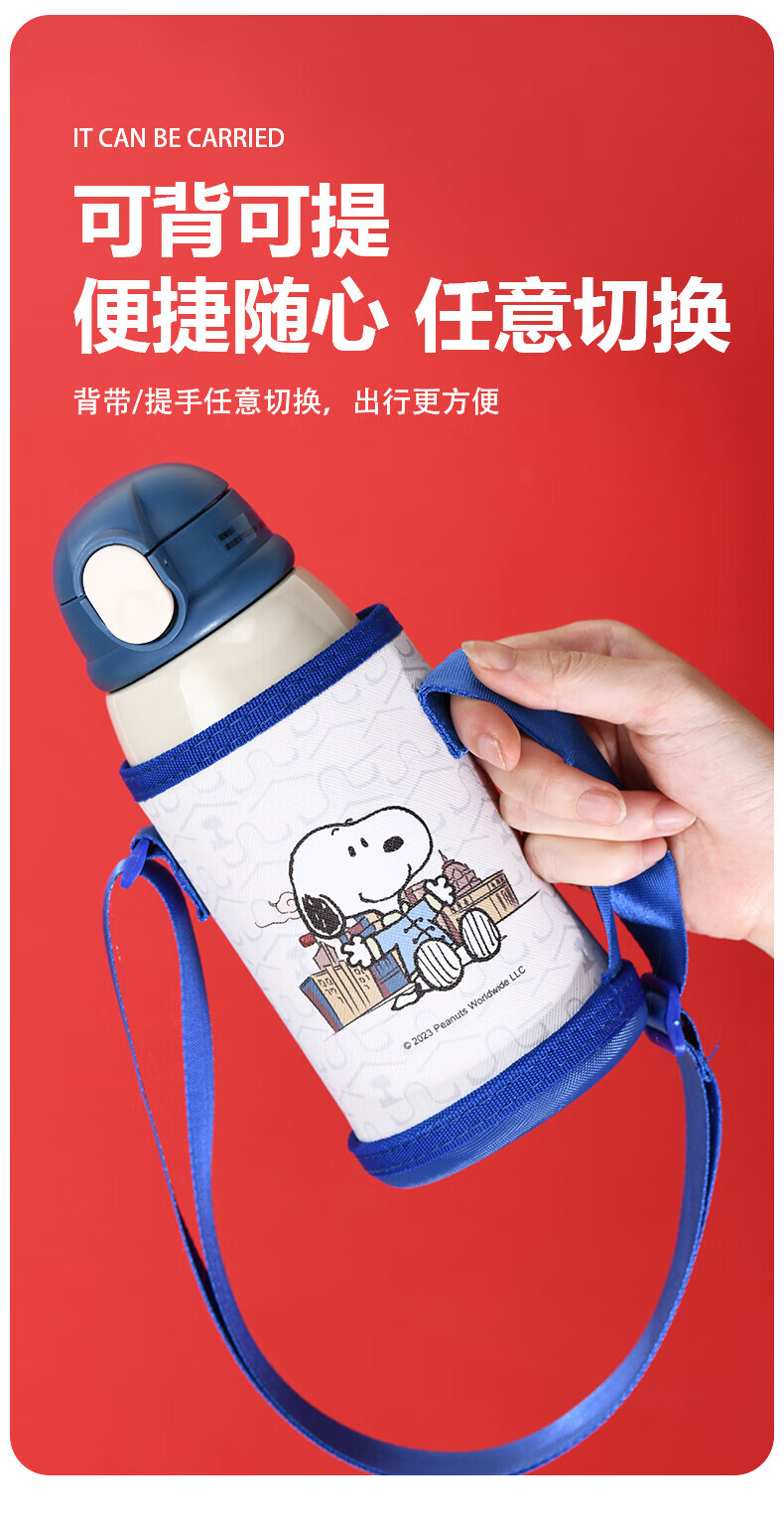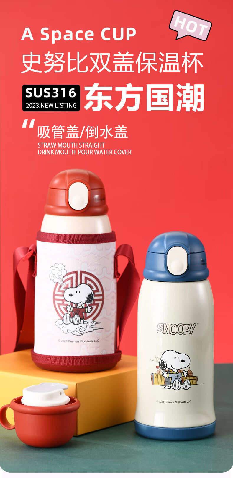 史努比儿童保温杯316不锈钢带吸管大容量水壶男女学生上学专用国潮水杯 蓝色-国潮【杯刷+吸管刷】