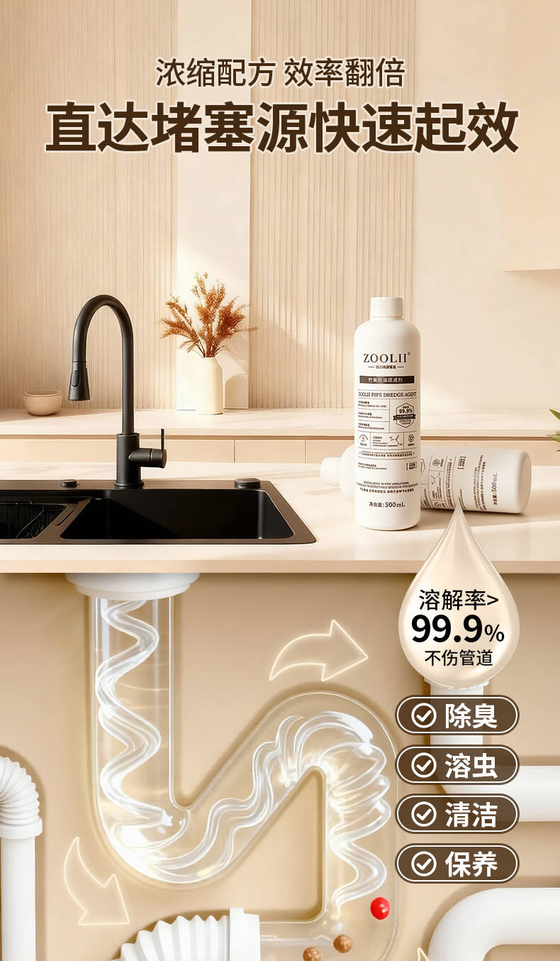 ZOOLII管道疏通剂强效疏通下水道神器卫生间厕所地漏下水道疏通剂 【买2送2超值装】到手500ml*4瓶装