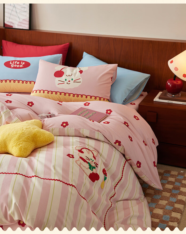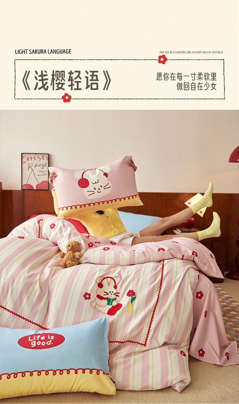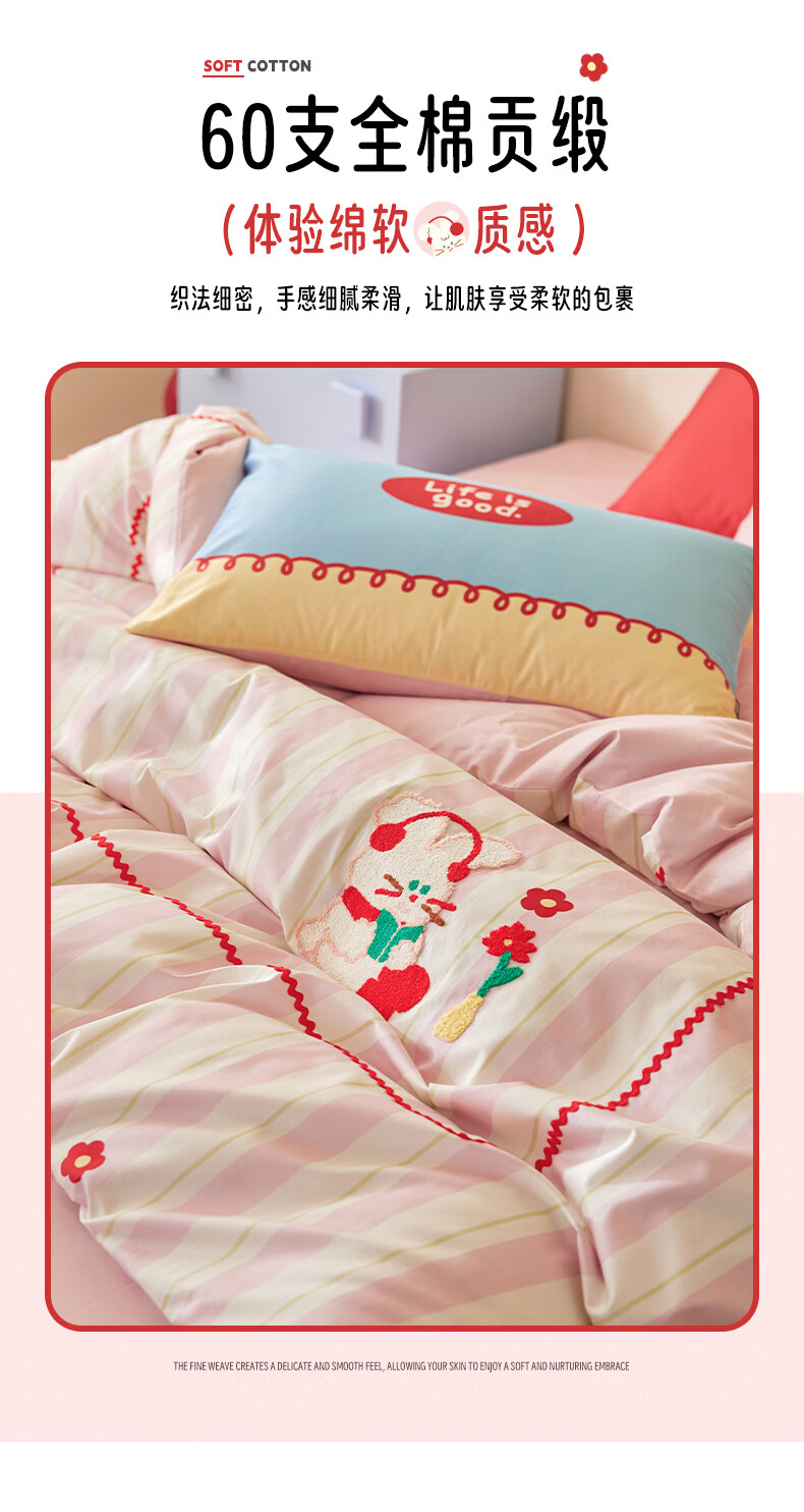 多喜爱家纺纯棉床上四件套 轻奢60支全棉贡缎刺绣双人床单被套床品套件1.5床203*229cm