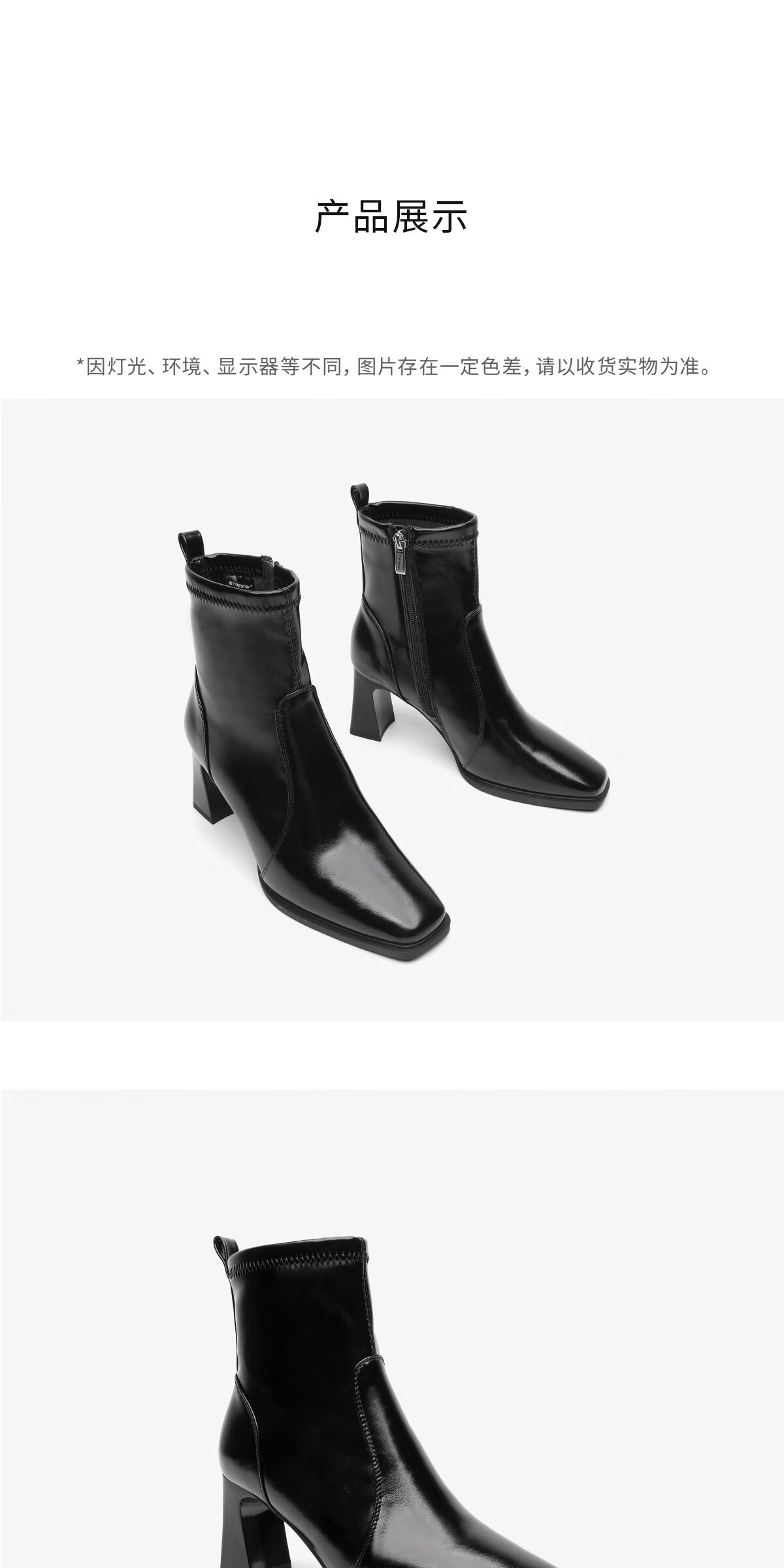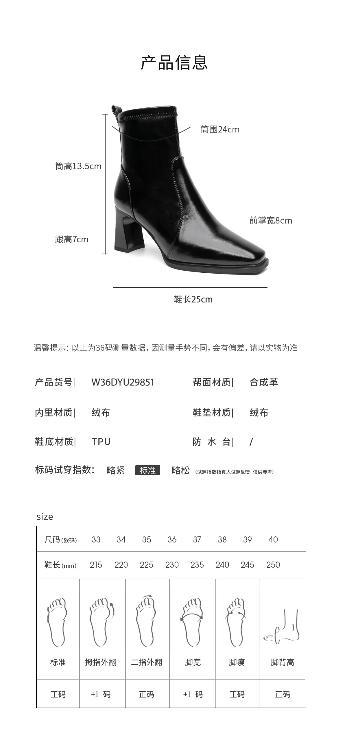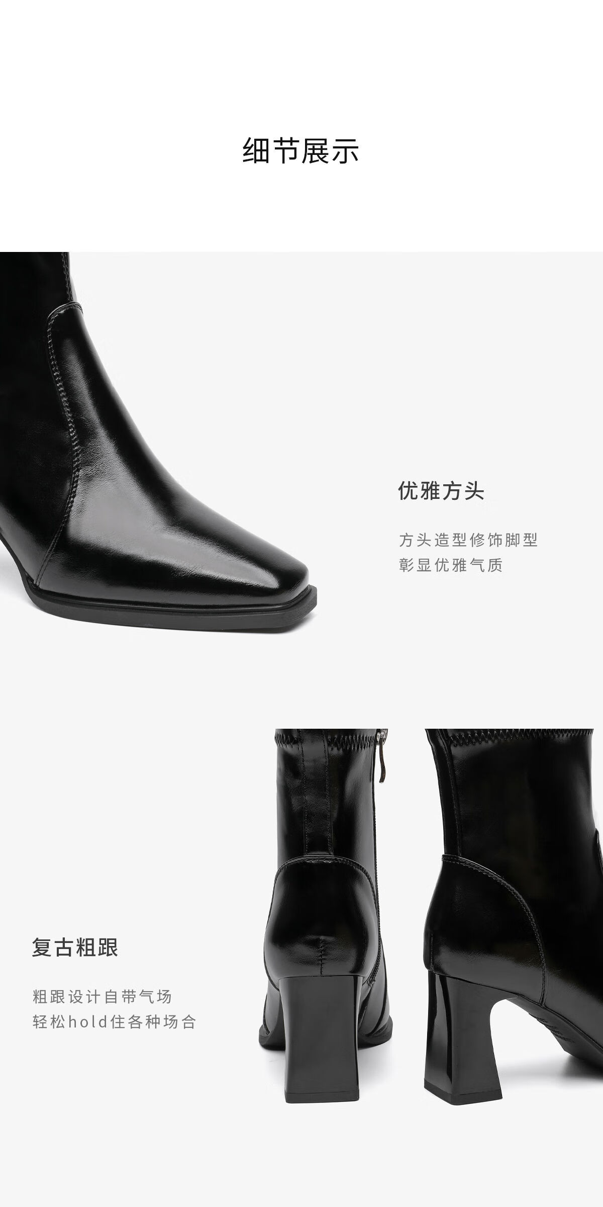 月芽儿方头短靴女2025新款冬季马丁靴黑色高跟鞋靴子百搭 绒里黑色01T 34