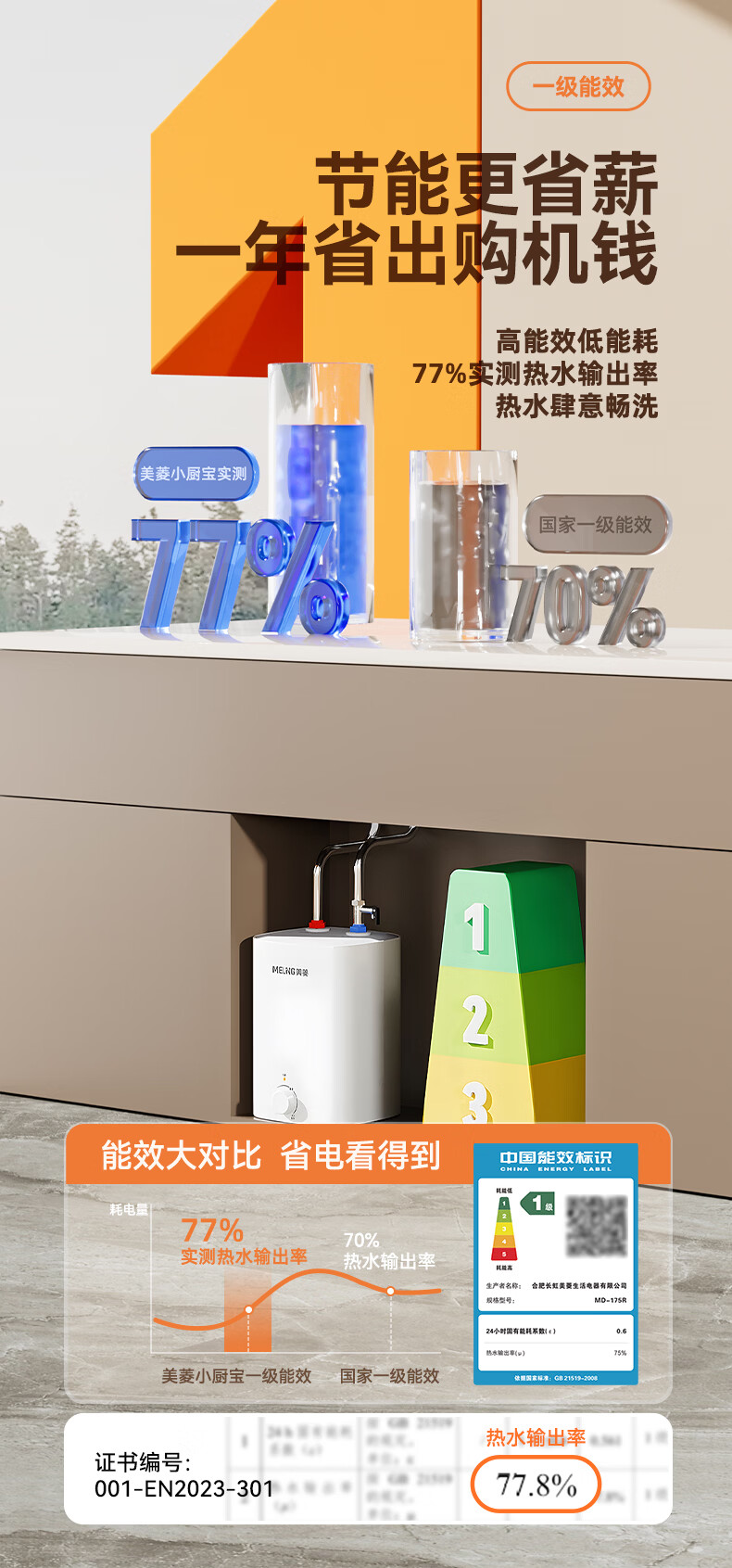 美菱【8年质保】7.5升小厨宝家用电热水器2100W连续出热水57升一级能效国家补贴15%专利防电墙MD-175R
