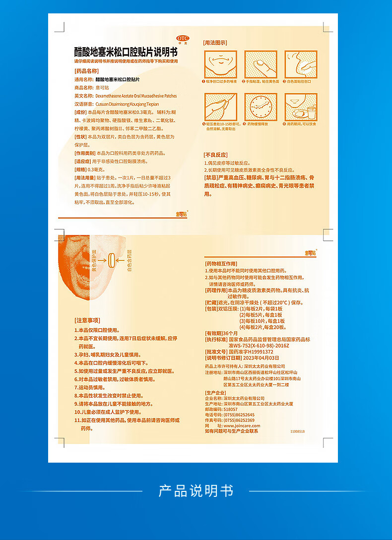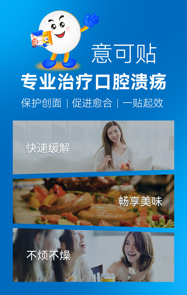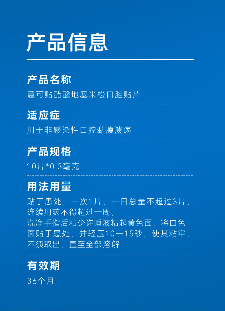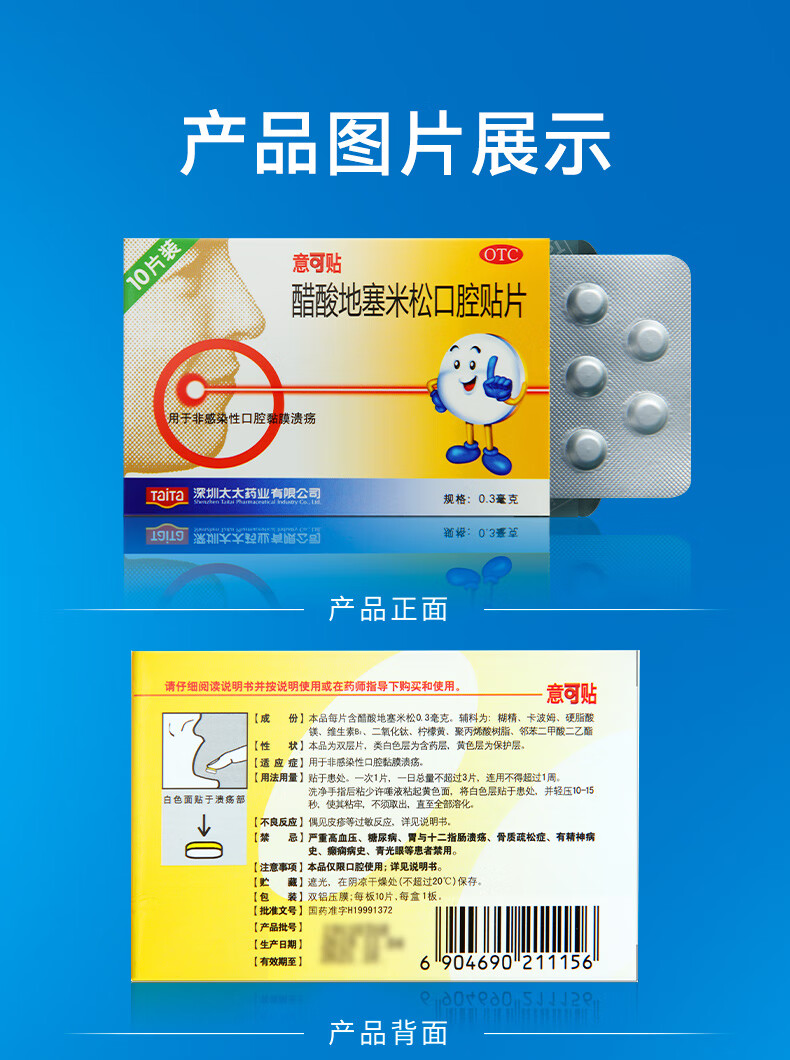 【原研药】意可贴 醋酸地塞米松口腔贴片 0.3mg*10片*1板/盒 双层片 非感染性口腔溃疡 口腔黏膜溃疡