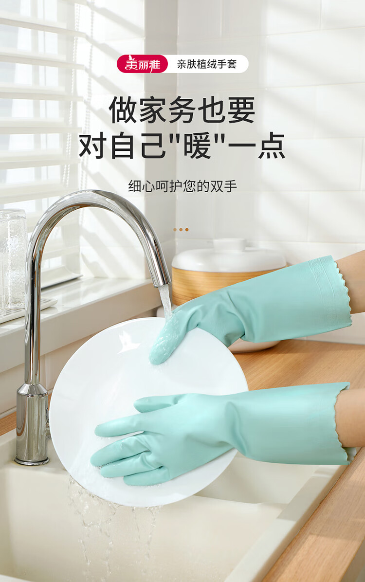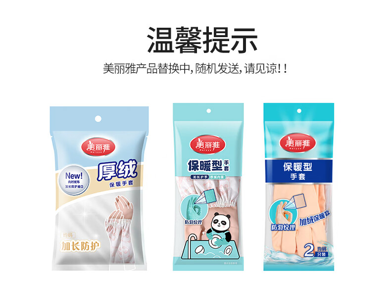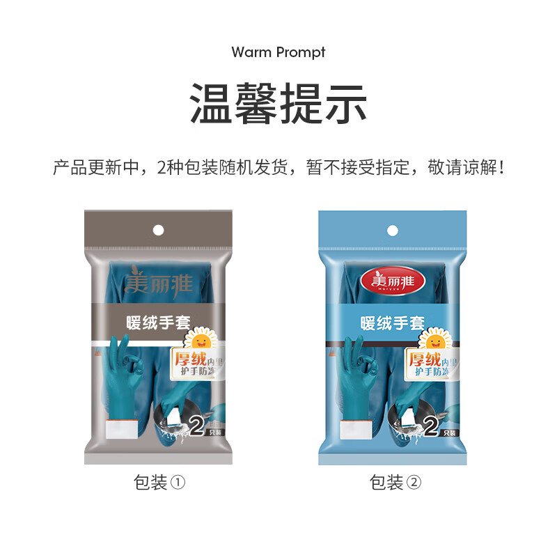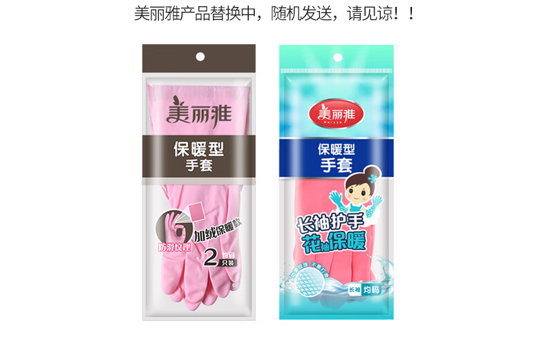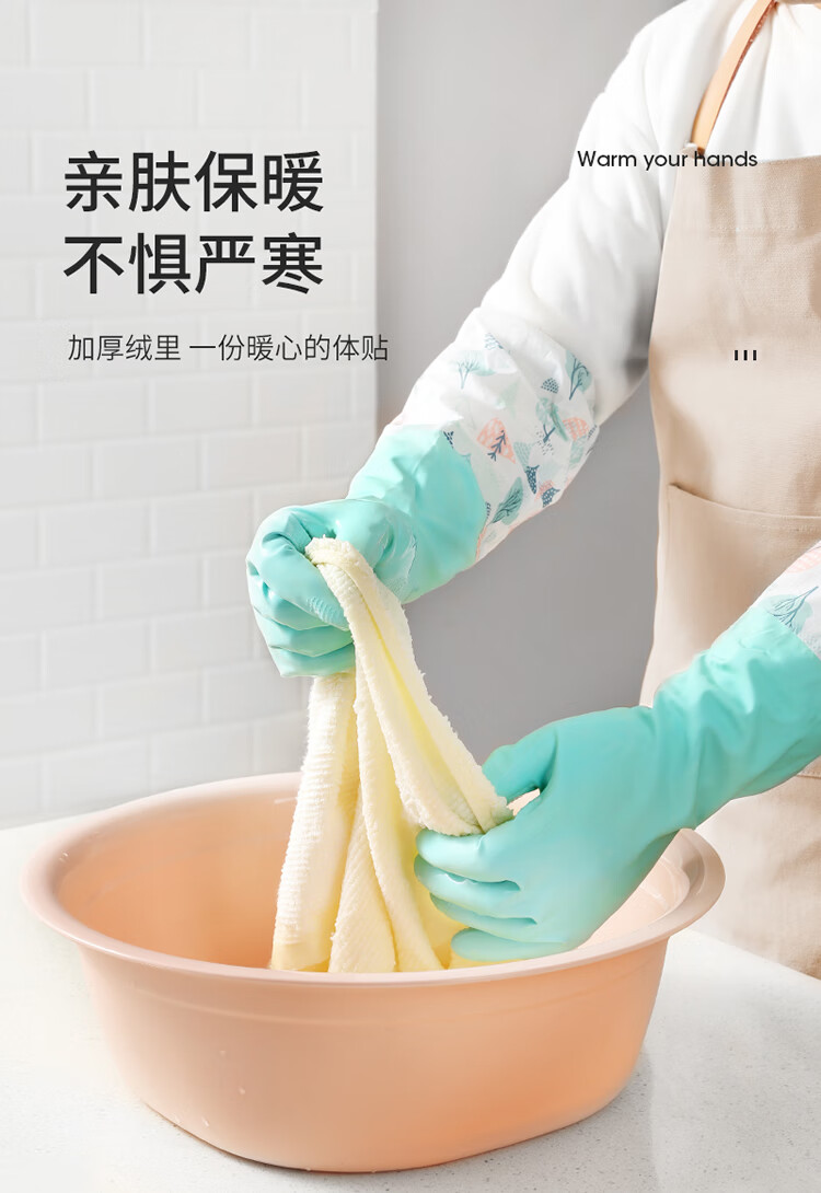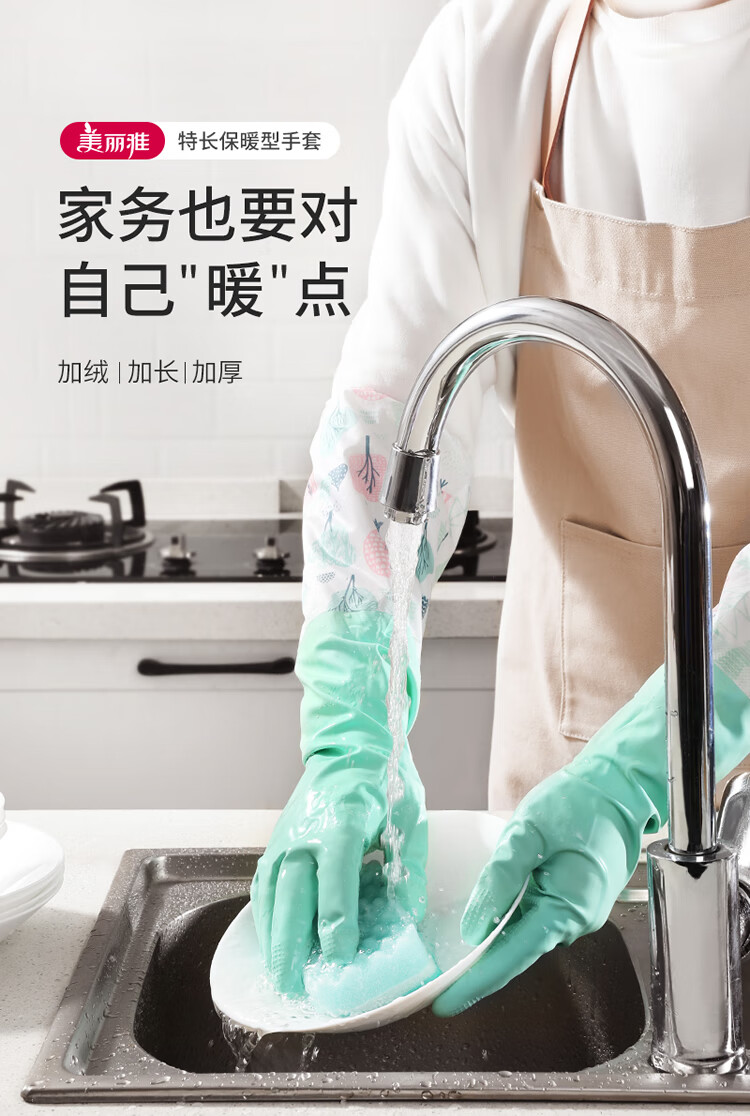 美丽雅(MARYYA)加绒手套 家用防护厚绒双层保暖洗碗洗衣服家务防水护手套男女 加长保暖型手套 颜色随机 2双 均码