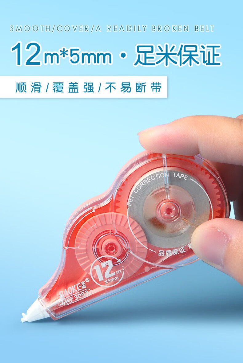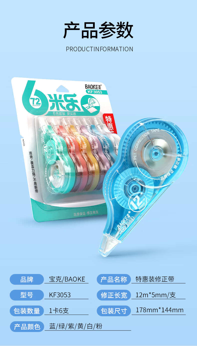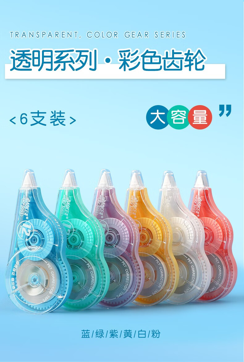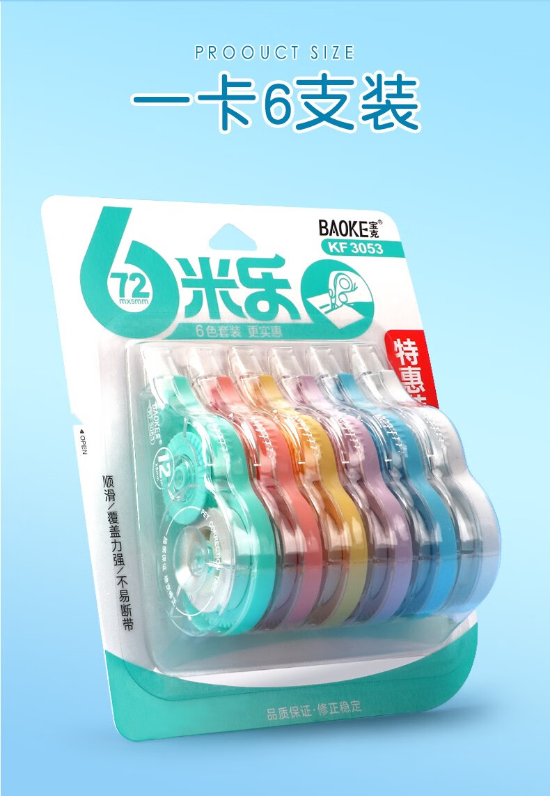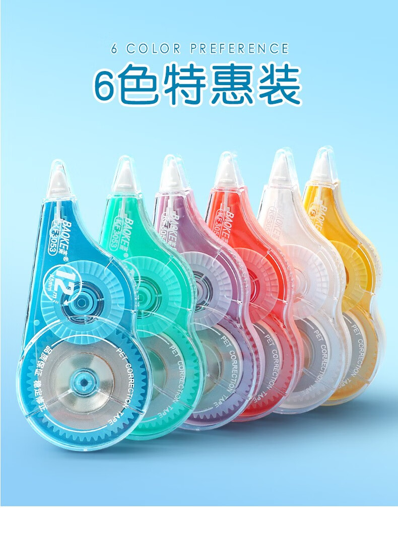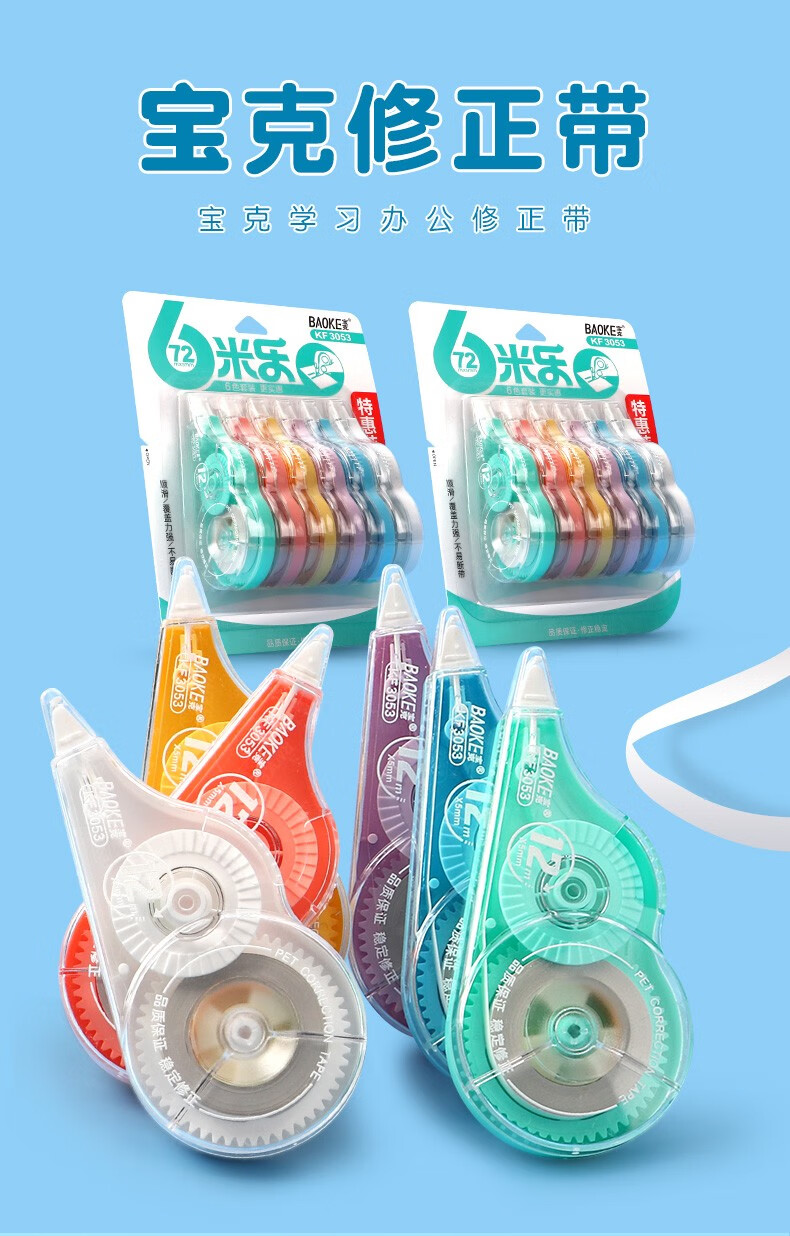 宝克(BAOKE)修正带 学生办公通用 改正带 涂改带 大中小学生儿童读书写字学习用品文具 12米*6支 原纸色带芯 KF3066 款式颜色随机发 包邮
