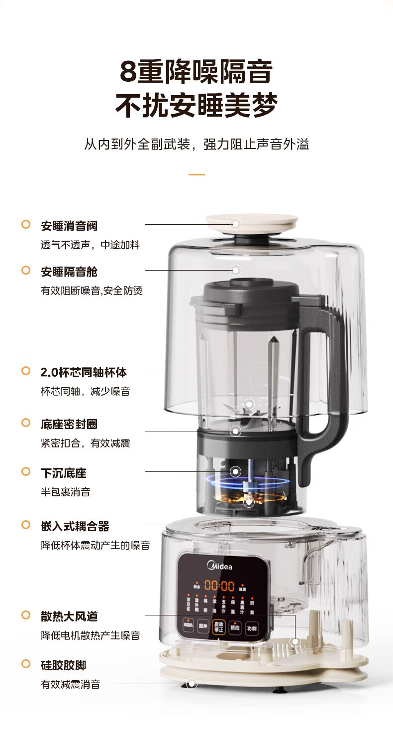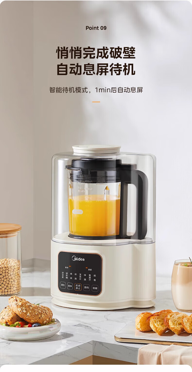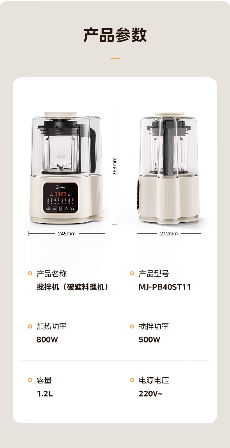 美的(Midea)破壁机家用豆浆机自动清洗1.2L小型轻音多功能降噪榨汁料理机2-3人用五谷杂粮辅食机 MJ-PB40ST11 【爆款】40d安睡~细腻免滤1.2L
