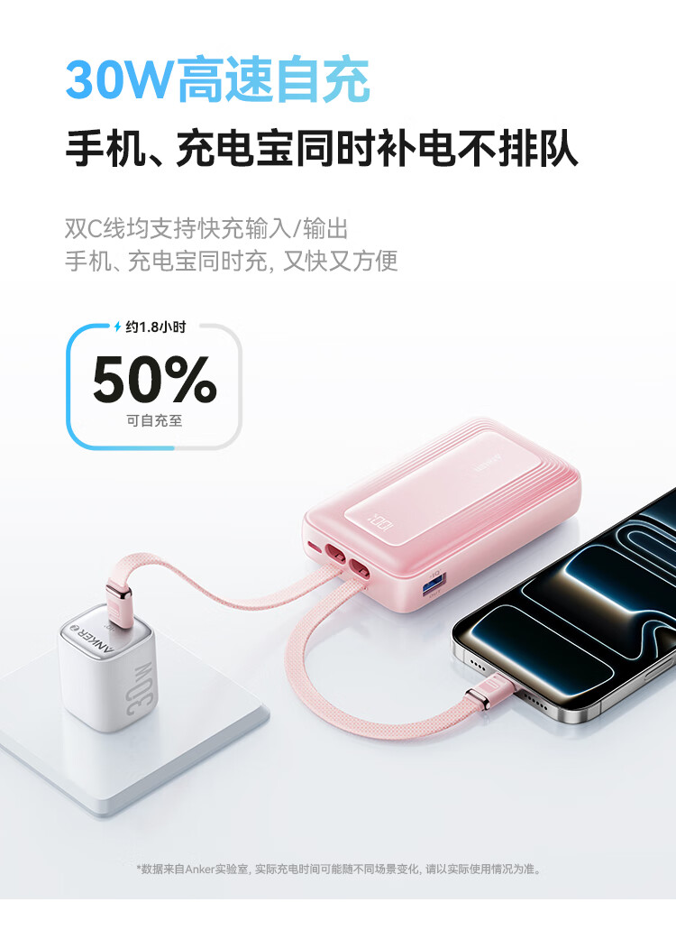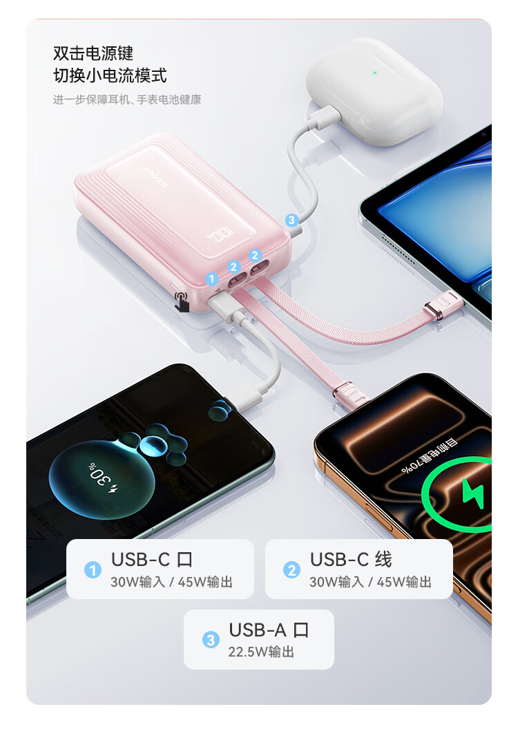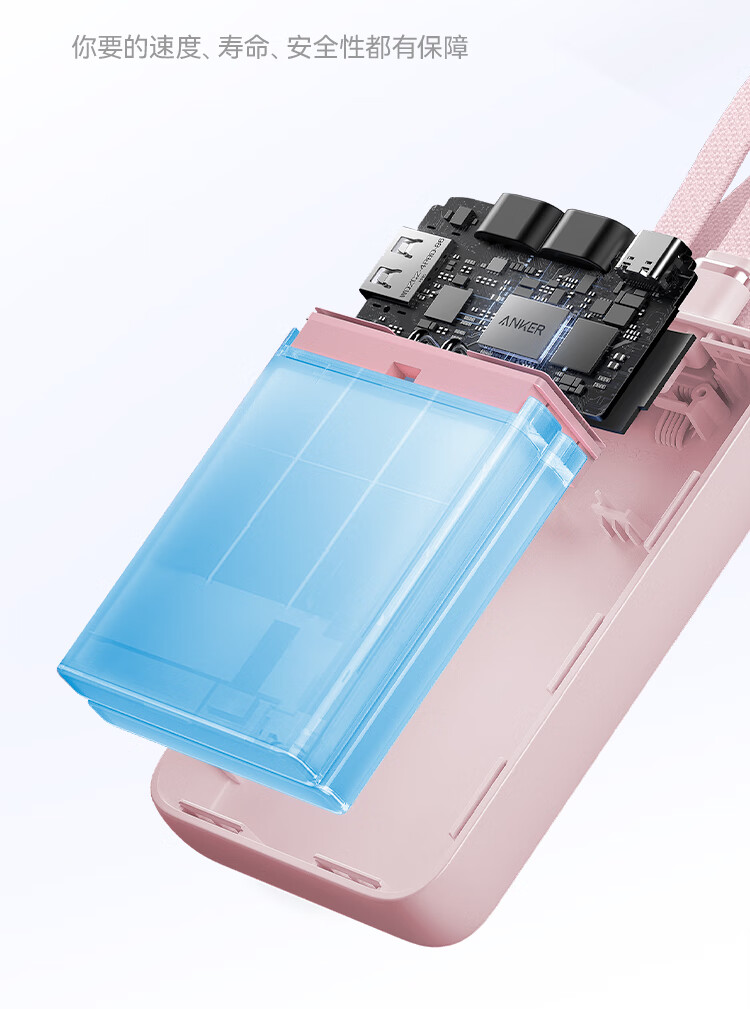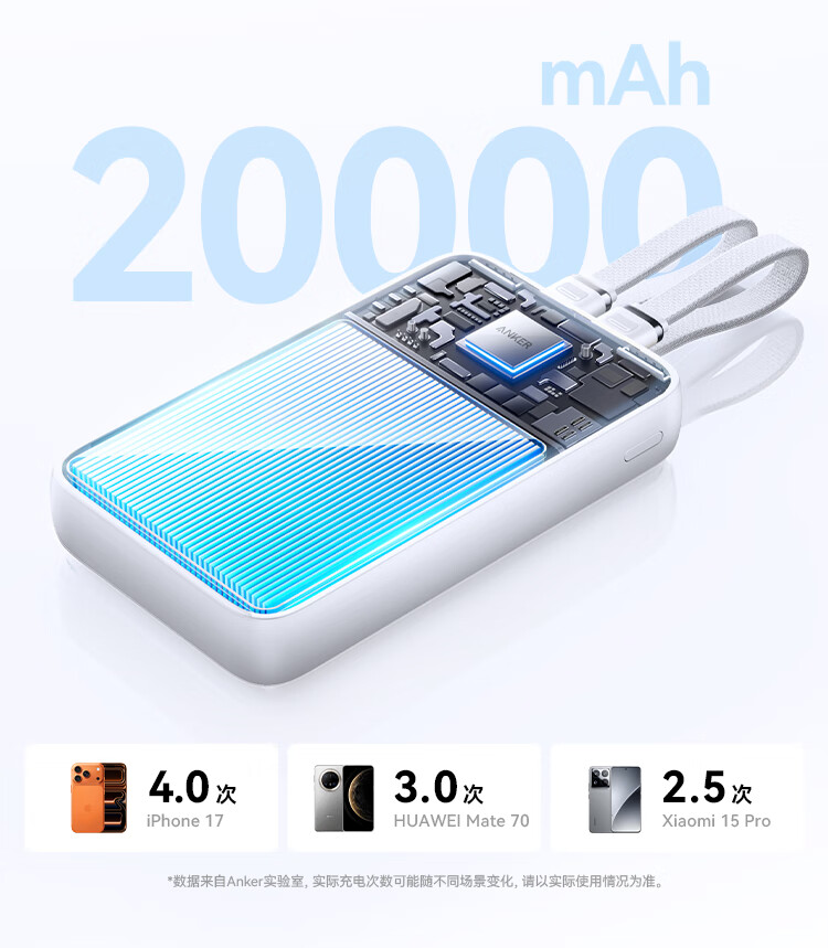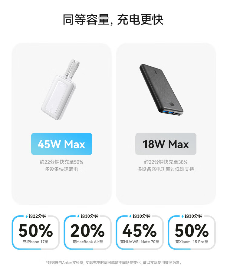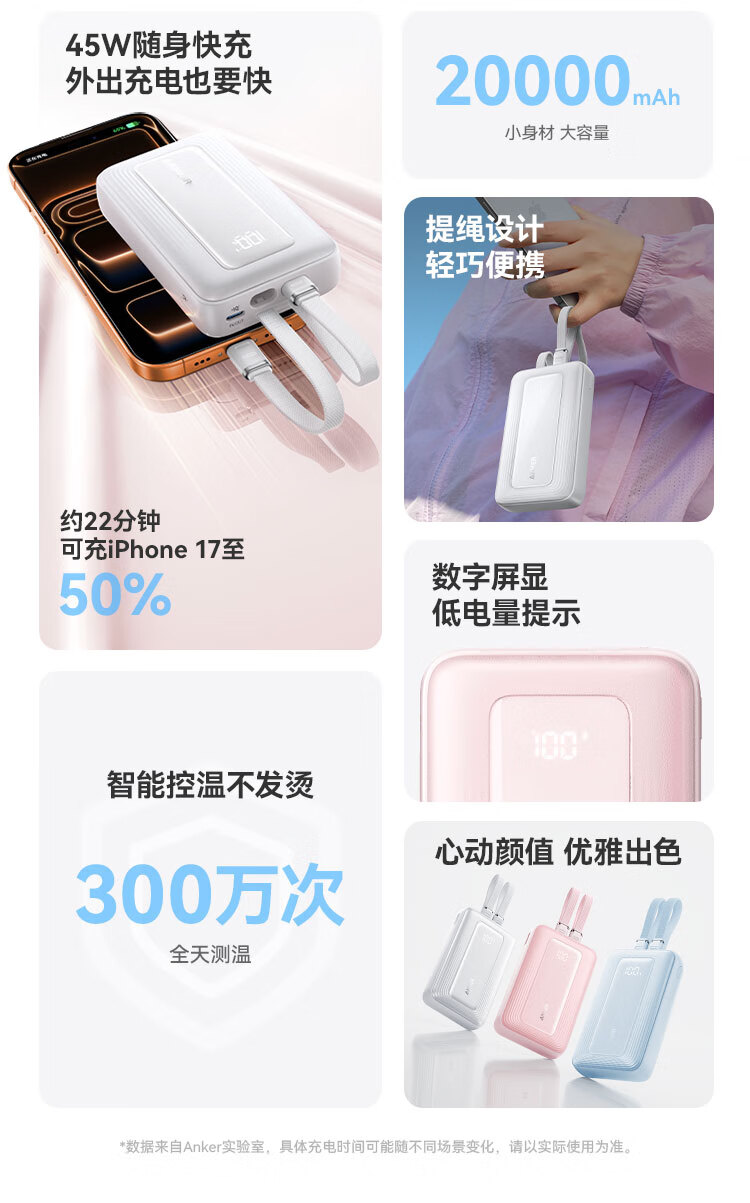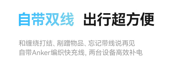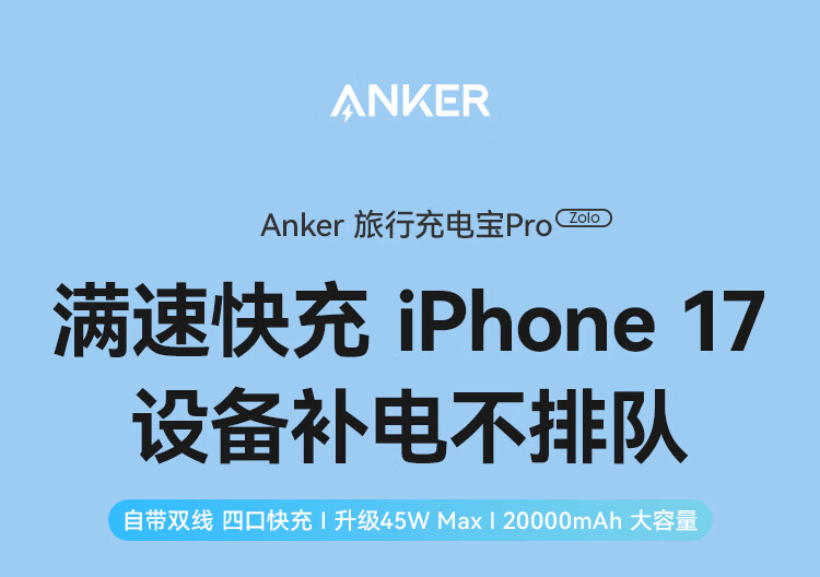 ANKER 安克【3C认证可上飞机】旅行充电宝自带双c线45W20000毫安mAh大容量超快充移动电源安卓苹果 蓝