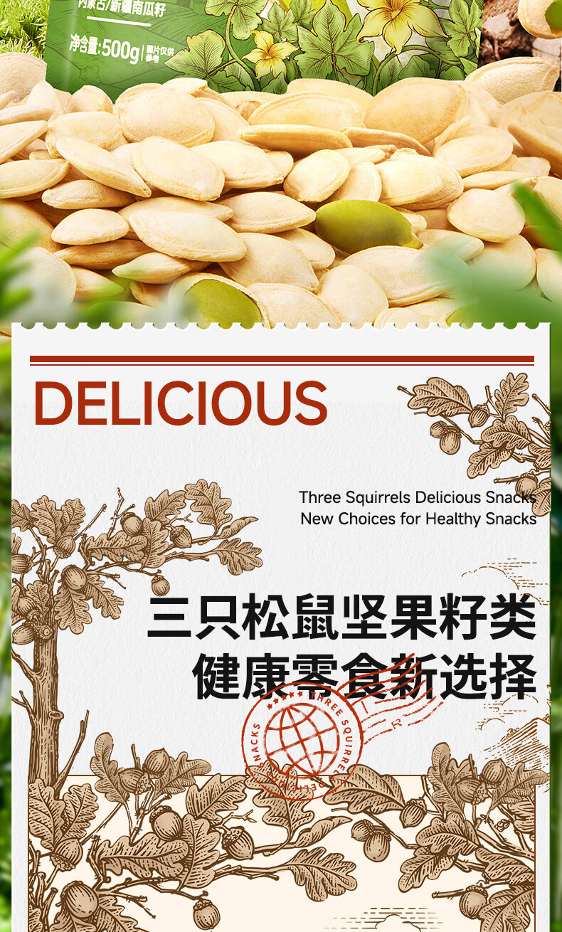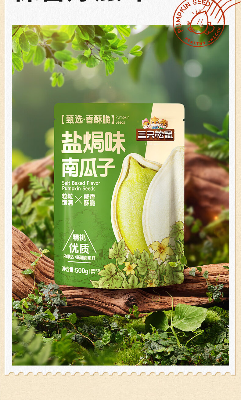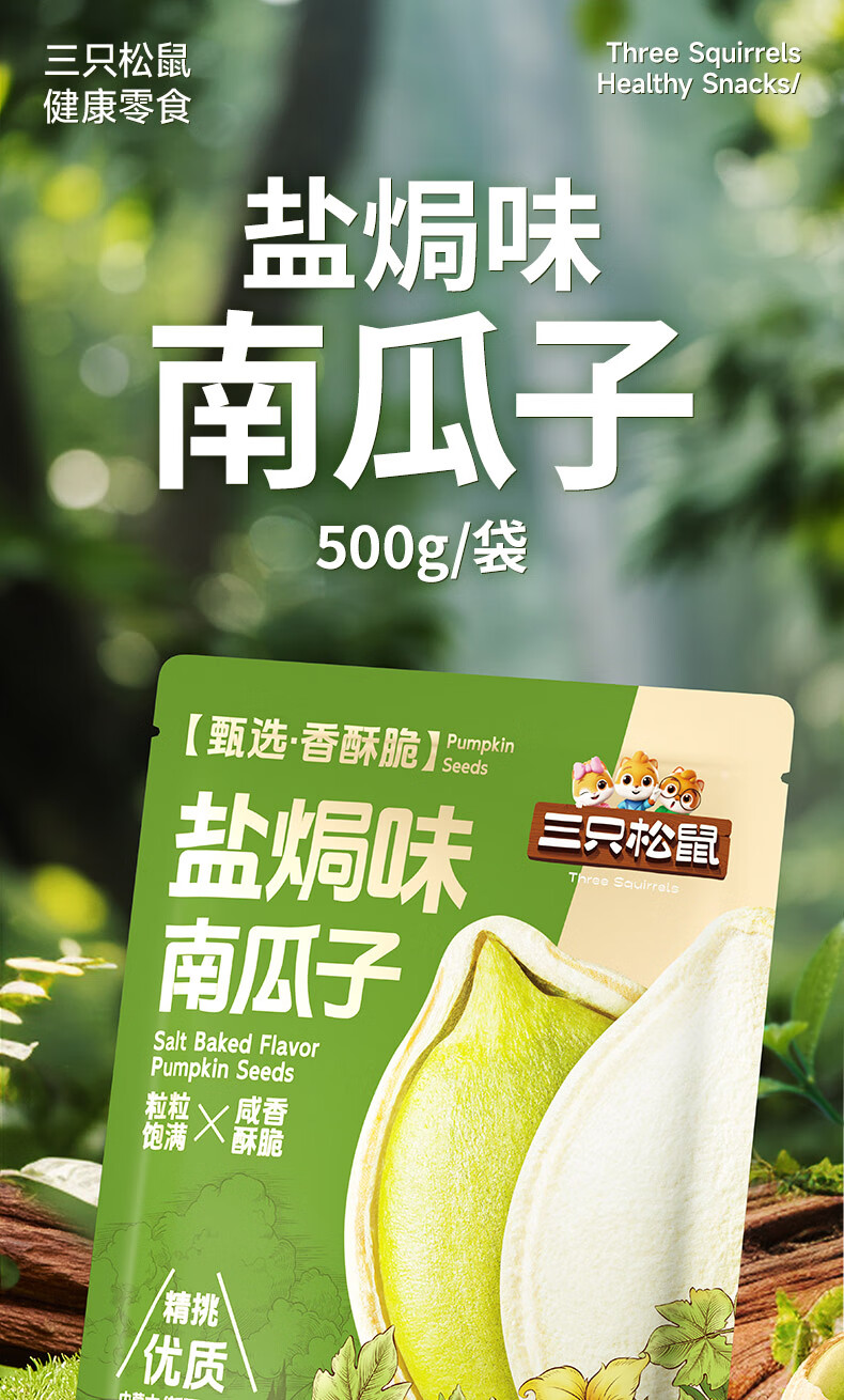 三只松鼠盐焗味南瓜子500g/袋 新疆内蒙南瓜籽炒货独立小包装新年年货零食