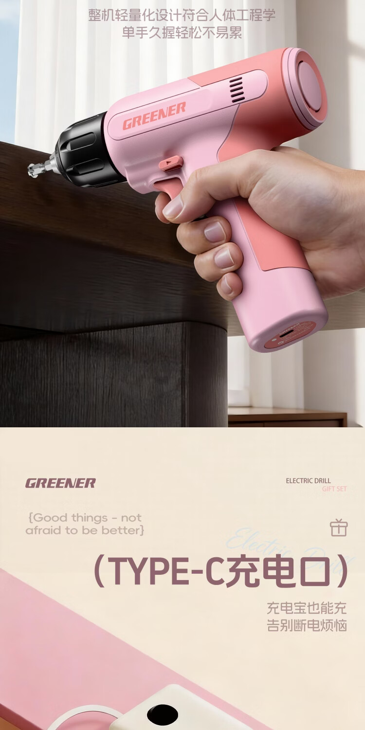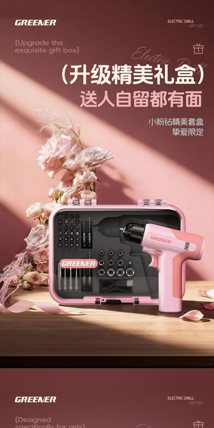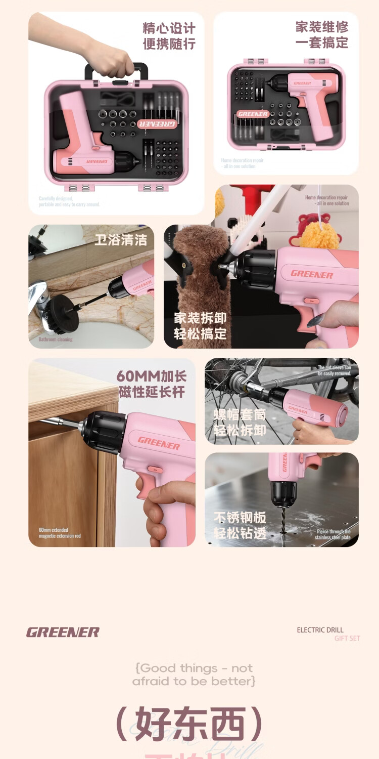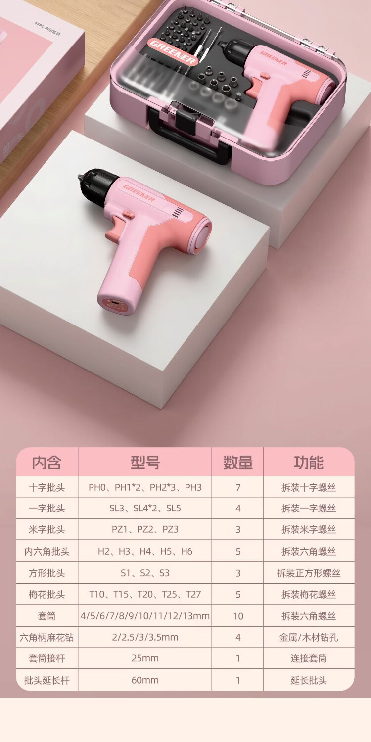 绿林电钻小粉钻手电钻女生粉家用小型手枪钻锂电充电多功能拧螺丝 44件粉钻礼盒-女神专属&搞定拆装