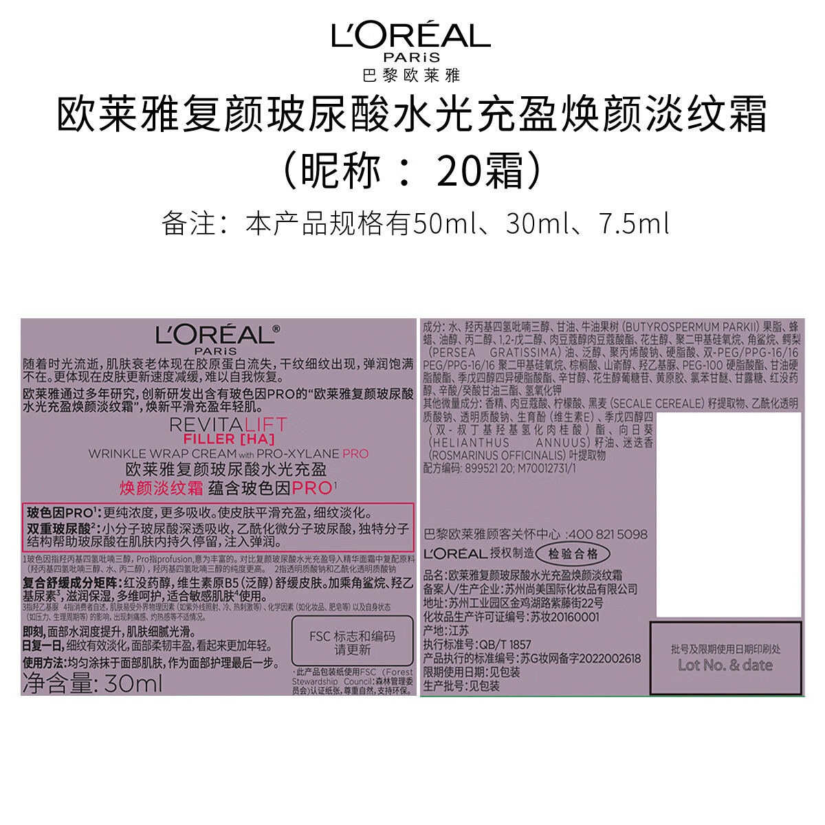 欧莱雅[徐明浩推荐]20霜30ml抗皱紧致面霜补水玻色因护肤品圣诞礼物