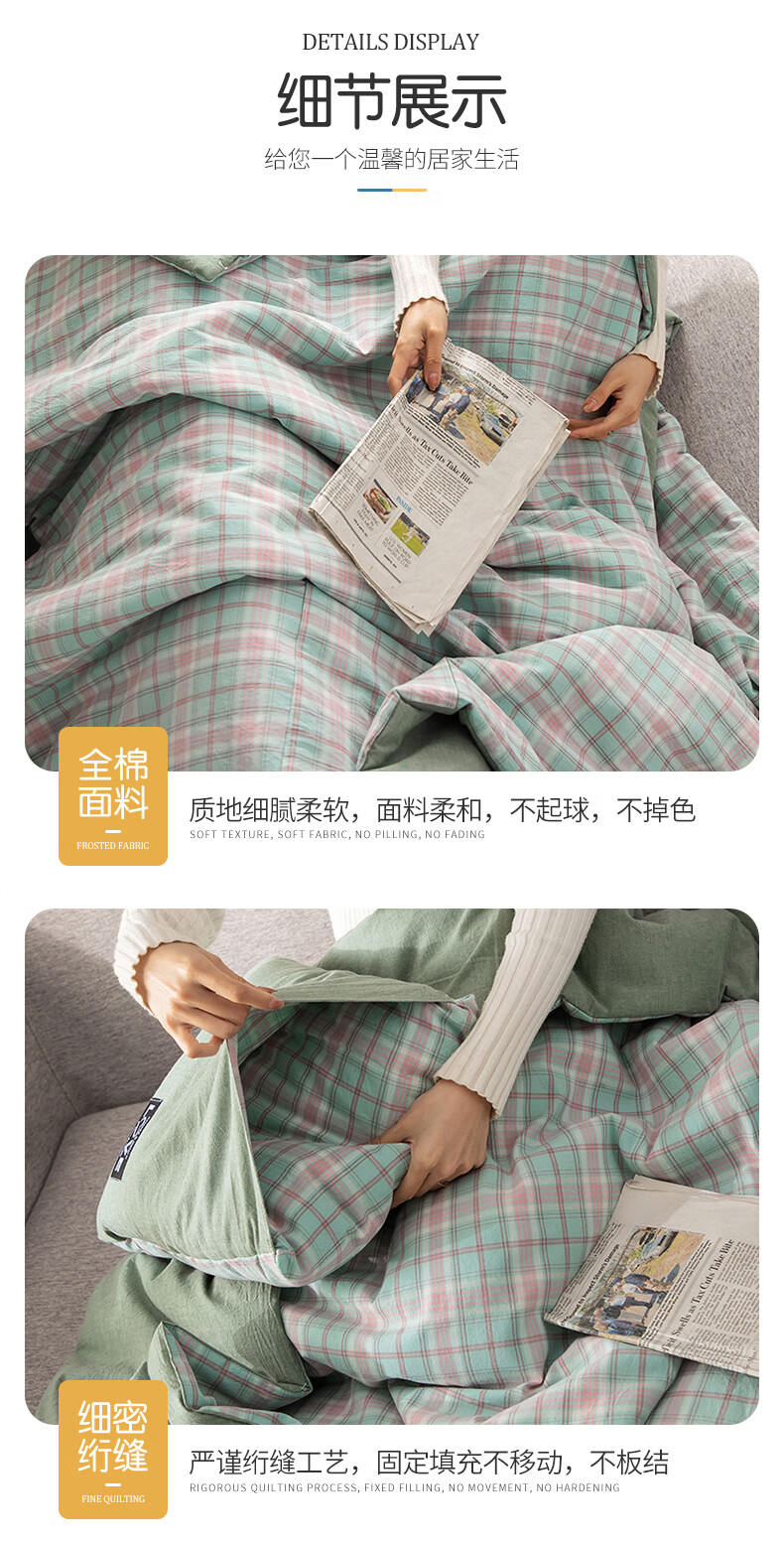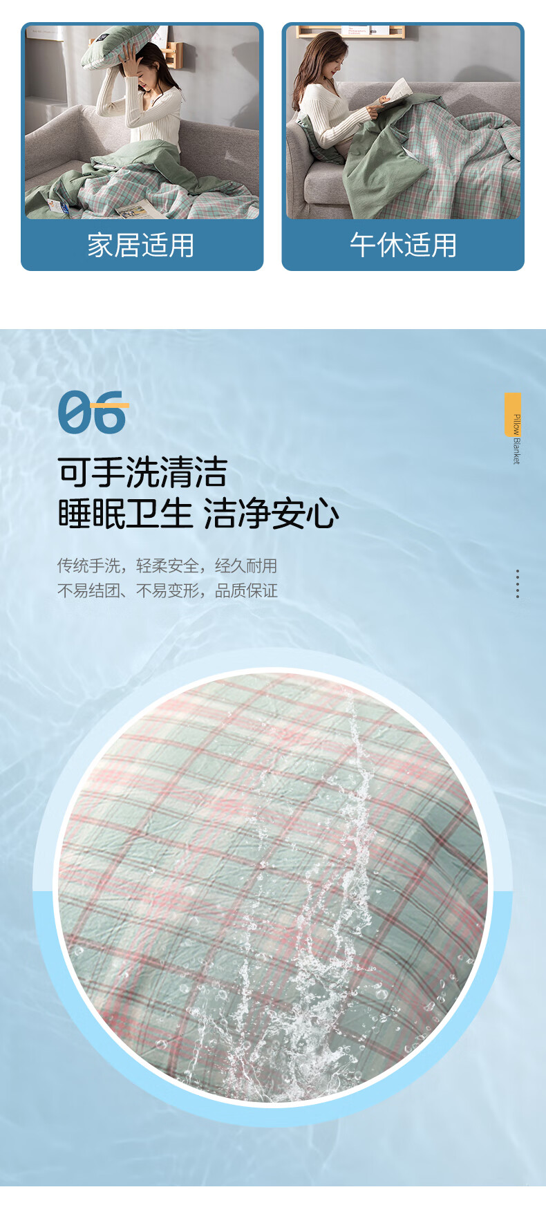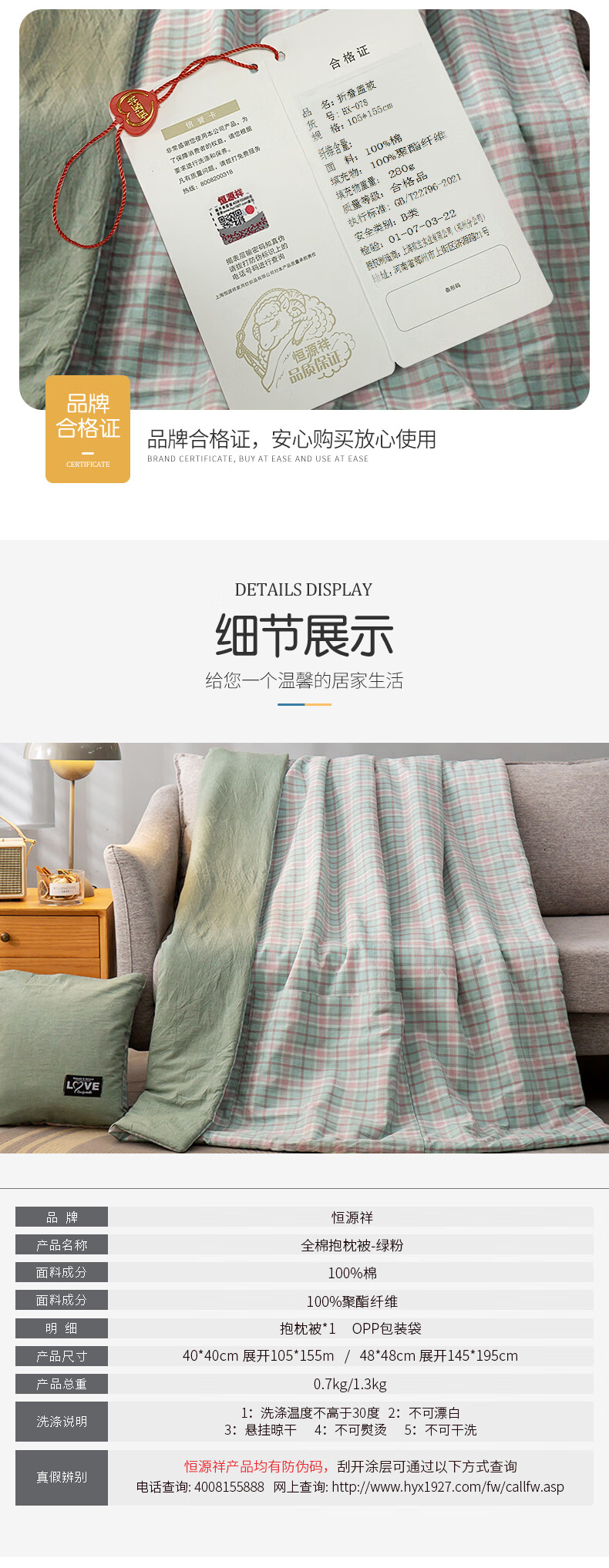恒源祥抱枕被子两用全棉可水洗简约风午休抱枕毯子家用汽车通用午睡神器 绿粉 48*48cm展开145*195cm