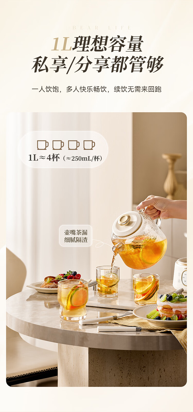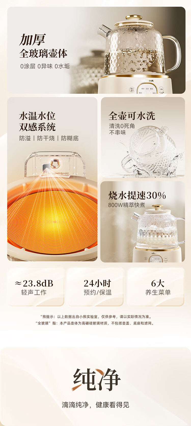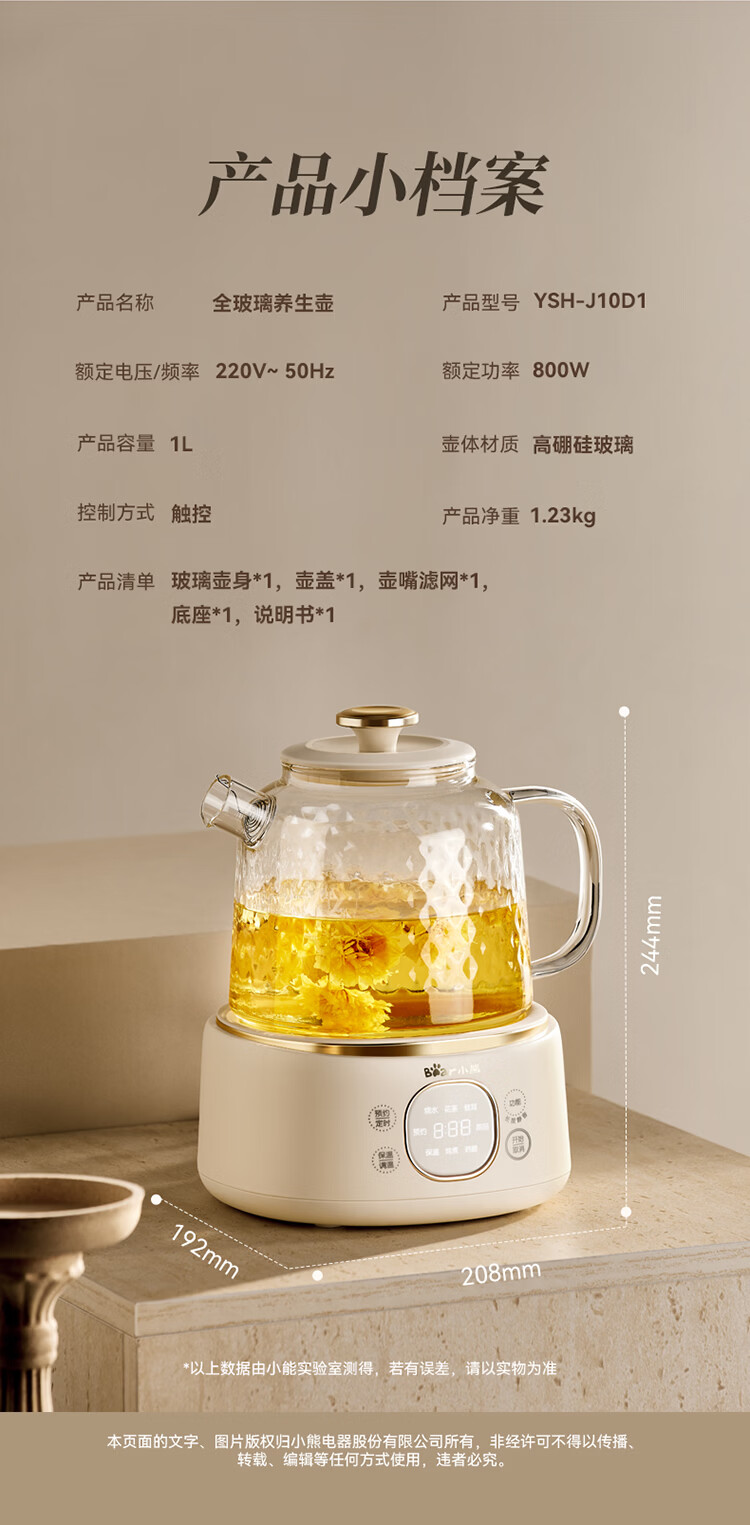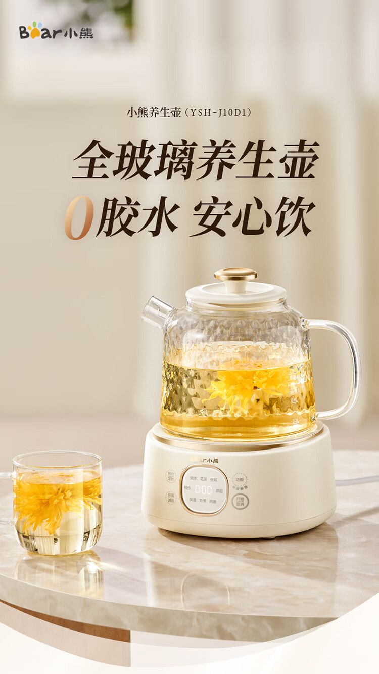 小熊(Bear)全玻璃养生壶 纯玻璃多功能恒温壶 办公室轻音炖煮花茶 1L YSH-J10D1