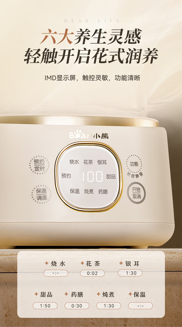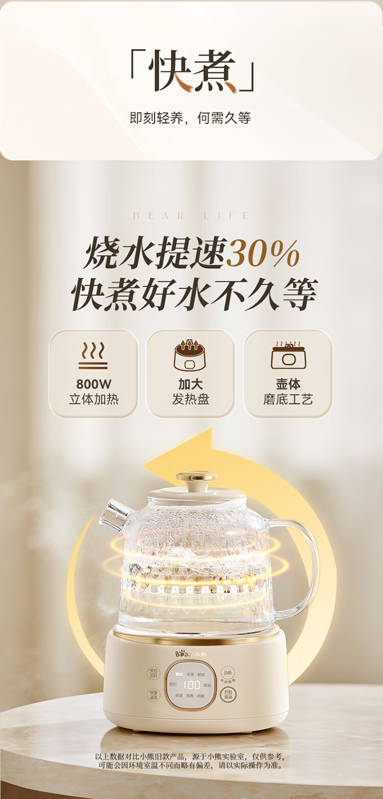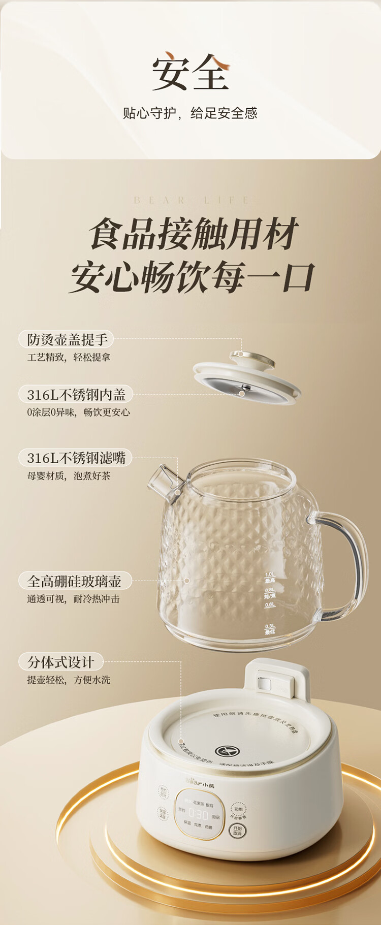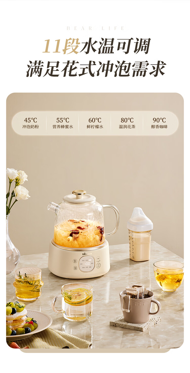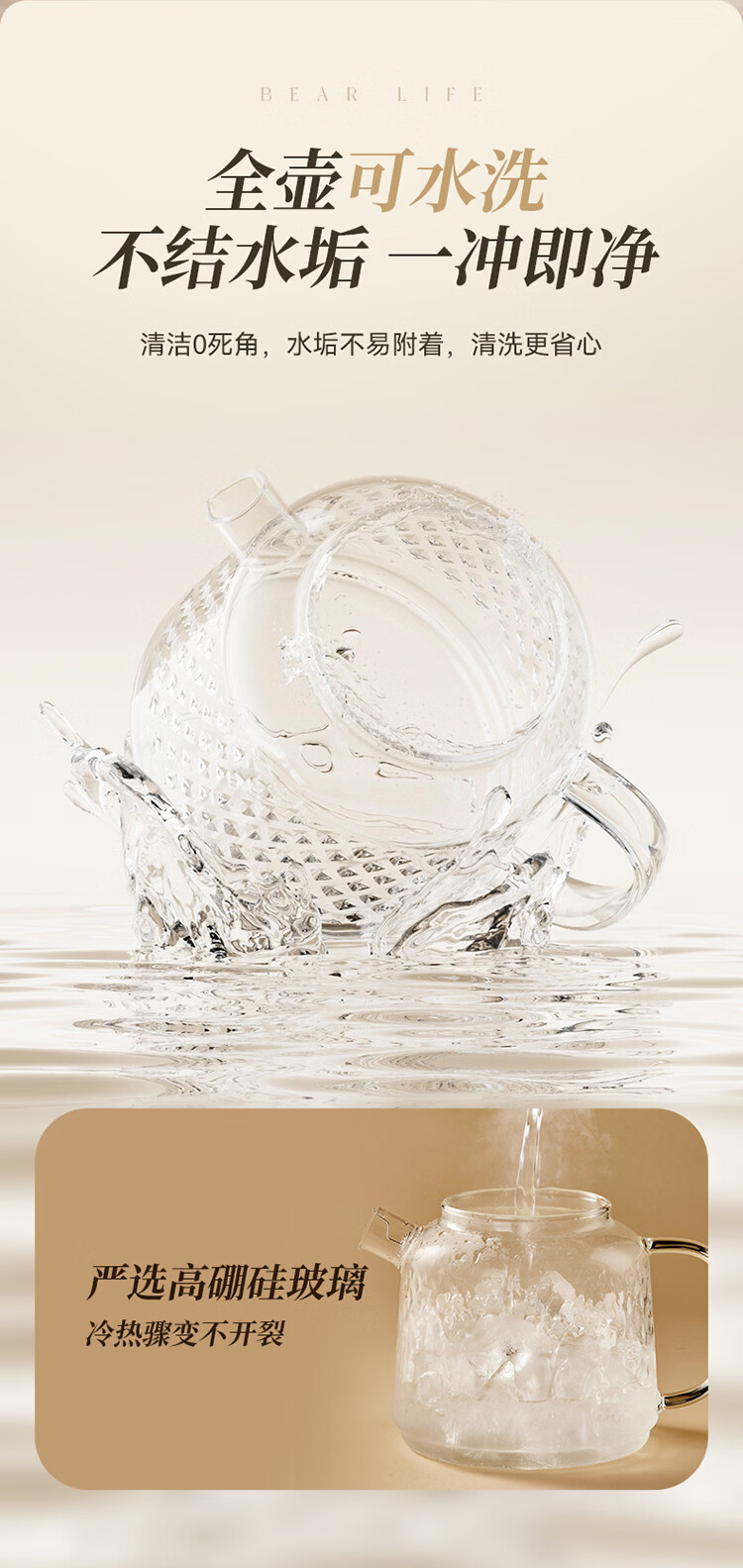 小熊(Bear)全玻璃养生壶 纯玻璃多功能恒温壶 办公室轻音炖煮花茶 1L YSH-J10D1