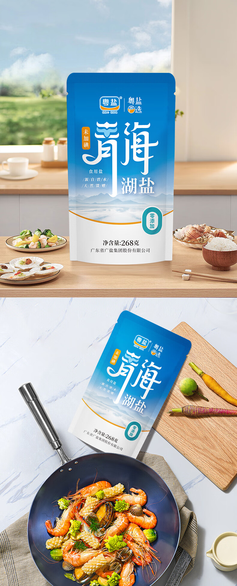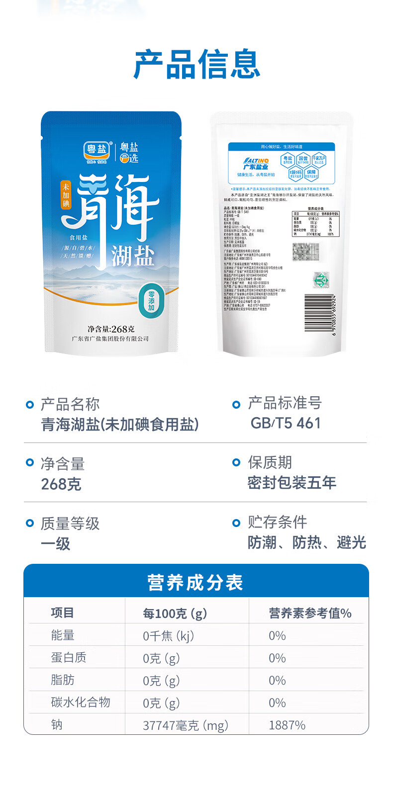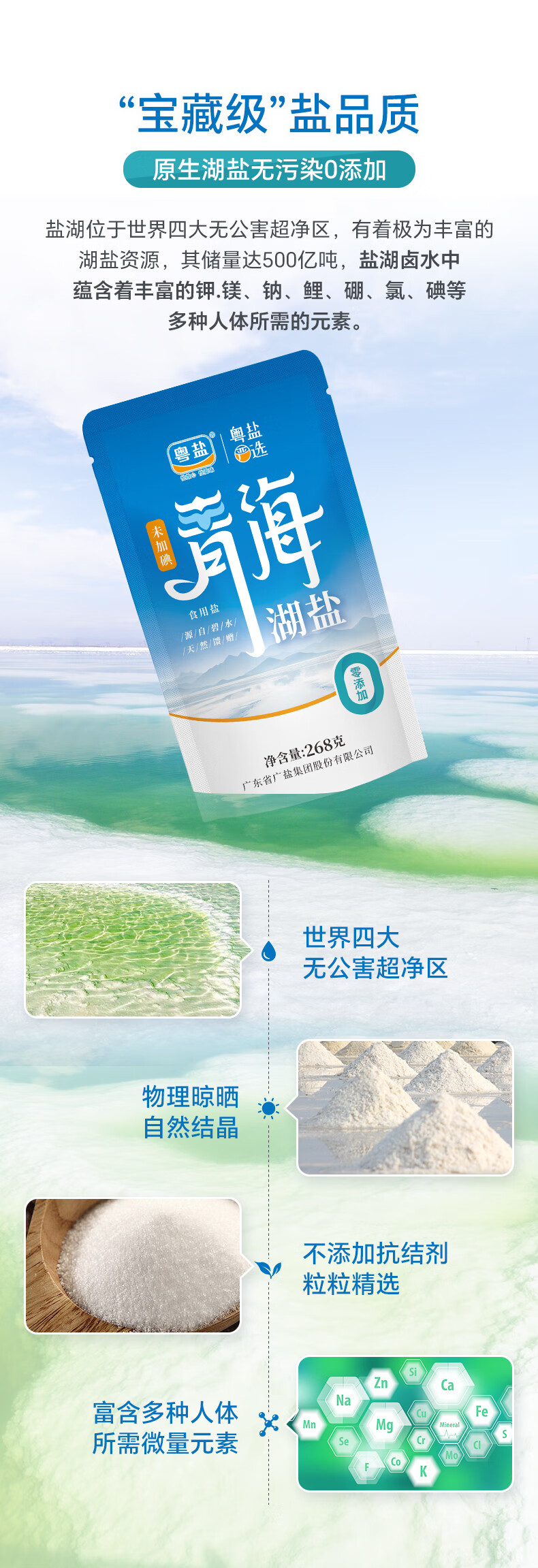 粤盐青海湖盐268g*5袋 无碘盐 食用盐无抗结剂0添加 察尔汗天然湖盐