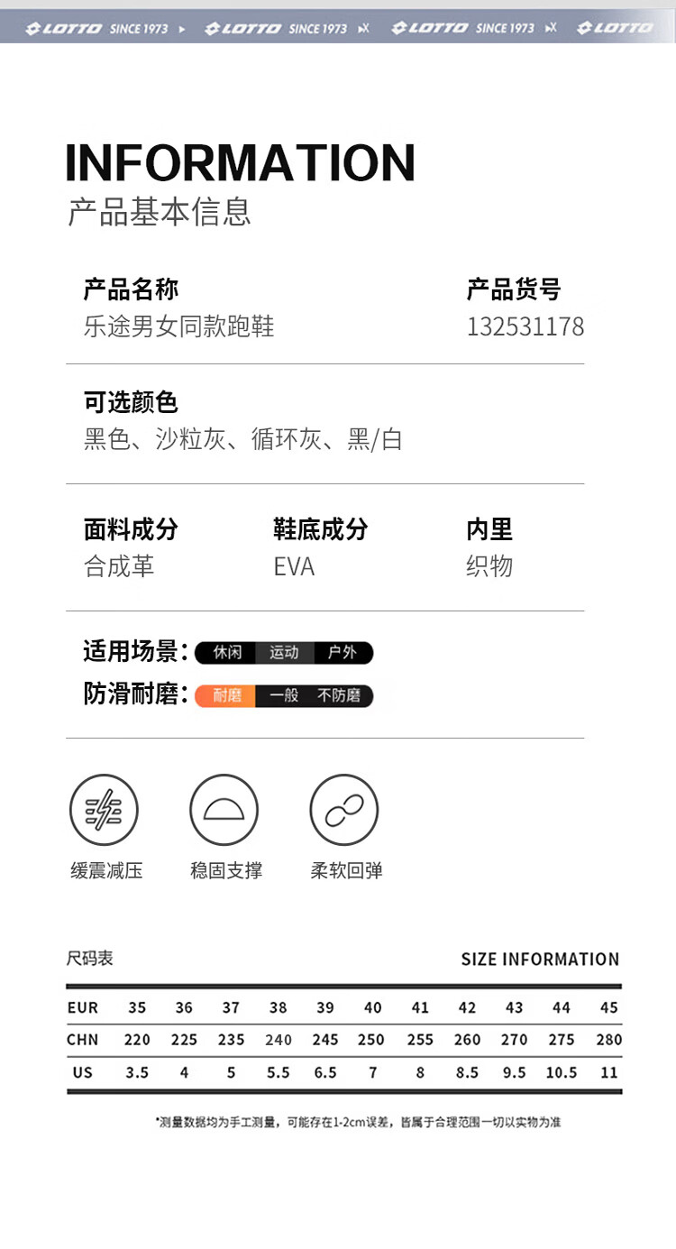 乐途(LOTTO)跑步鞋男女同款运动鞋防滑耐磨减震透气春秋户外休闲鞋 黑色【1178】 42