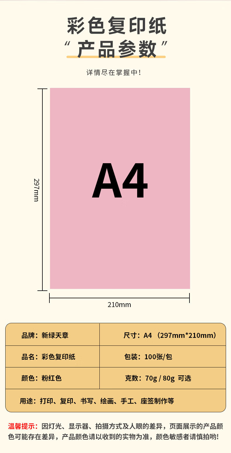 天章 (TANGO)新绿天章A4彩色复印纸 粉红色打印纸薄卡纸 图文凭证打印纸 学生折剪手工彩纸 浅粉色70g 100张/包