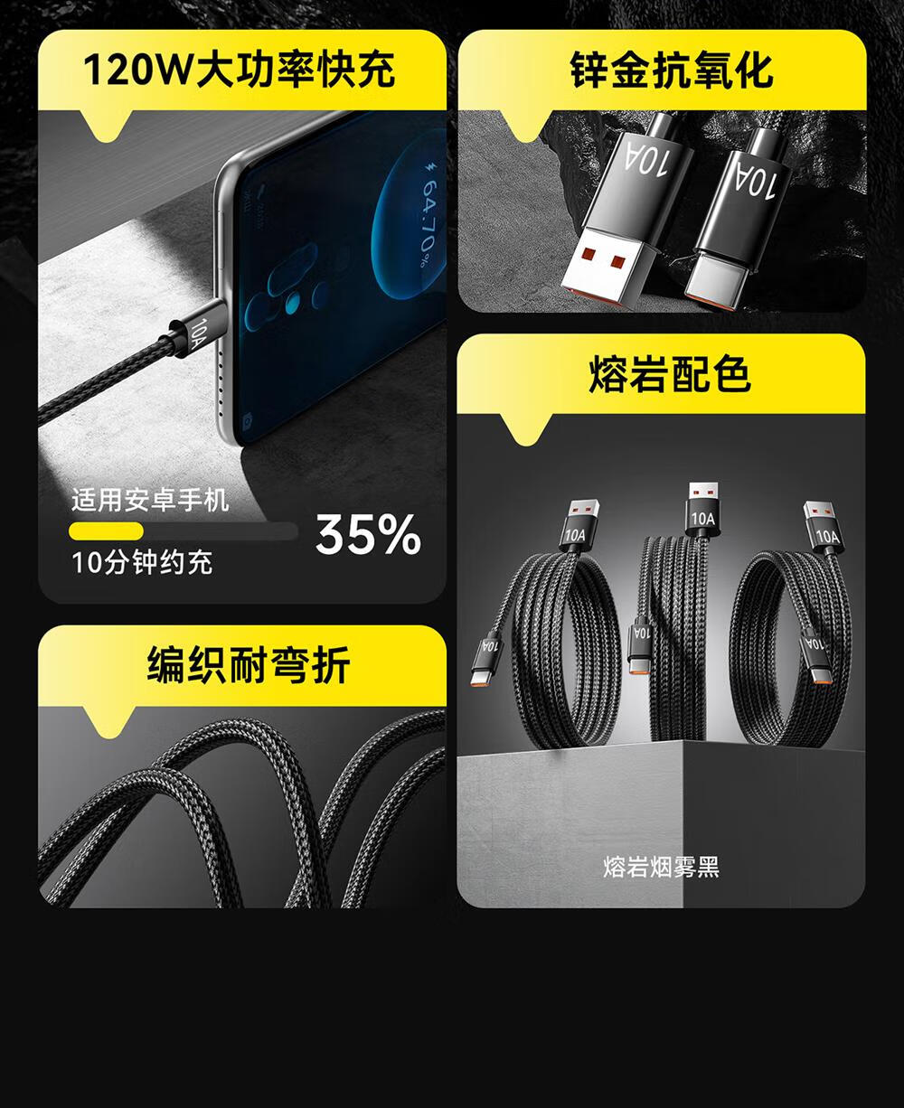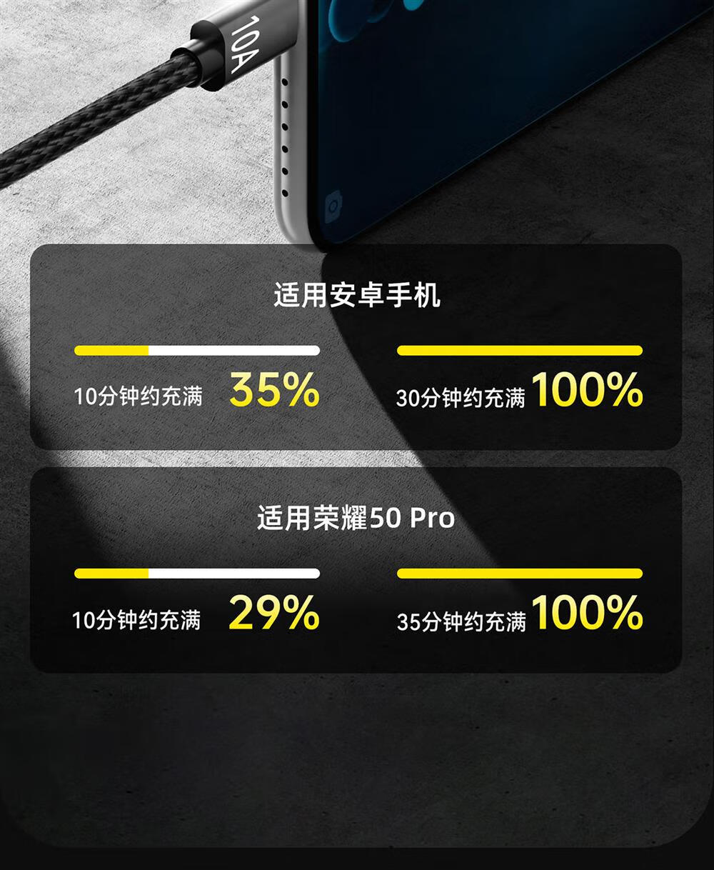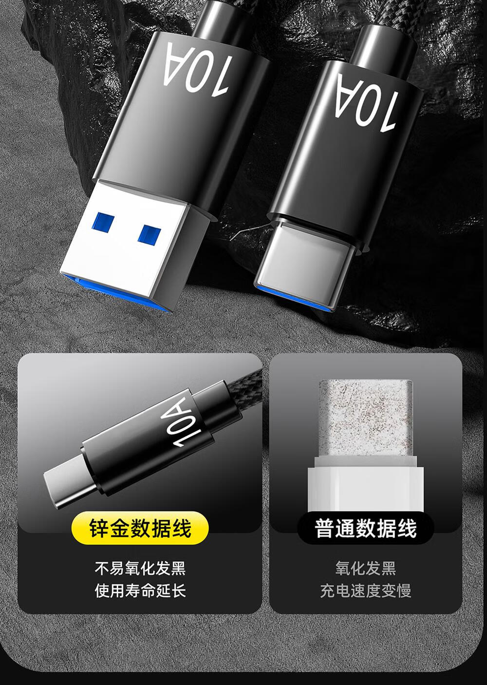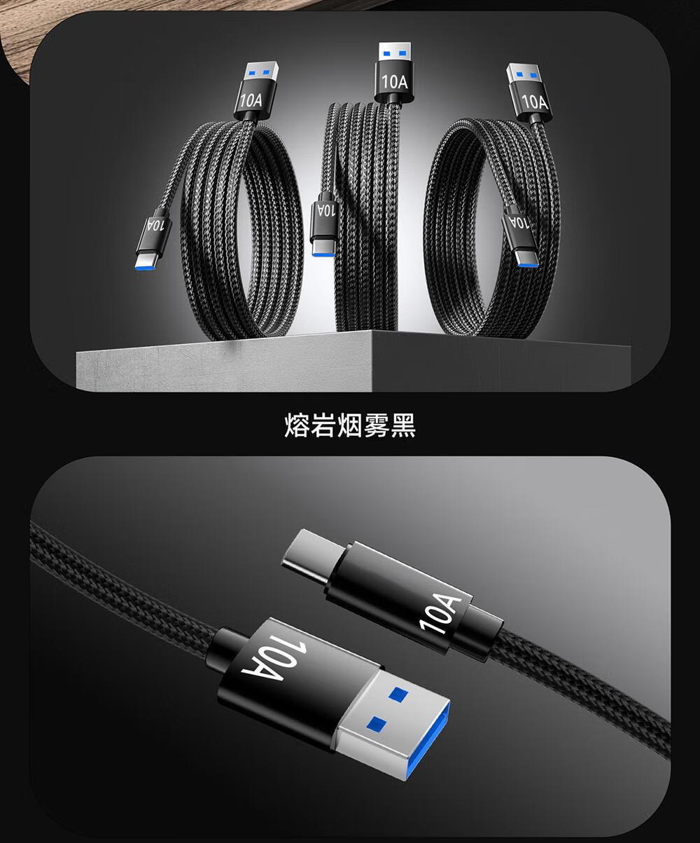 Type-C手机数据线10A快充适用华为荣耀小米魅族VIVOPPO车载平板通用闪充电线 绅士黑【1条装】 2米
