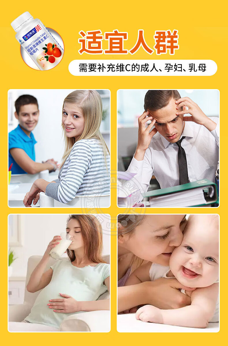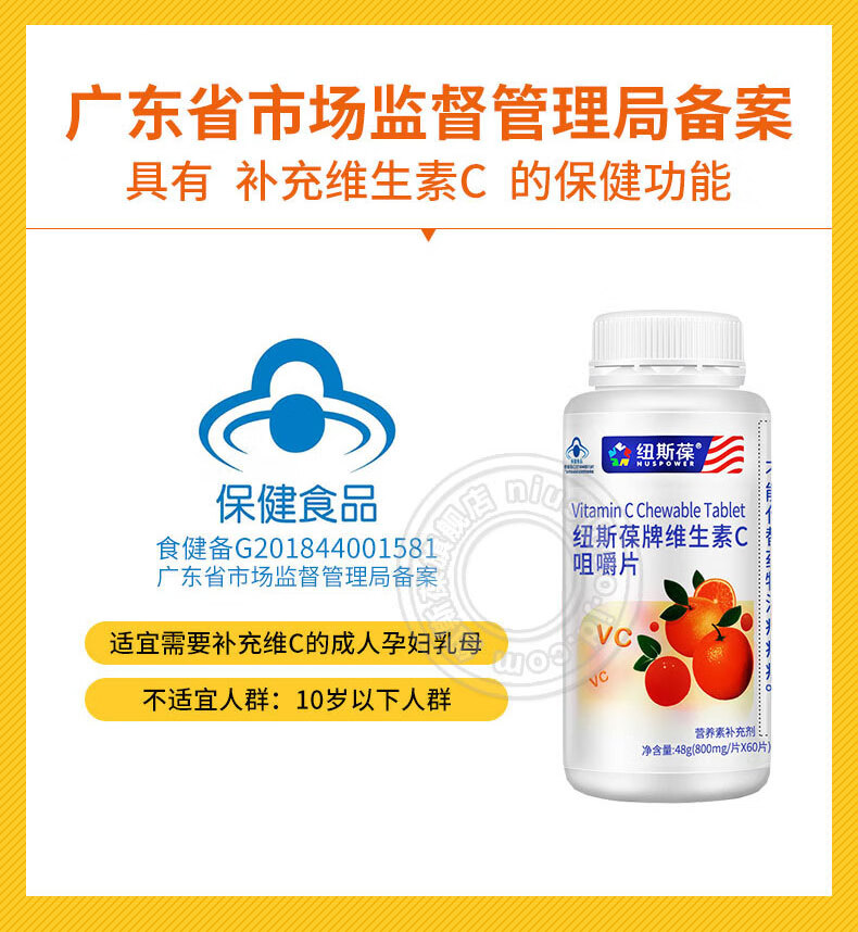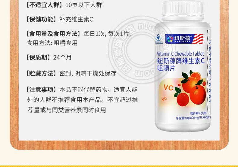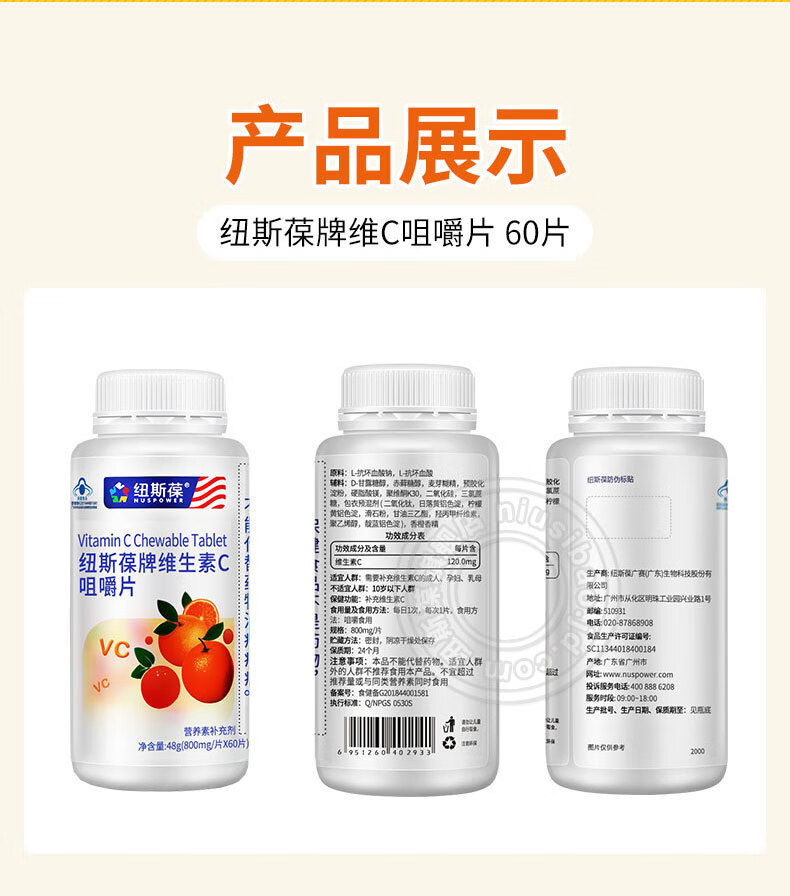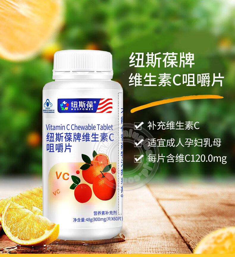 纽斯葆牌维生素C咀嚼片 800mg/片 青少年成年人孕妇乳母补充VC 60片*2瓶【送B族3瓶*30片】