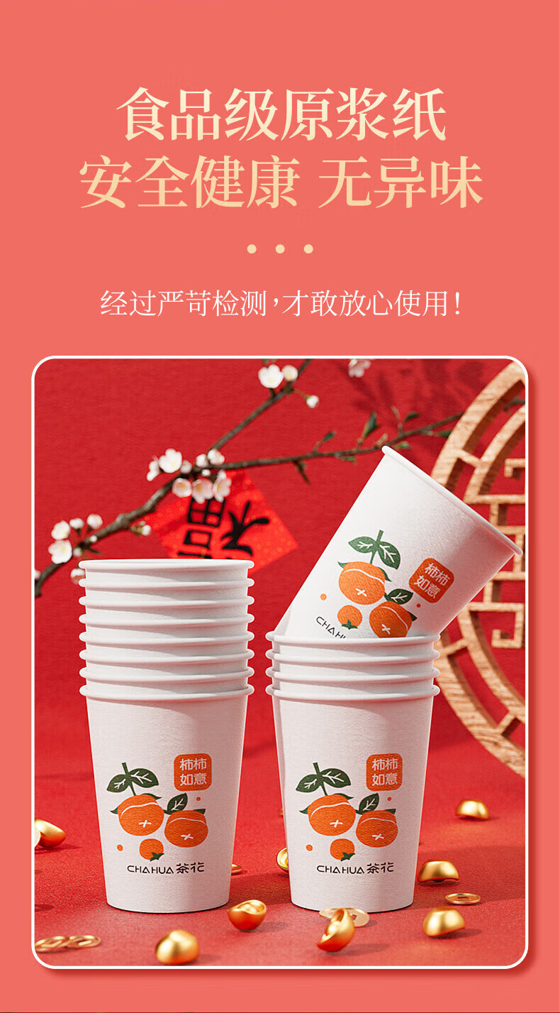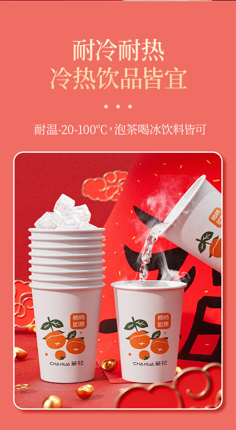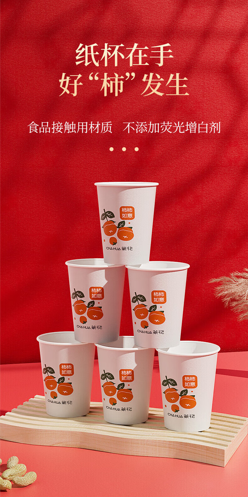 茶花(CHAHUA)一次性加厚纸杯柿柿如意咖啡杯奶茶杯饮料杯新年过年节庆包装 柿柿如意 100只 单只218ML