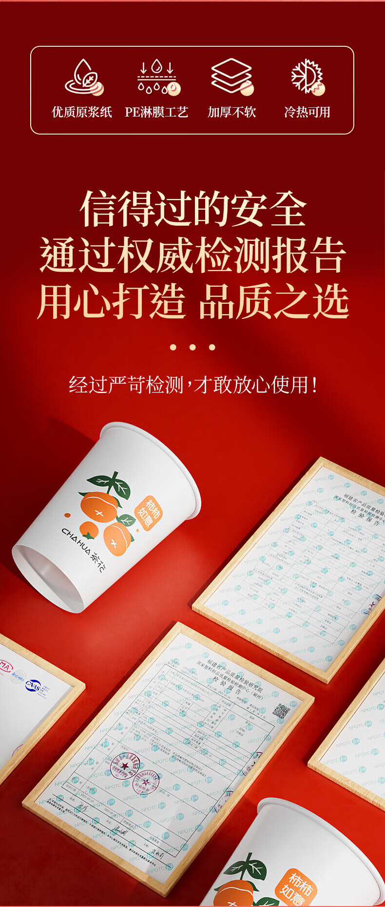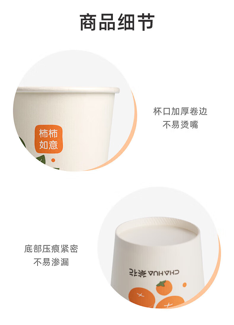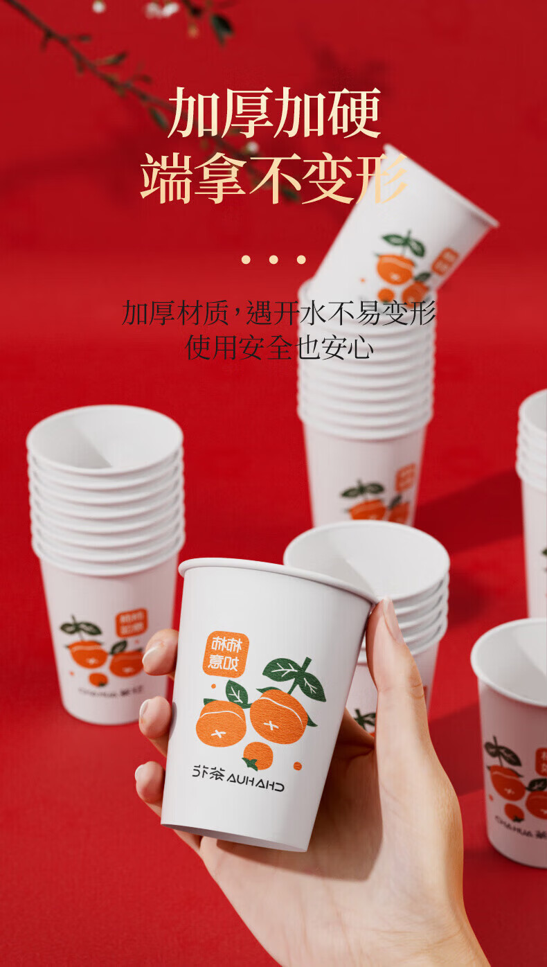 茶花(CHAHUA)一次性加厚纸杯柿柿如意咖啡杯奶茶杯饮料杯新年过年节庆包装 柿柿如意 100只 单只218ML