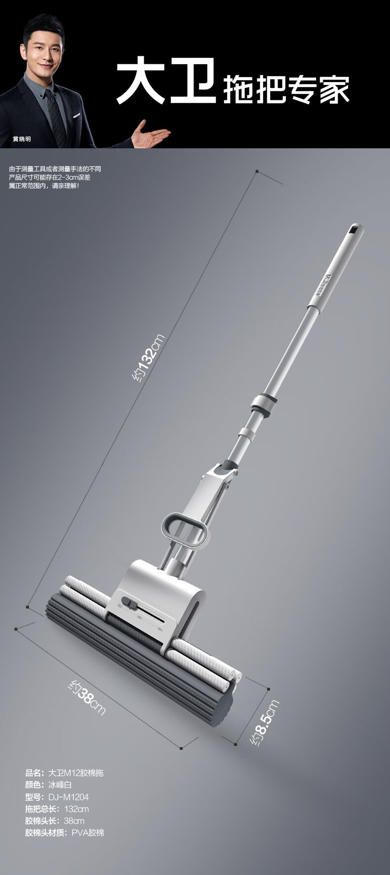 大卫胶棉拖把38cm海绵头杆长132cm2头M12巨无霸滚轮式大号胶棉拖