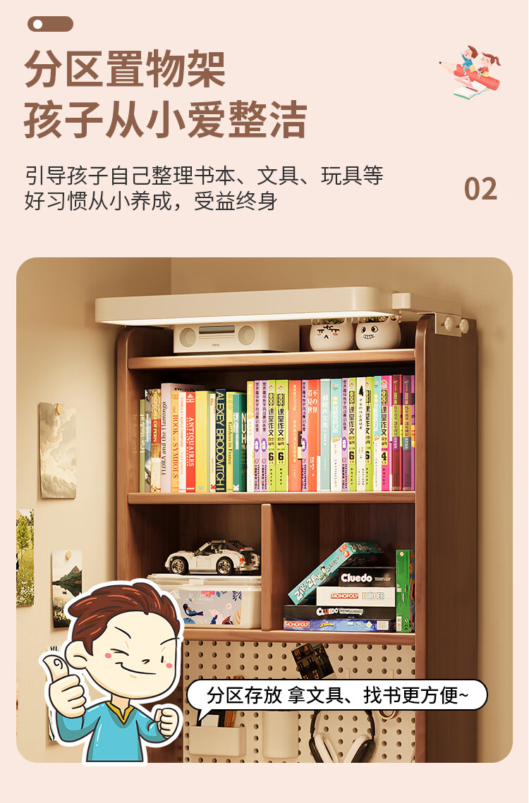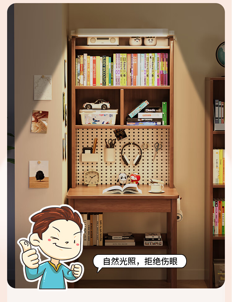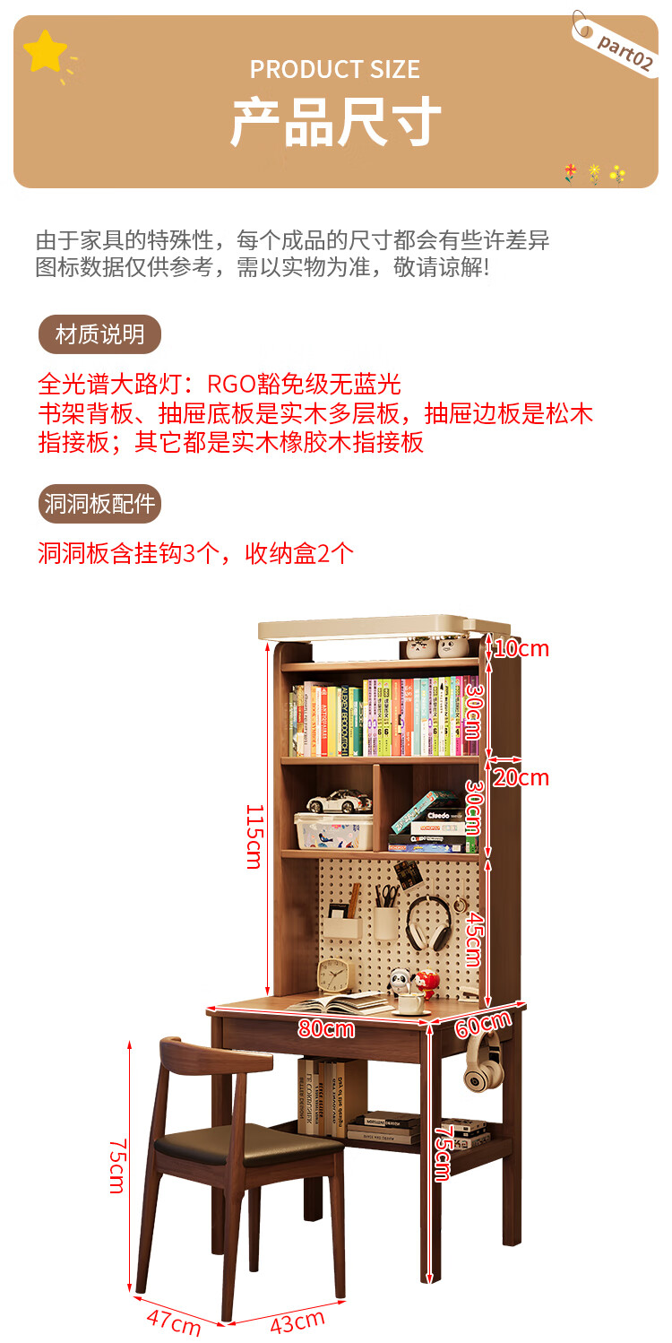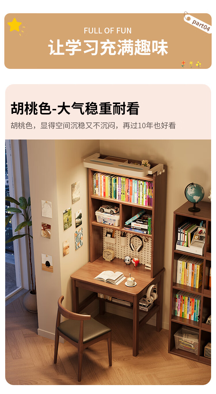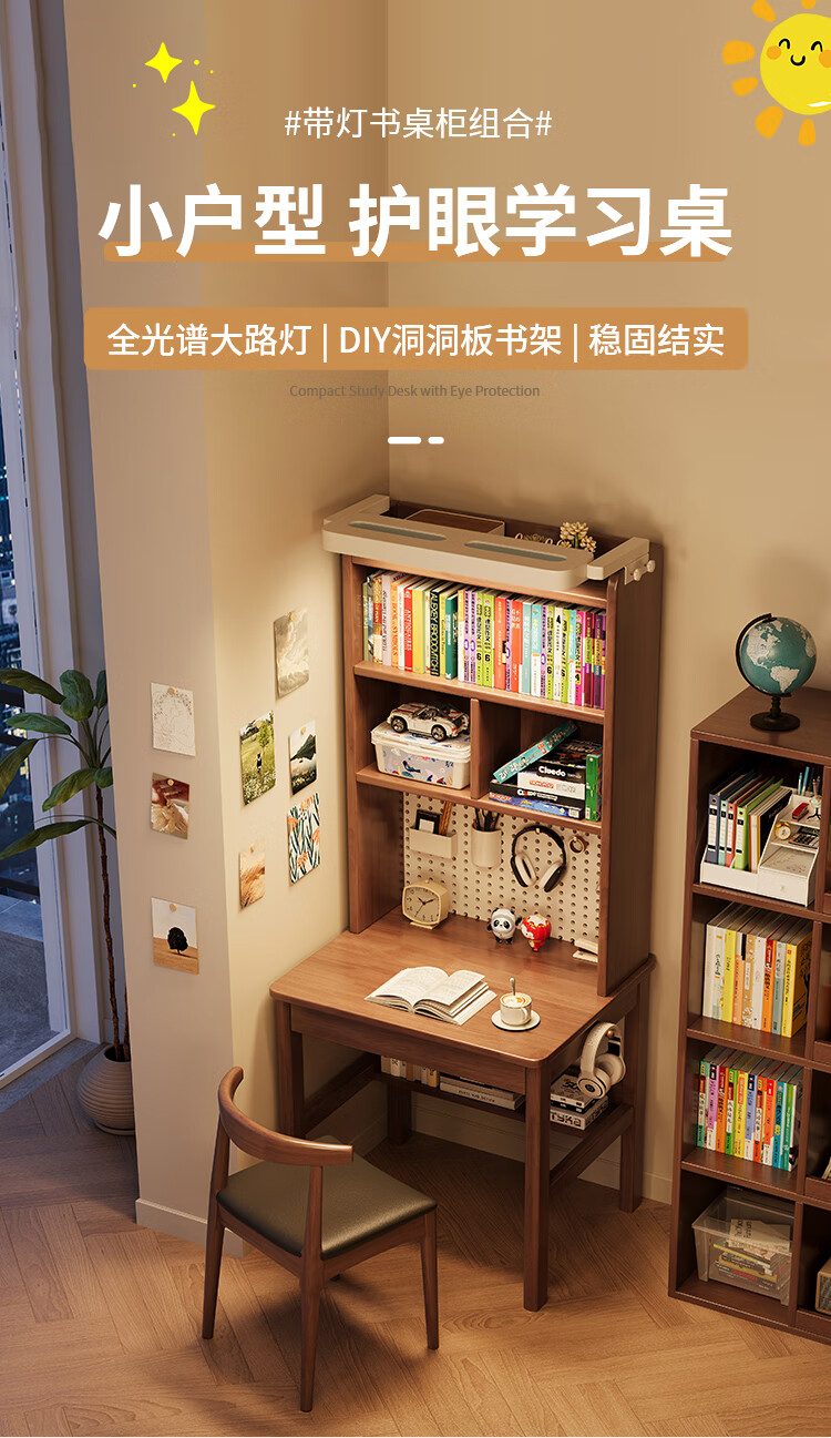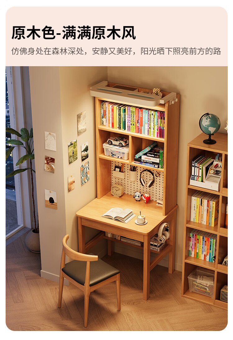 芈迪实木书桌书架一体学生家用带灯学习桌电脑桌小户型卧室儿童写字桌 黑胡桃色单桌+护眼灯【净味环保】 80*60*190cm