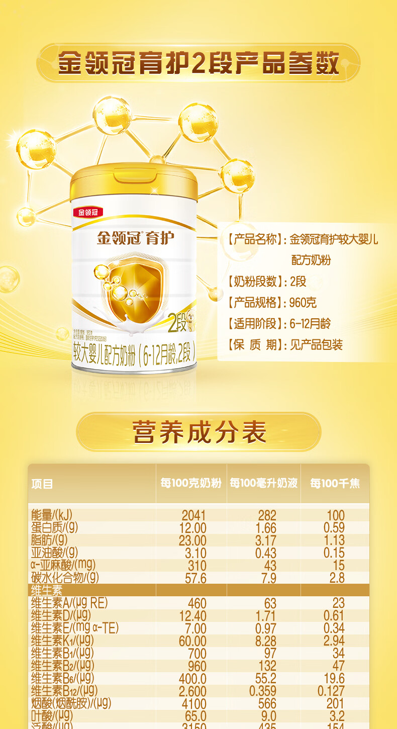 伊利金领冠育护2段960g新国标奶粉较大婴儿牛奶粉6-12个月宝宝适喝 【新客咨询送2小罐】2段960克