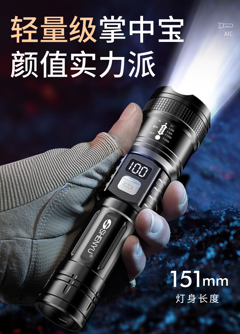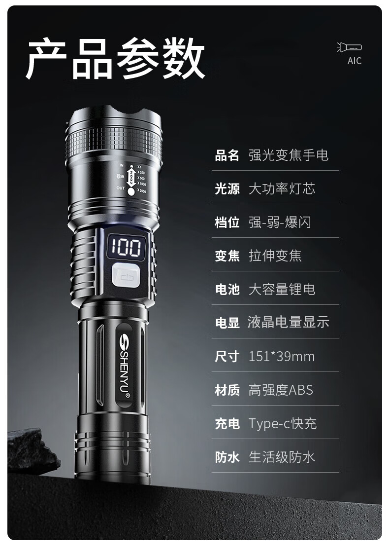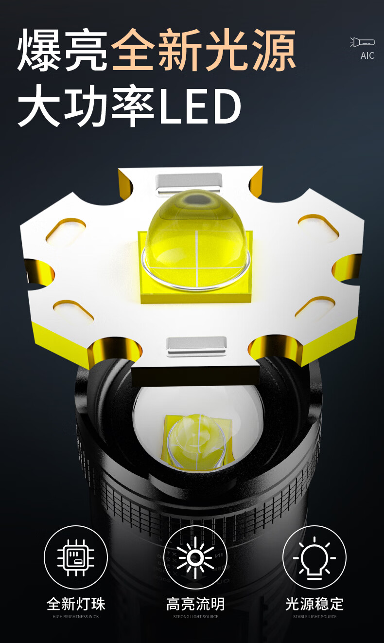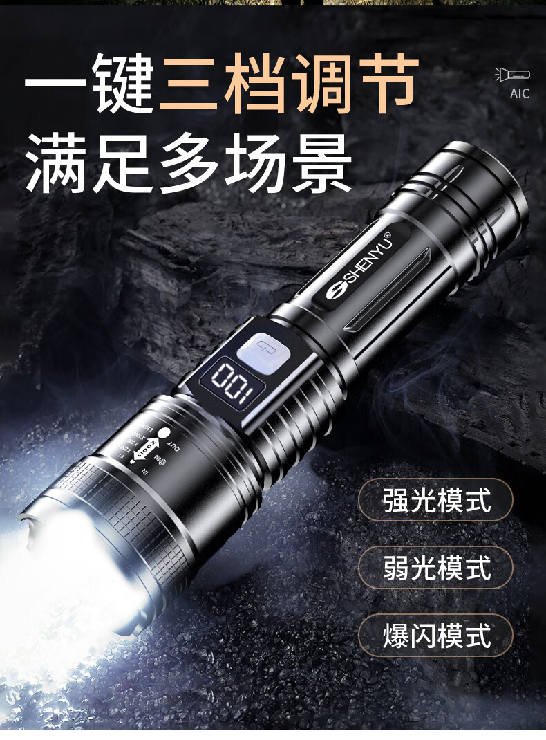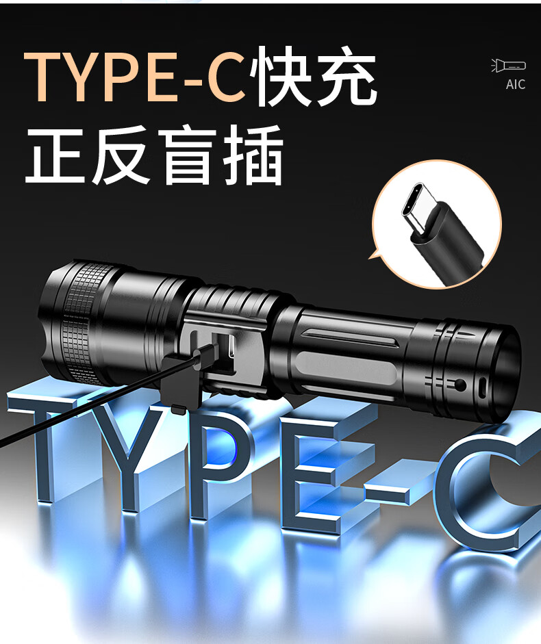 AicLED强光手电筒超亮变焦远射便携长续航家用户外应急照明可充电 三档调节/TYPE-C充电/智能电显