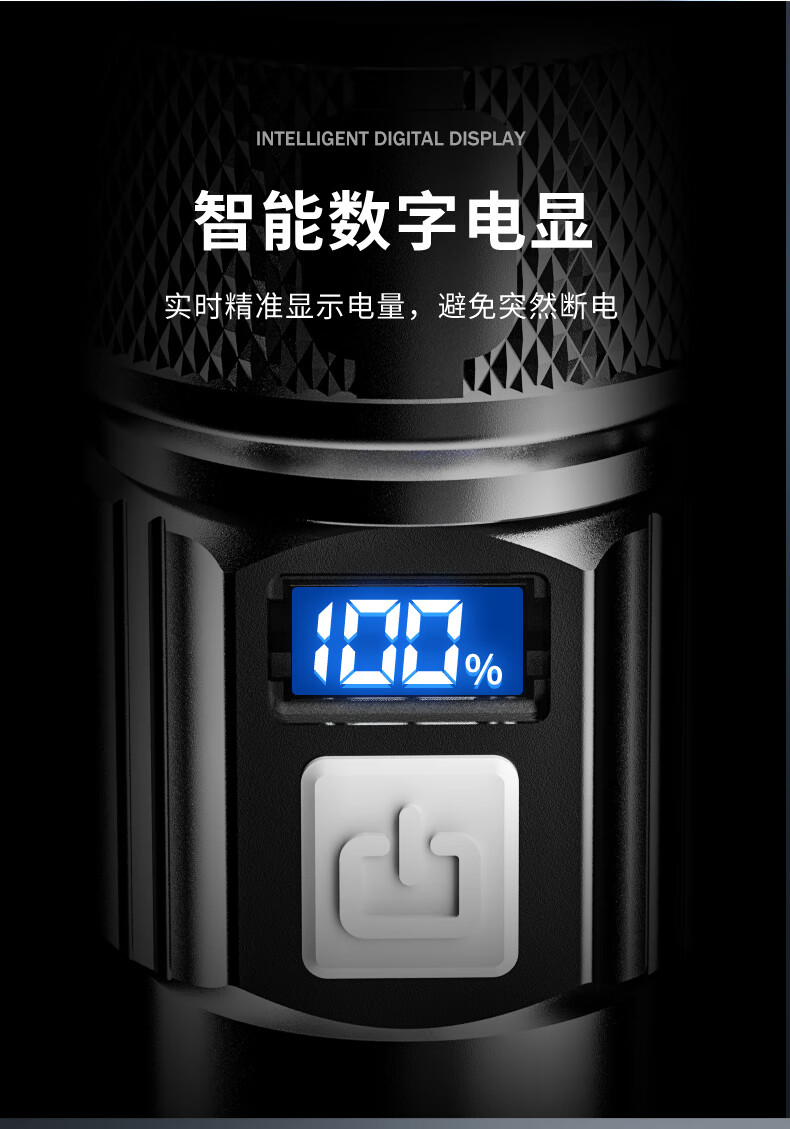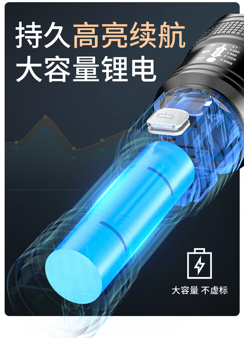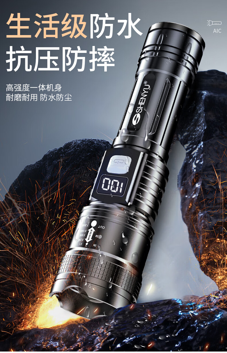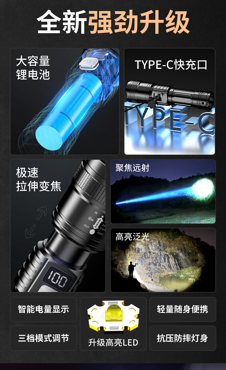 AicLED强光手电筒超亮变焦远射便携长续航家用户外应急照明可充电 三档调节/TYPE-C充电/智能电显