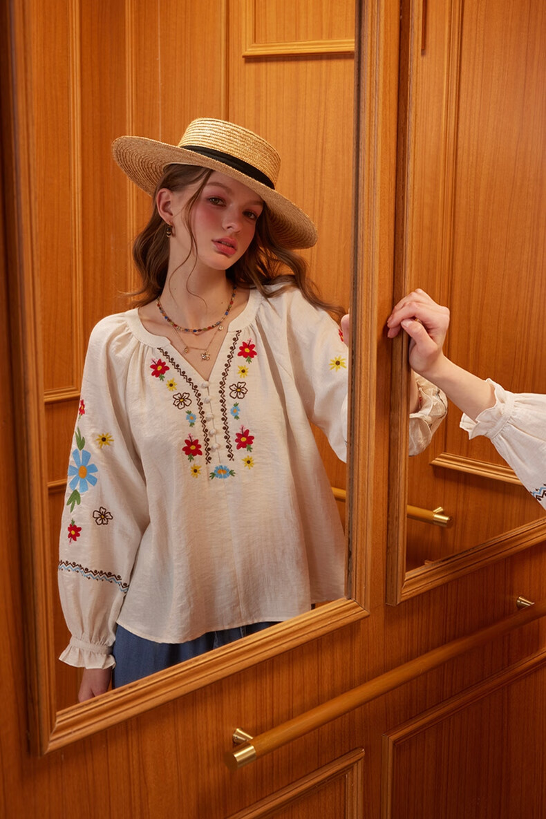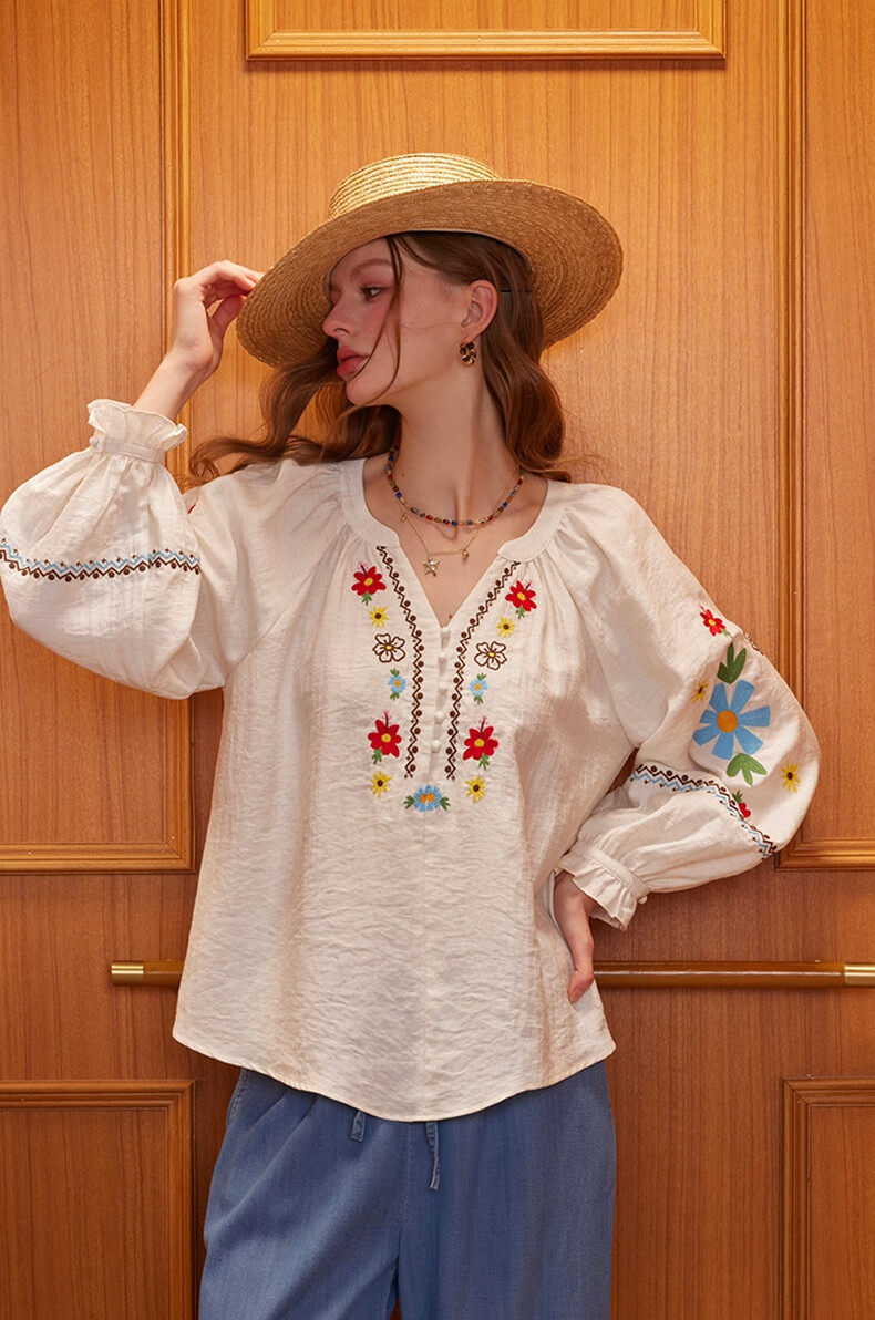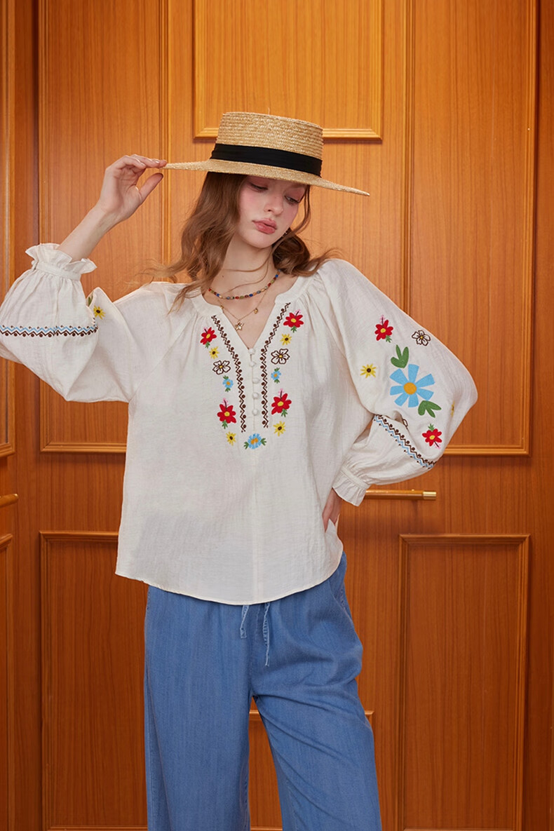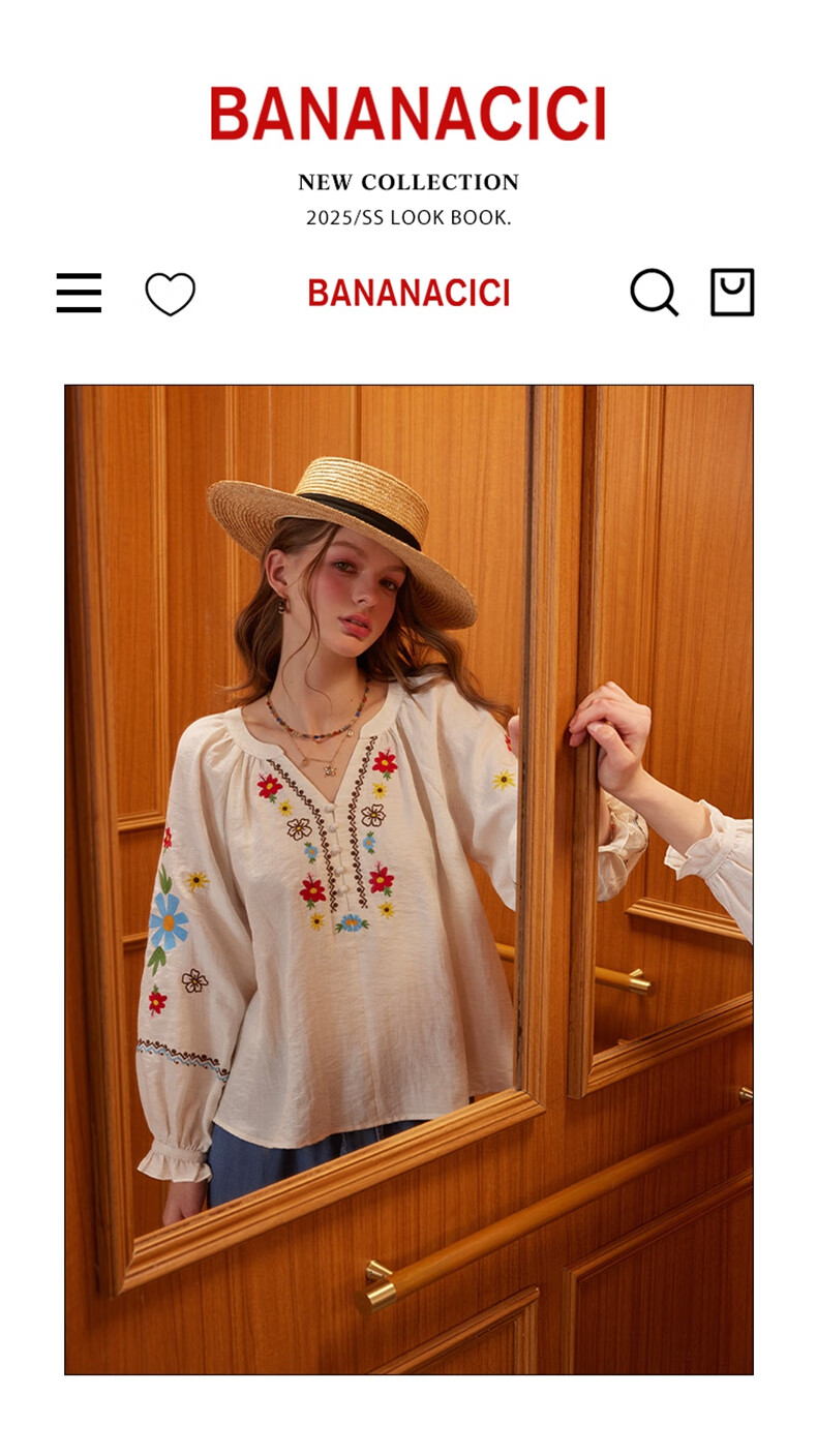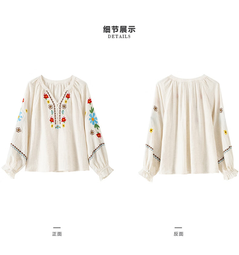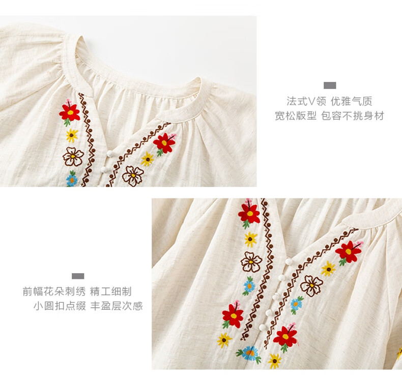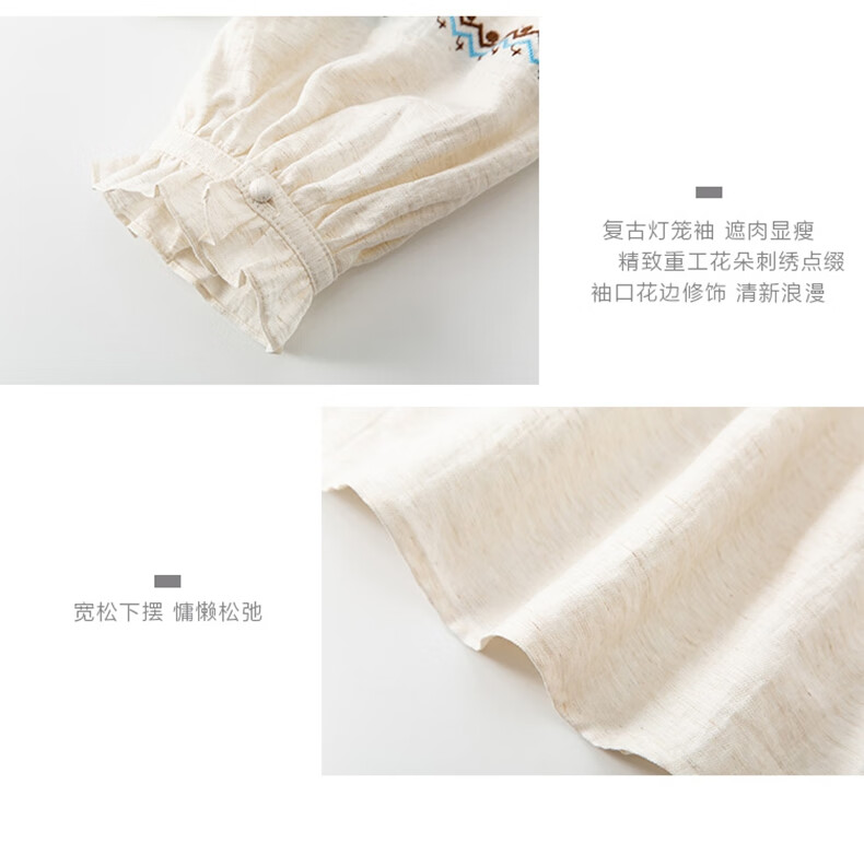 banana cici2025年春季新款民族风天丝亚麻重磅刺绣花朵刺绣衬衫C252CS627 米白 S