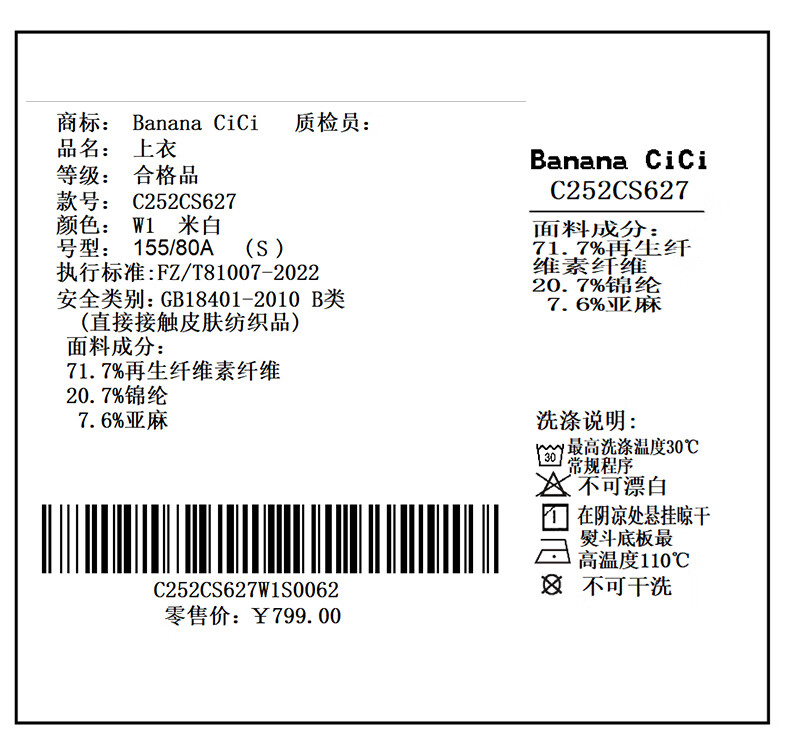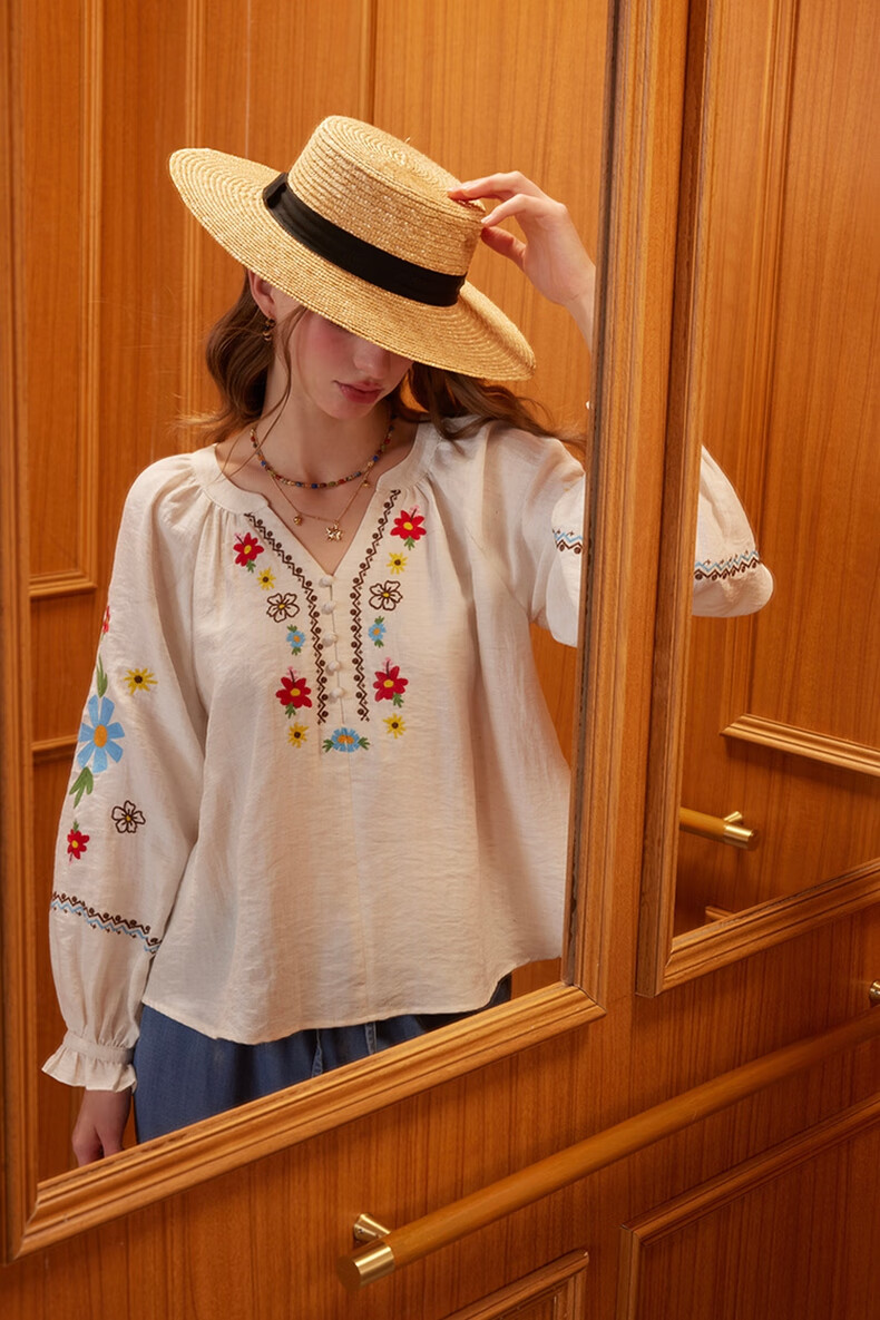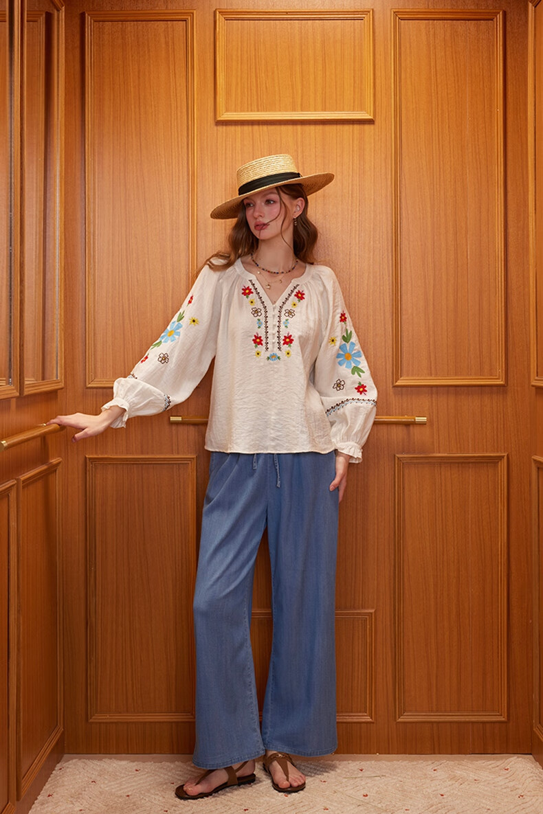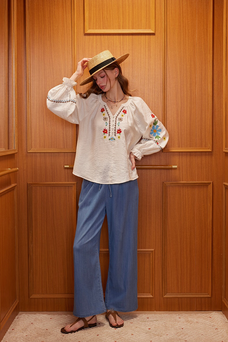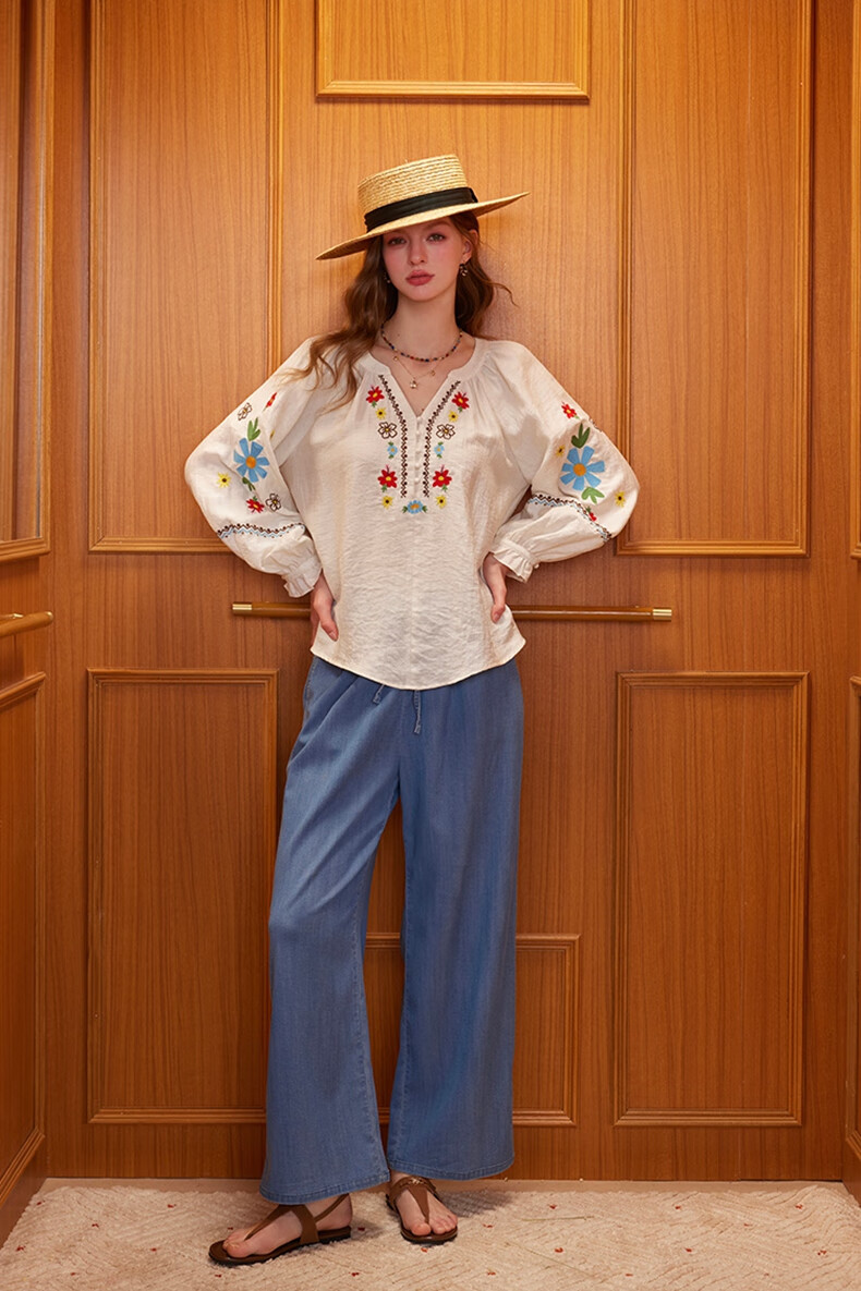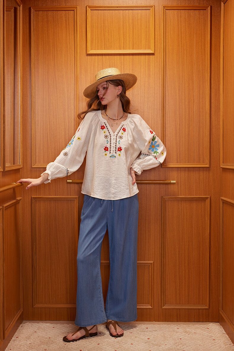 banana cici2025年春季新款民族风天丝亚麻重磅刺绣花朵刺绣衬衫C252CS627 米白 S