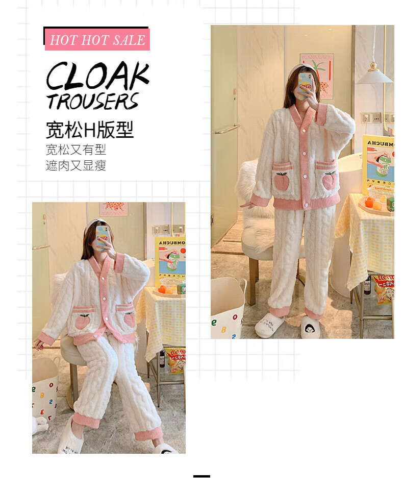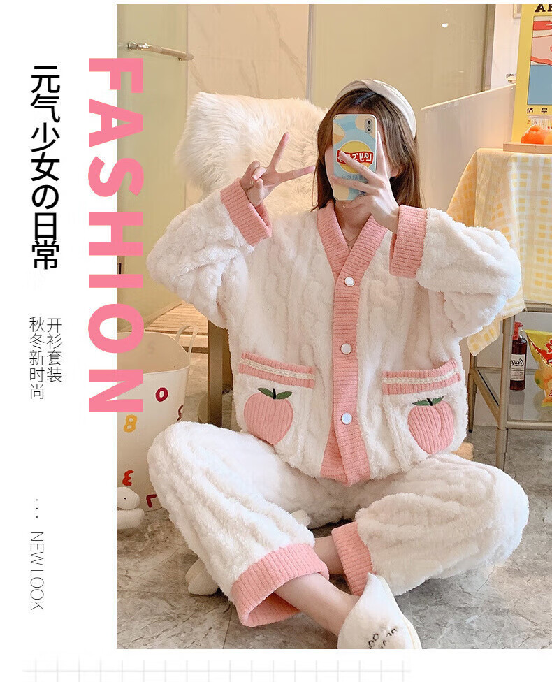 有只绵珊瑚绒睡衣两件套女士秋冬季加厚加绒保暖可爱毛绒宽松家居服套装 小香蝴蝶结-套装 L (建议90-120斤)