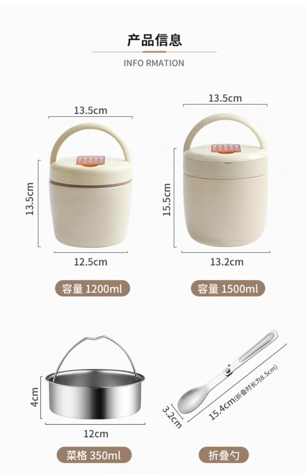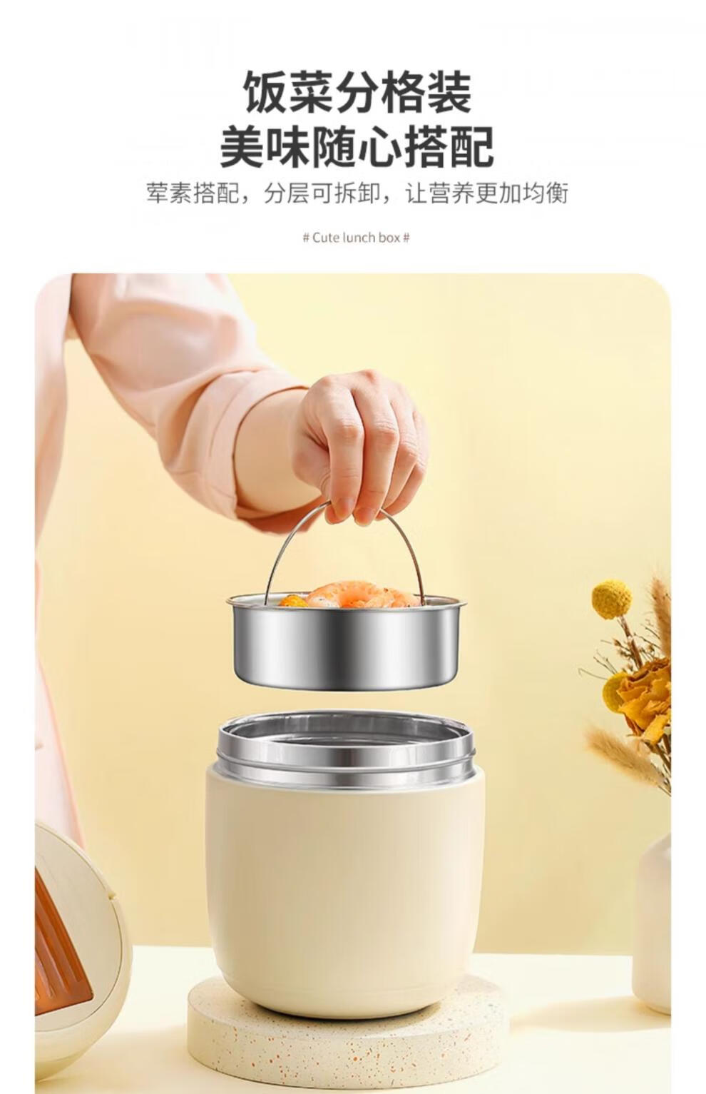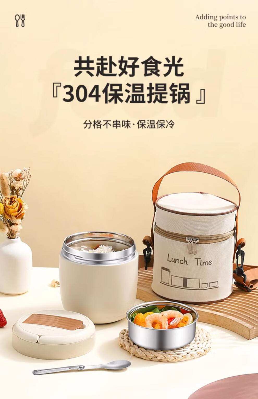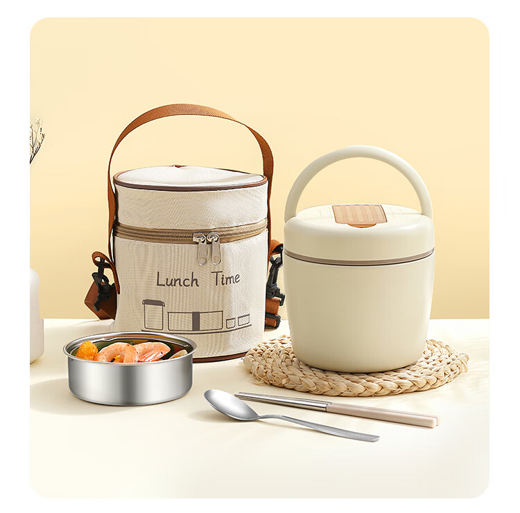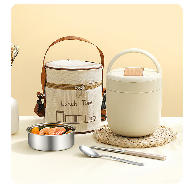 迦图鲮保温饭桶手提式保温桶保温盒饭桶不锈钢24小时超长保温便 米白色+保温袋送折叠勺子 1500ml