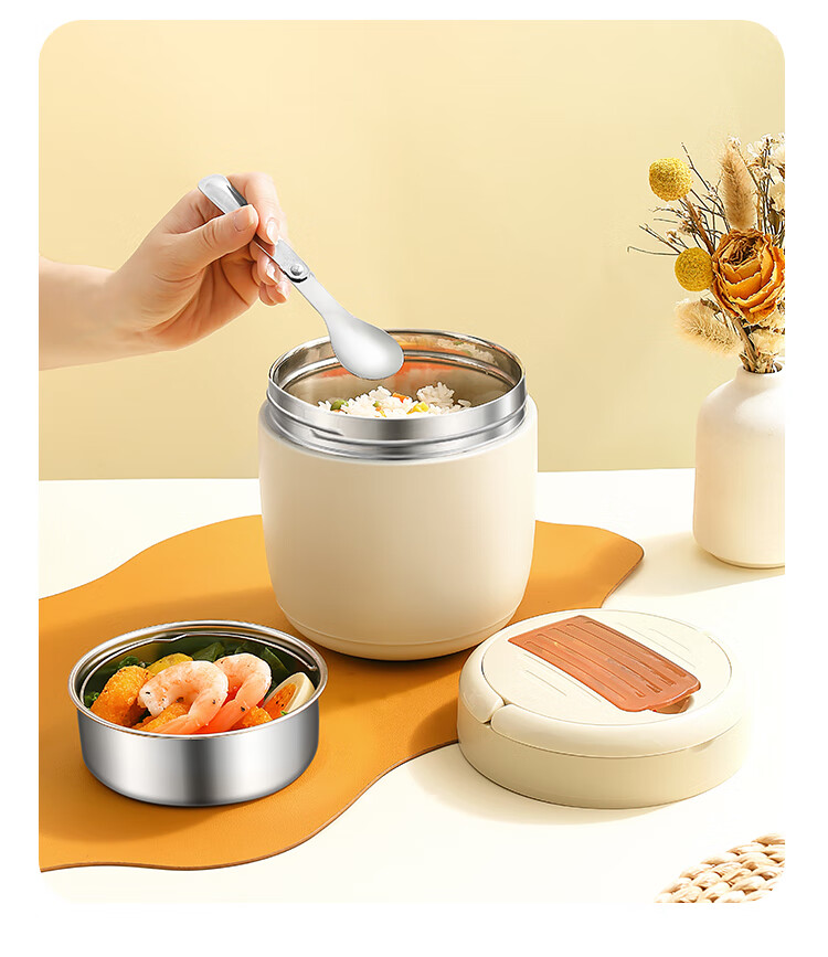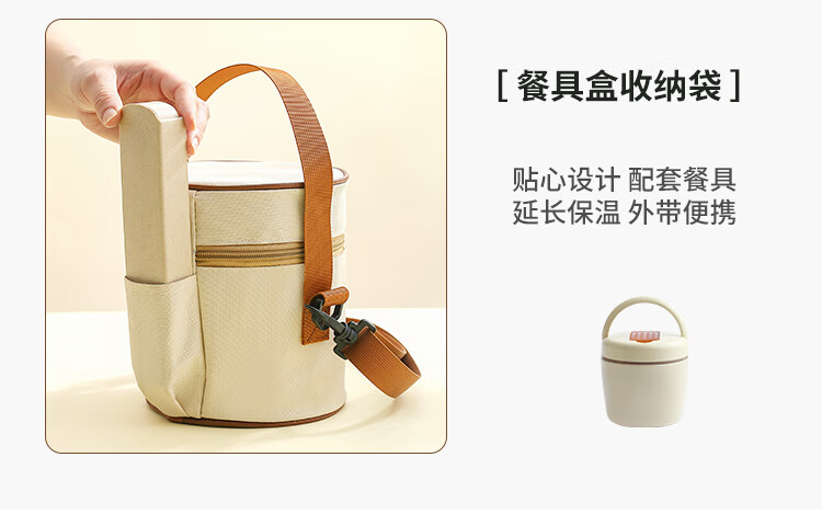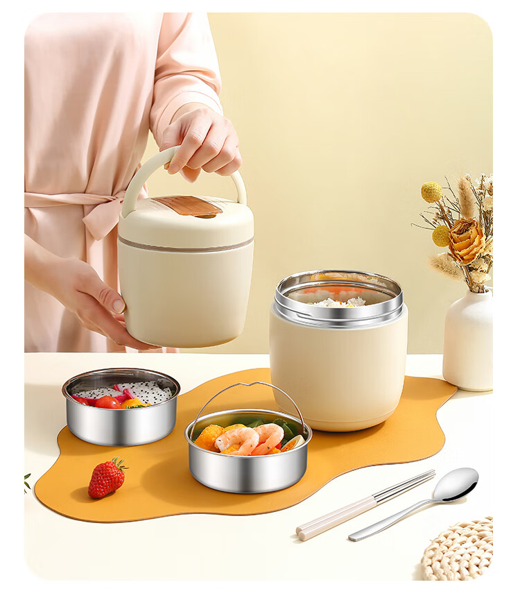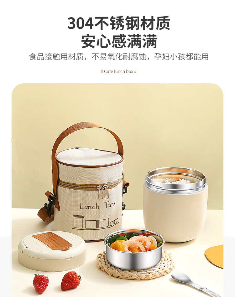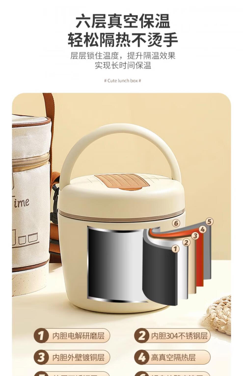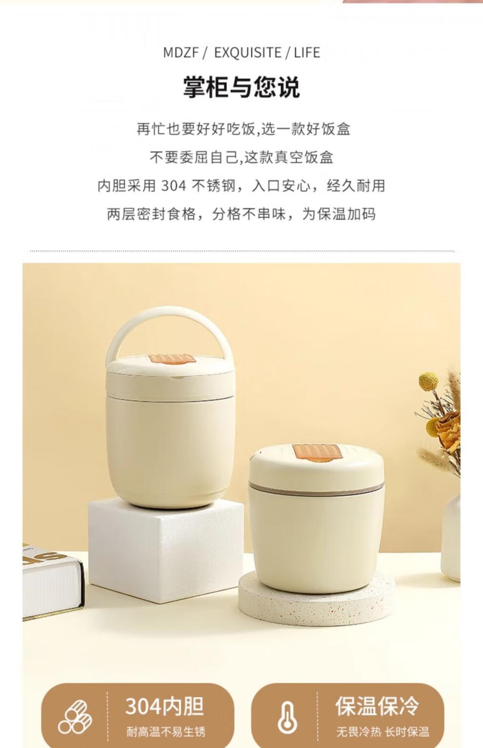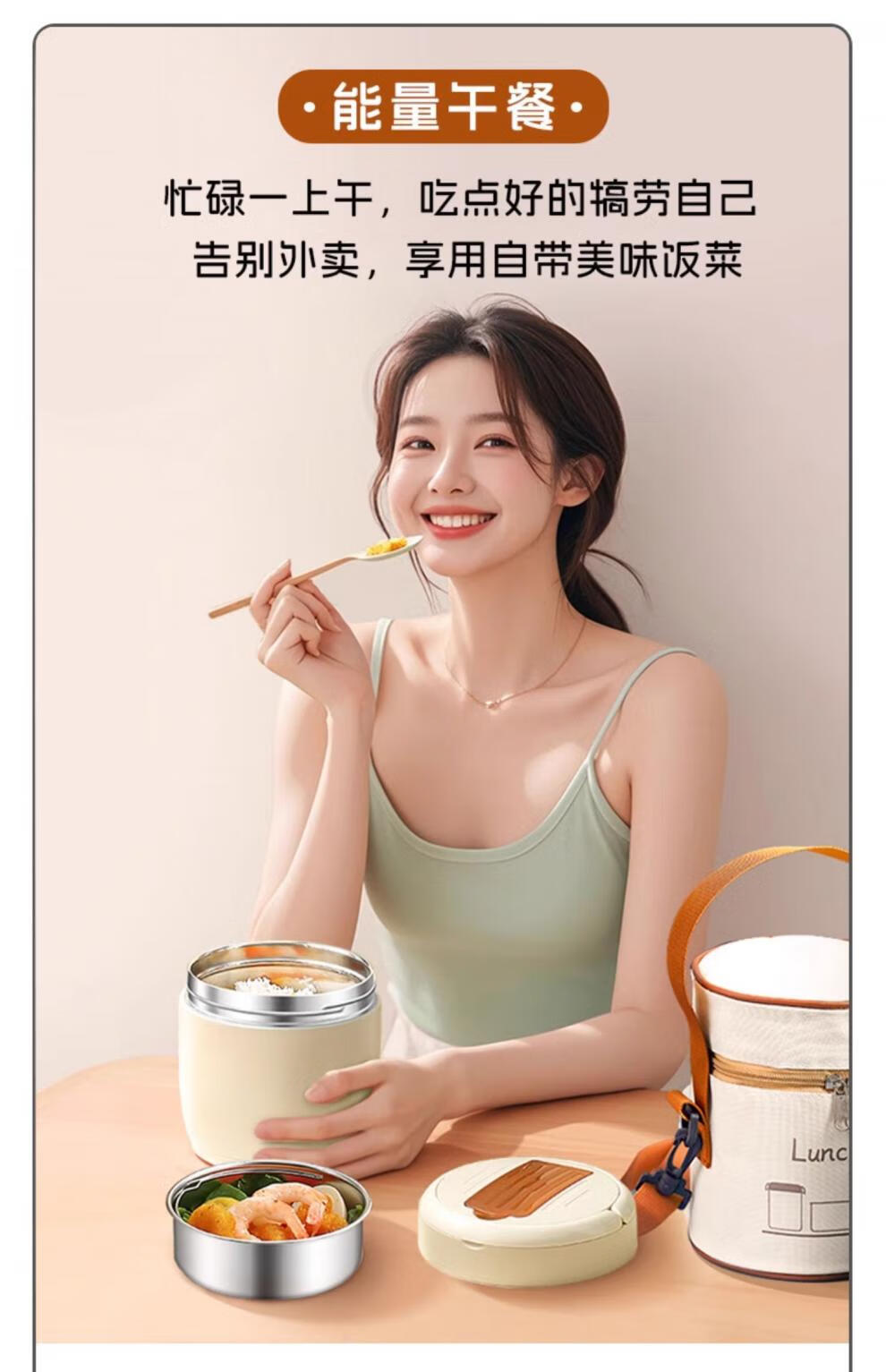 迦图鲮保温饭桶手提式保温桶保温盒饭桶不锈钢24小时超长保温便 米白色+保温袋送折叠勺子 1500ml