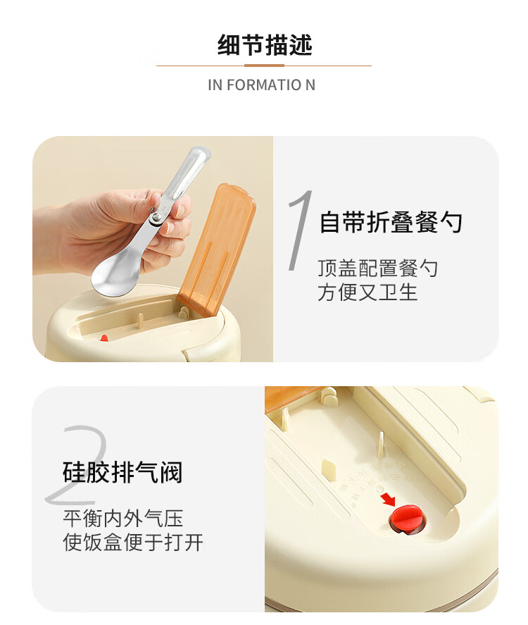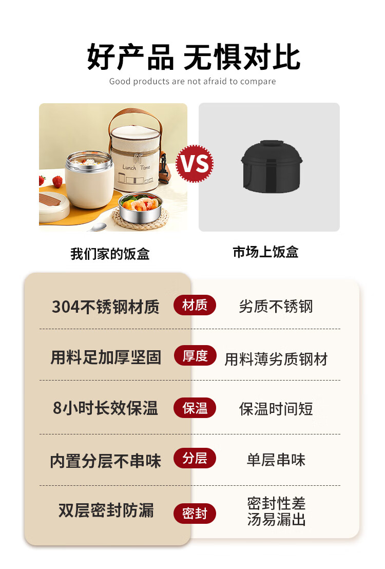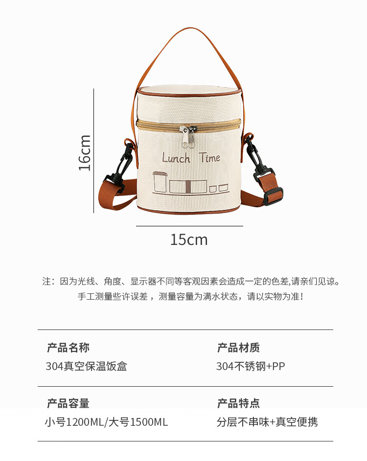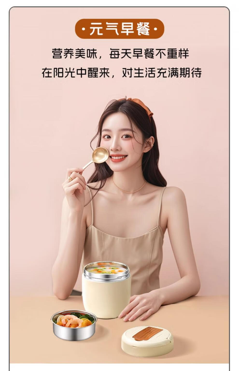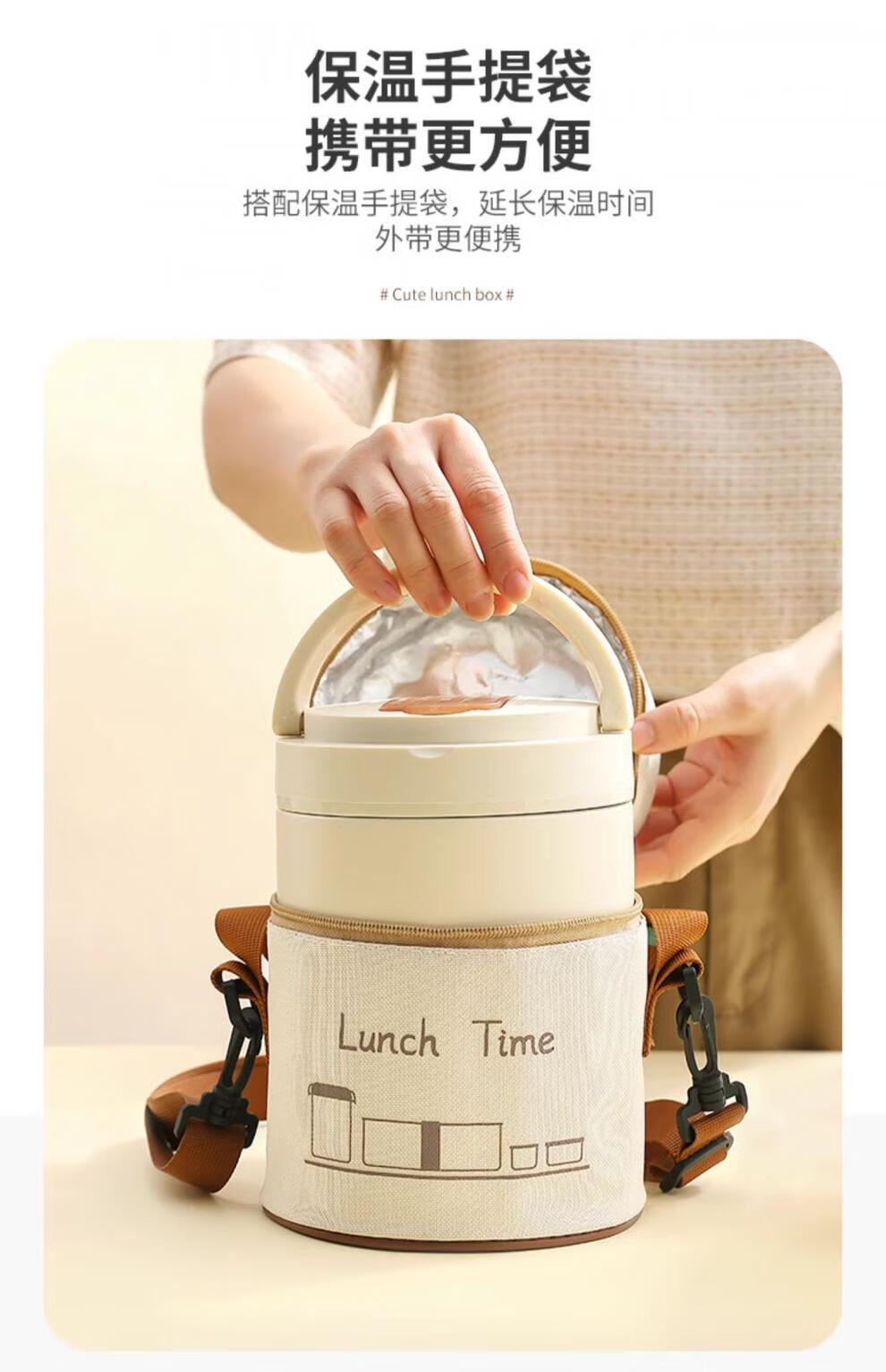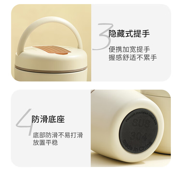 迦图鲮保温饭桶手提式保温桶保温盒饭桶不锈钢24小时超长保温便 米白色+保温袋送折叠勺子 1500ml