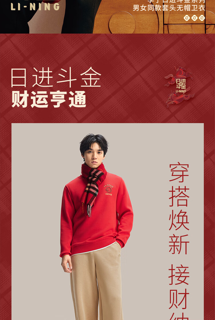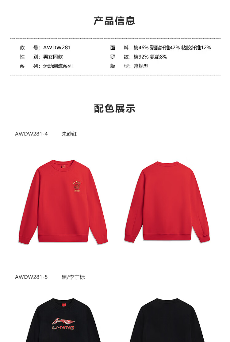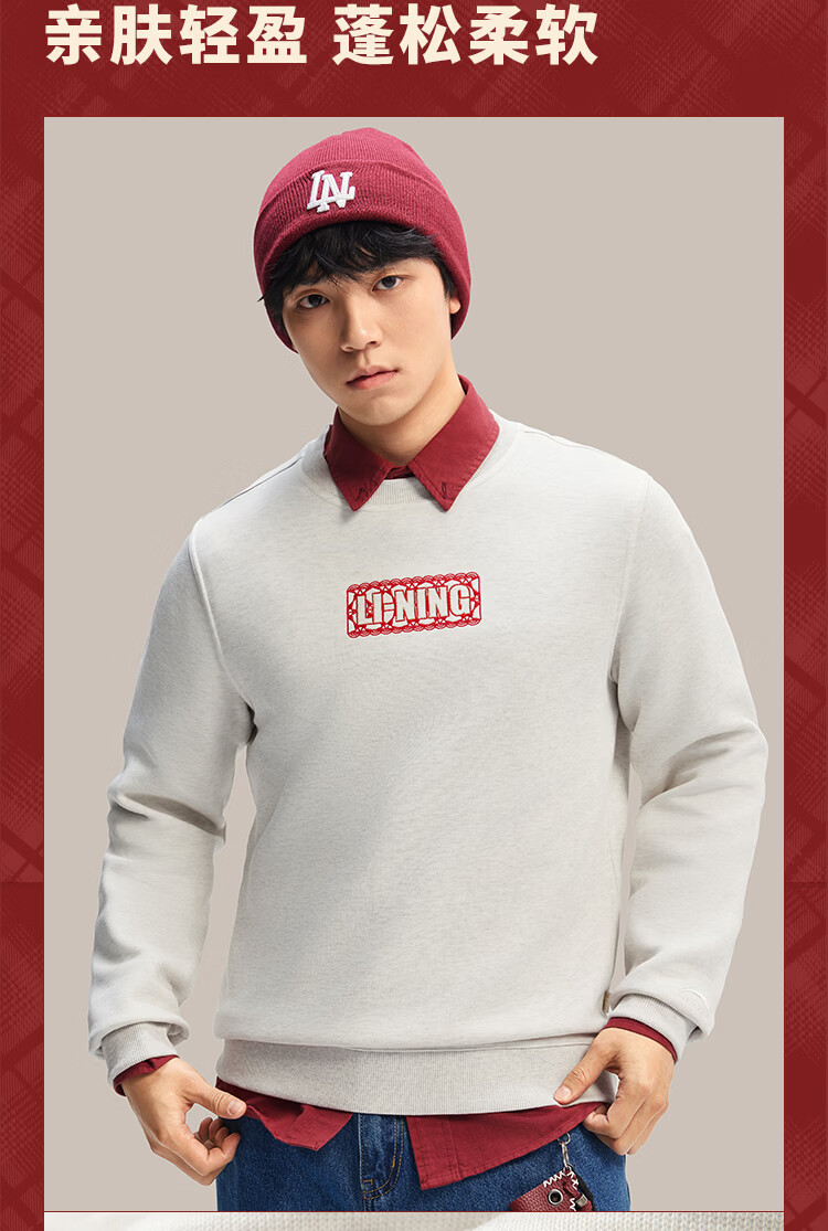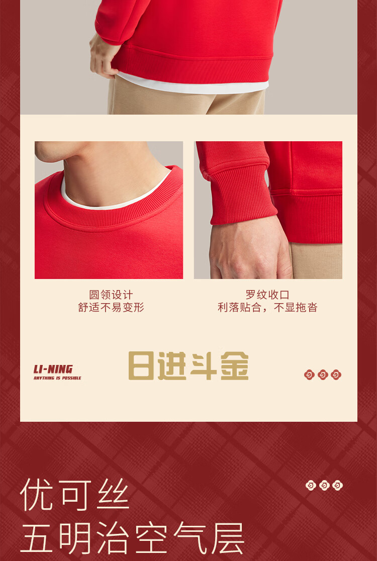李宁肖战同款日进斗金系列易去污套头无帽圆领卫衣男新年休闲运动上衣 朱砂红-4 XL