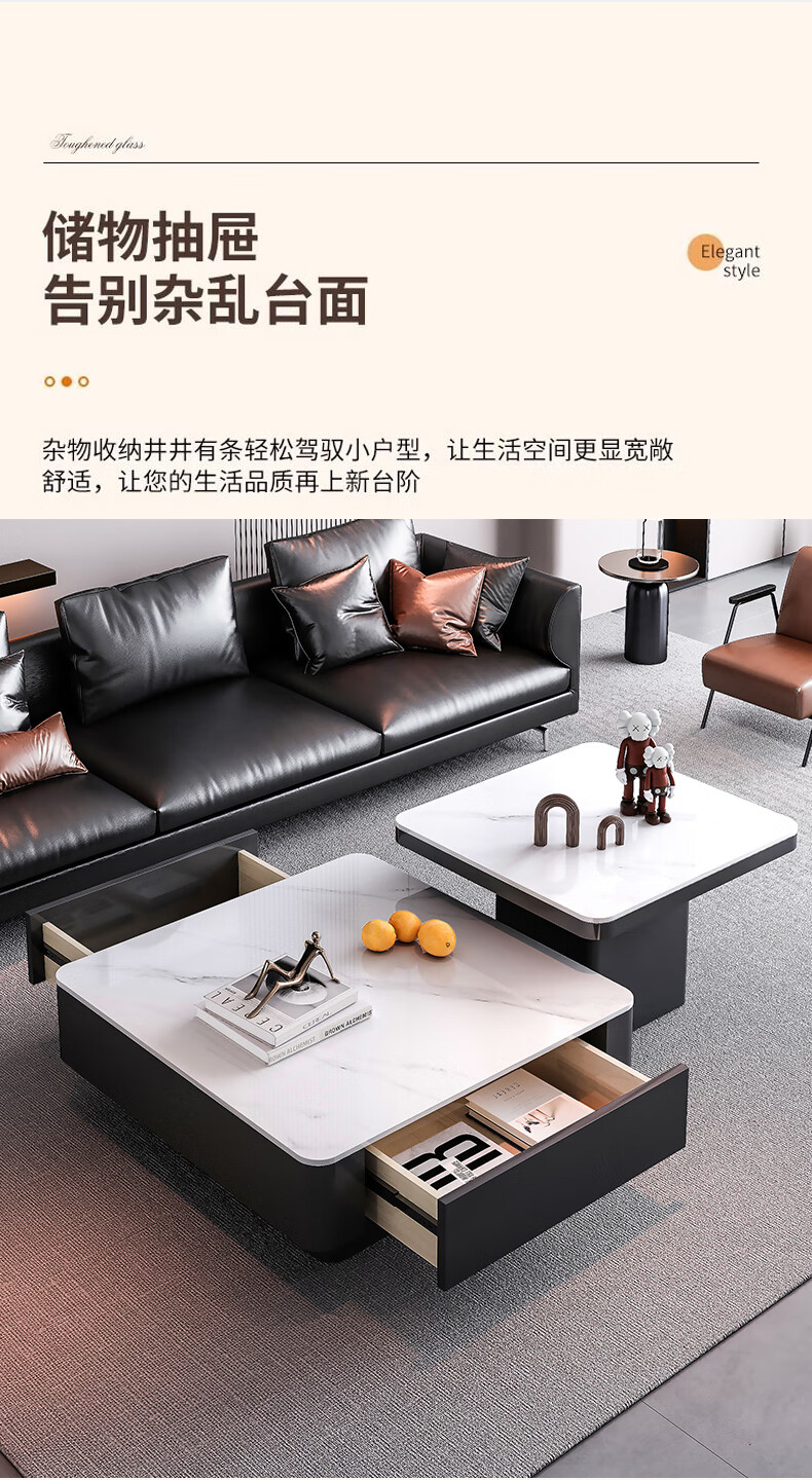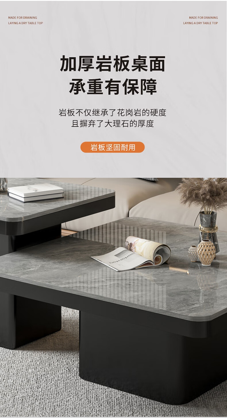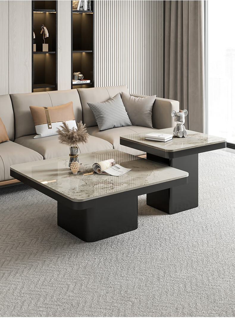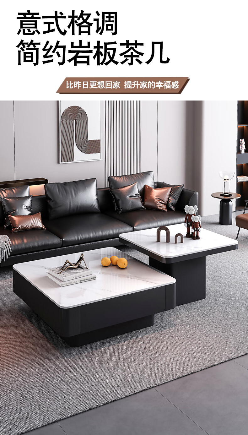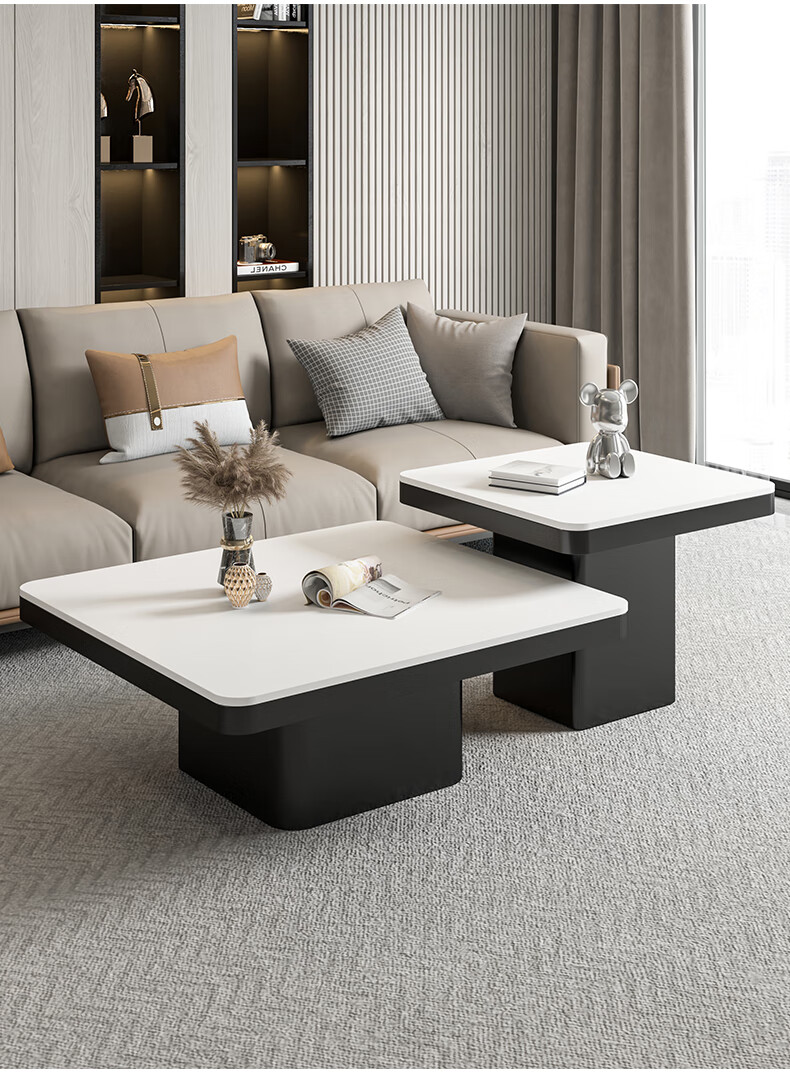 硕凡意式高级轻奢岩板正方形现代小户型茶几家用客厅黑色极简简约组合 双抽屉款-鱼肚白岩板【80+60】cm