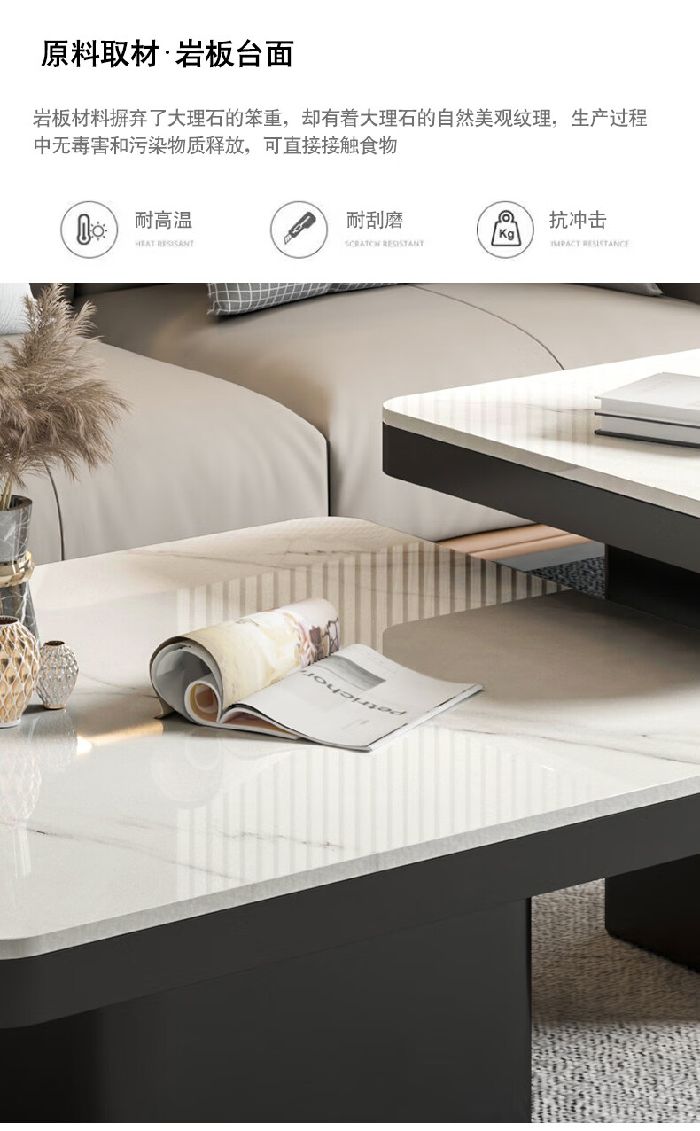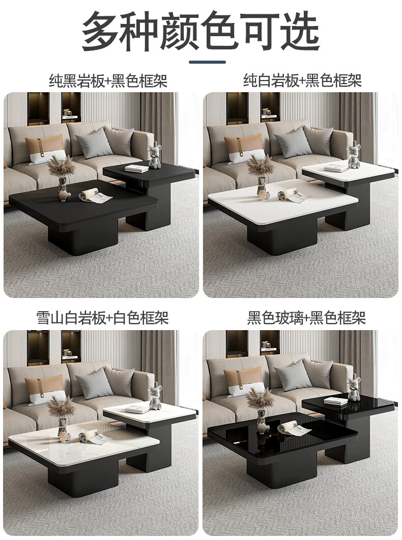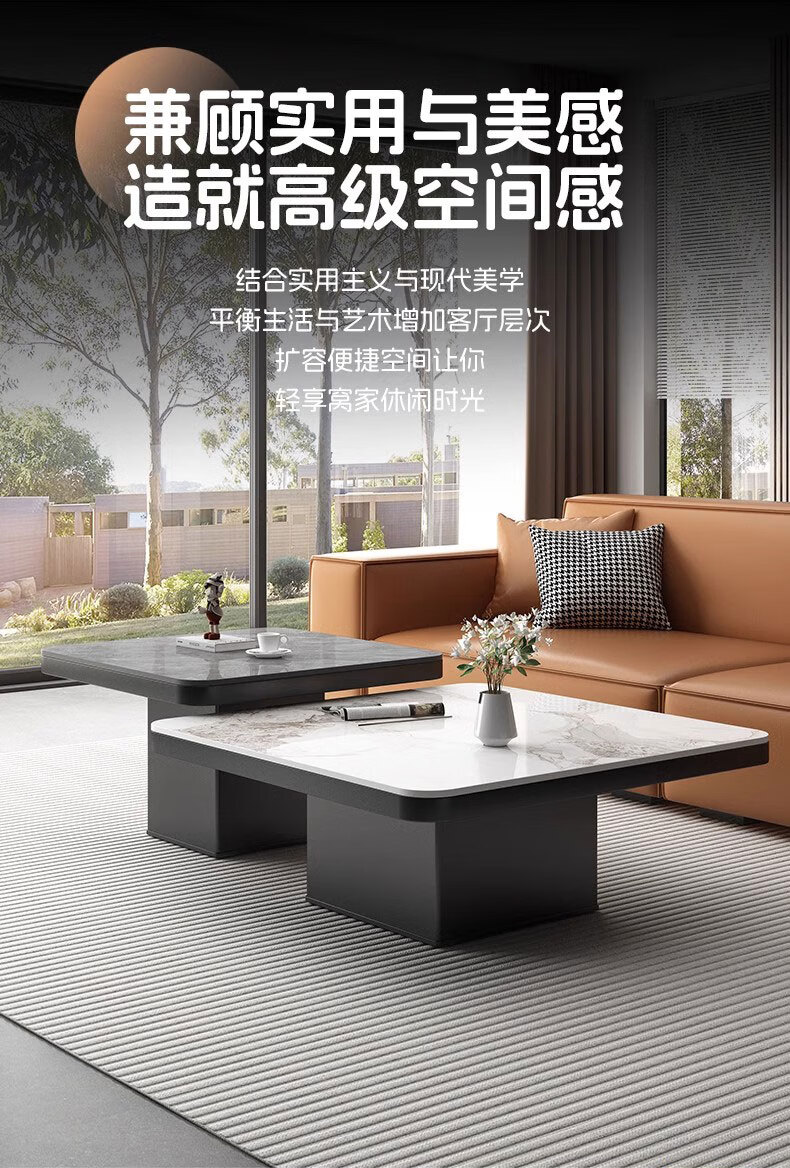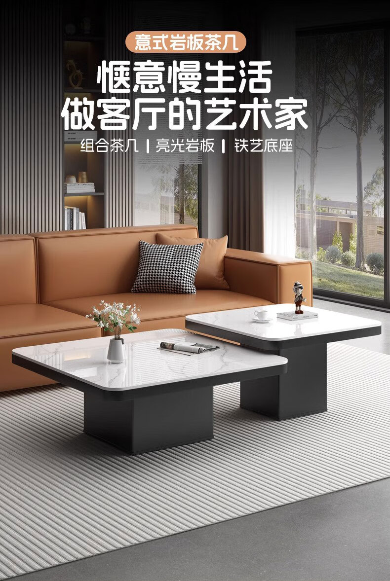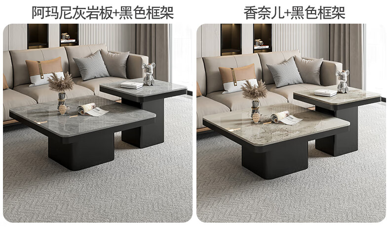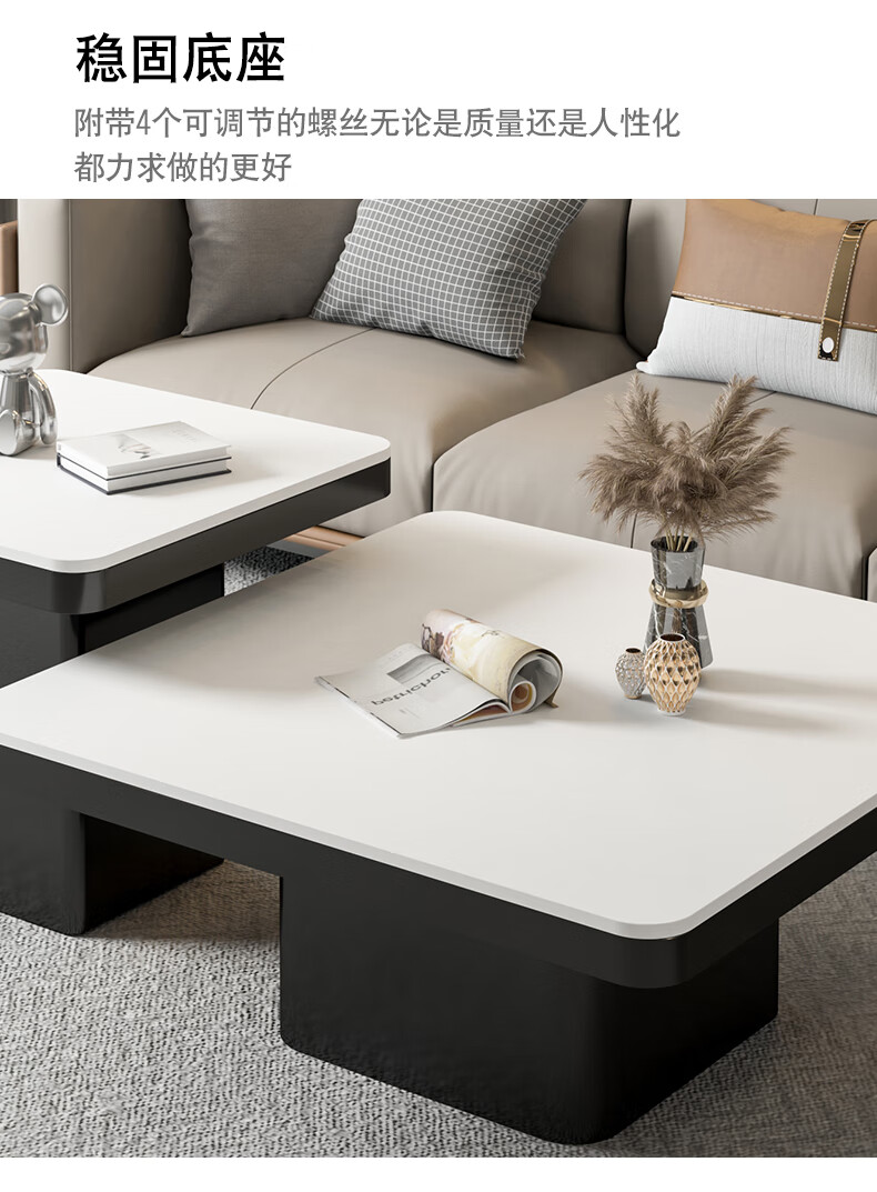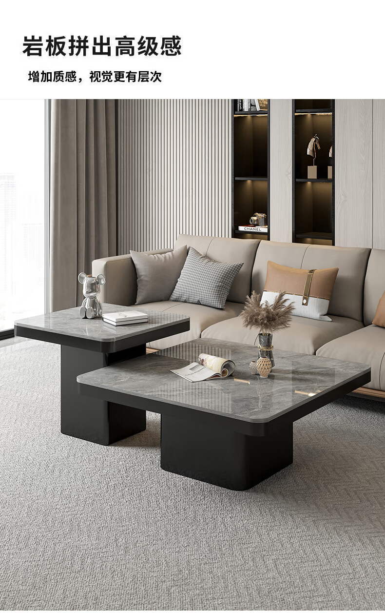 硕凡意式高级轻奢岩板正方形现代小户型茶几家用客厅黑色极简简约组合 双抽屉款-鱼肚白岩板【80+60】cm