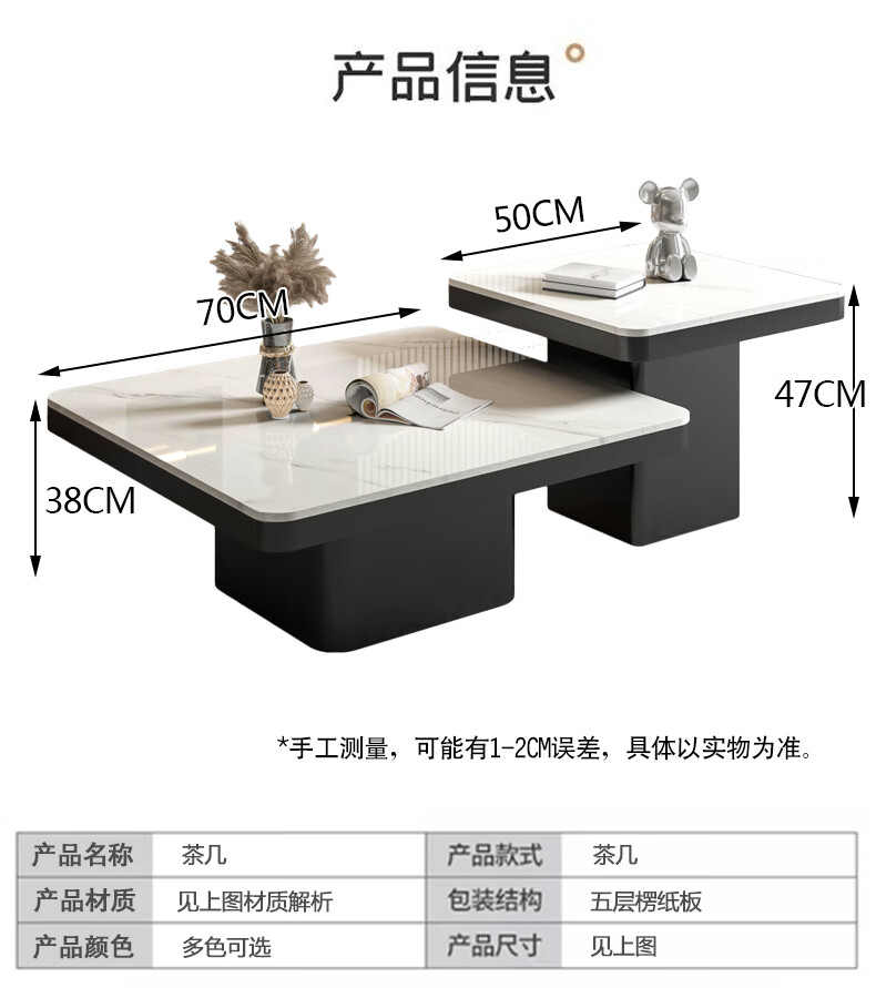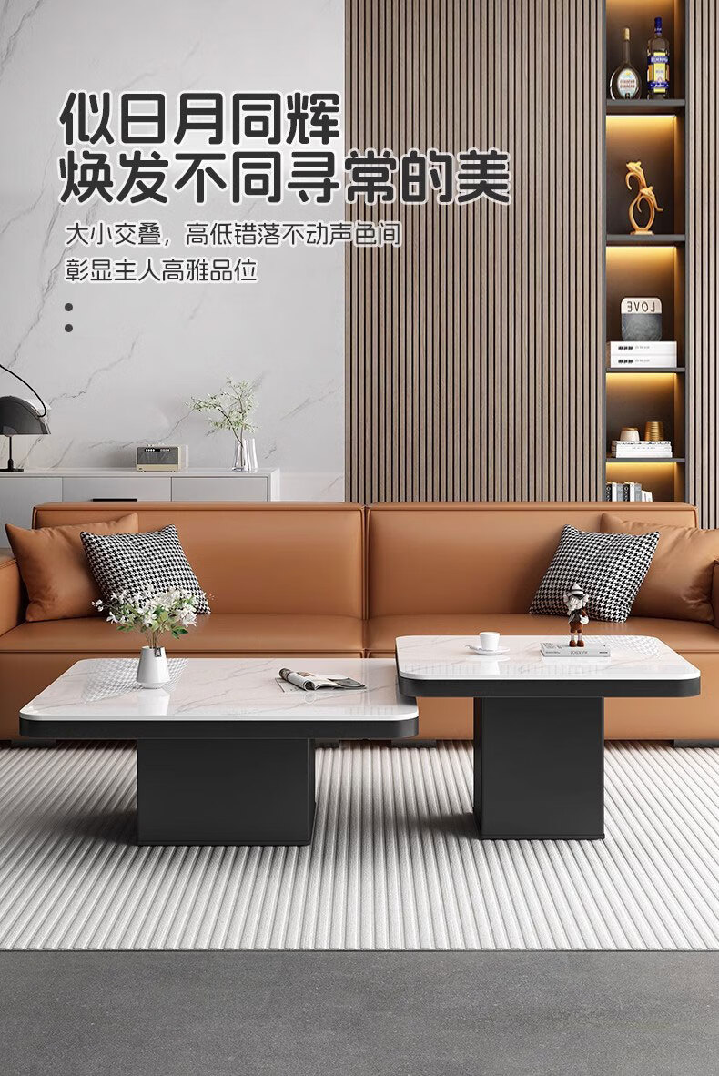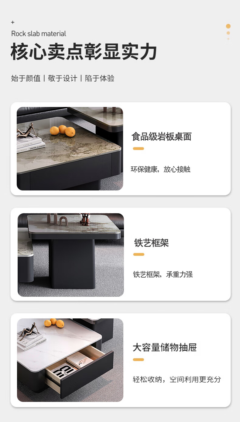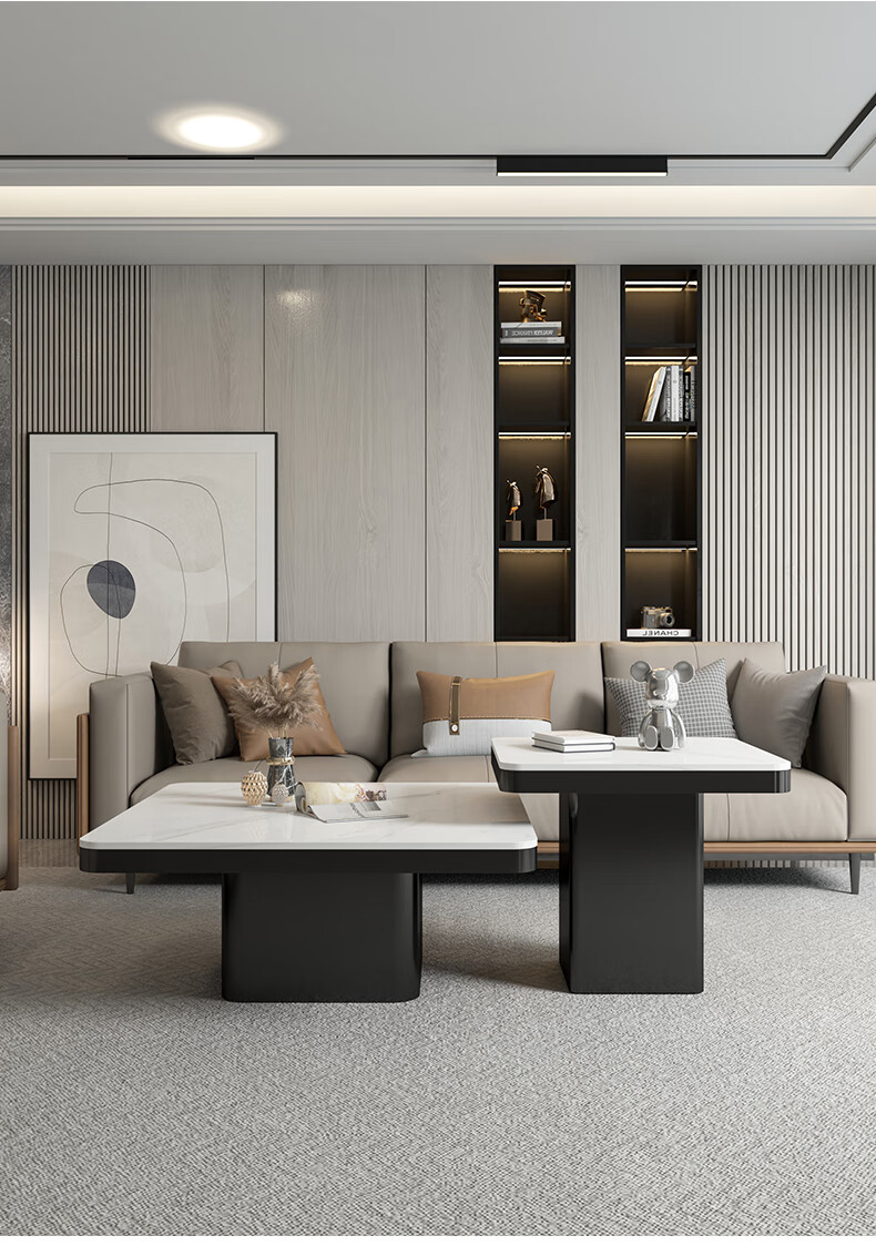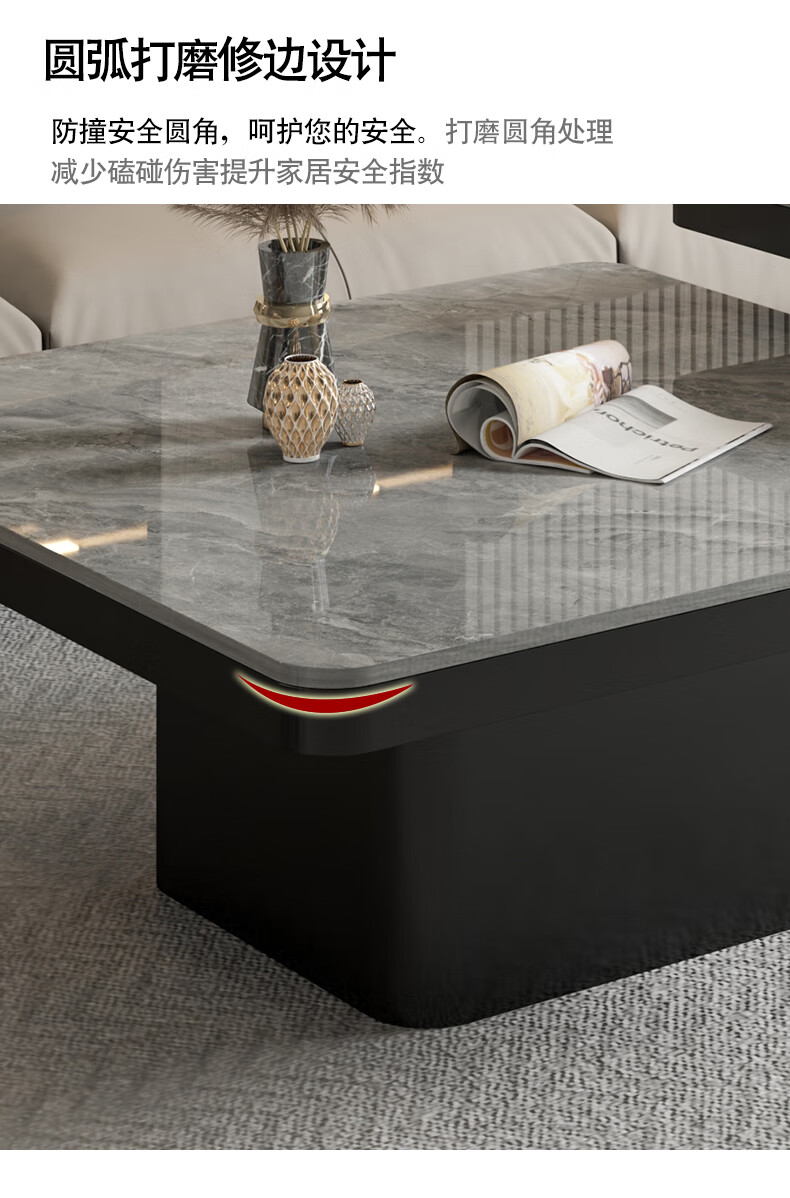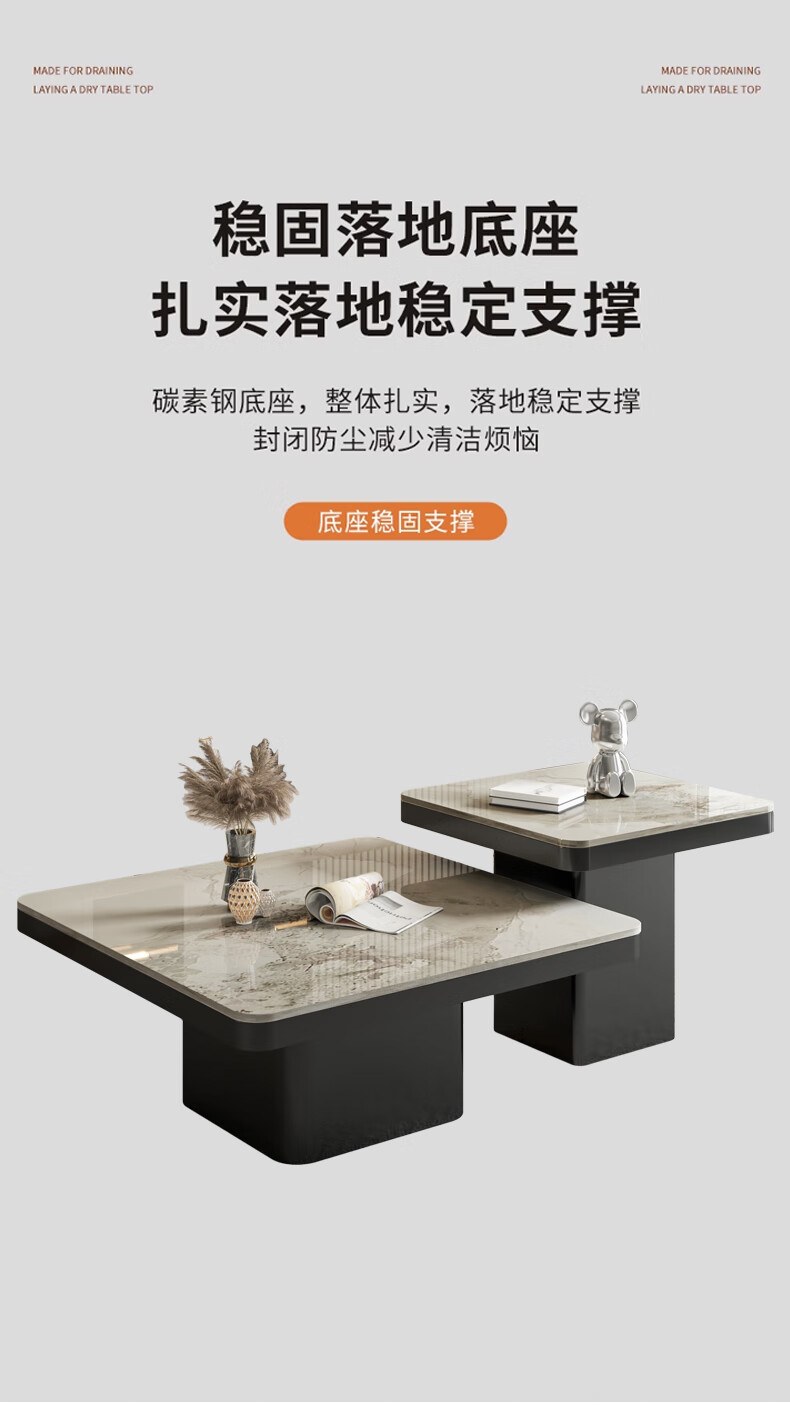 硕凡意式高级轻奢岩板正方形现代小户型茶几家用客厅黑色极简简约组合 双抽屉款-鱼肚白岩板【80+60】cm
