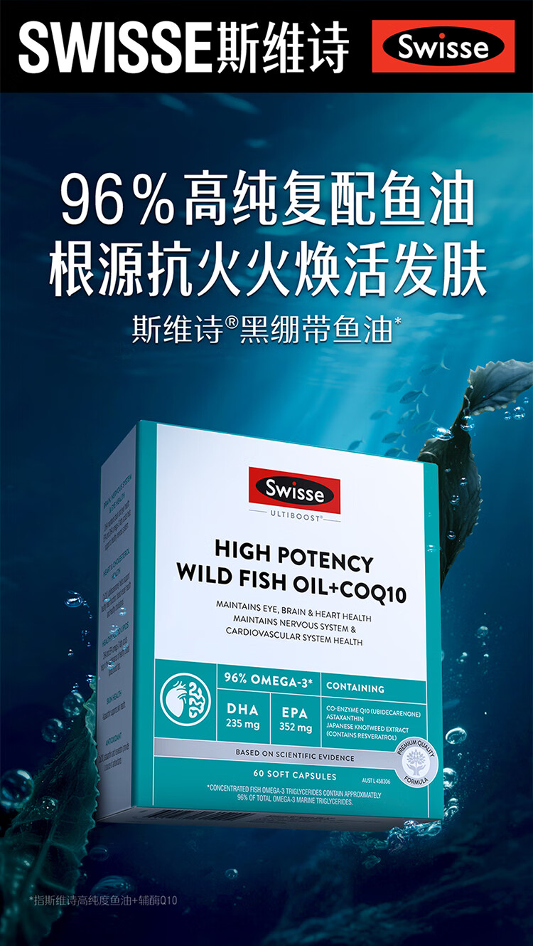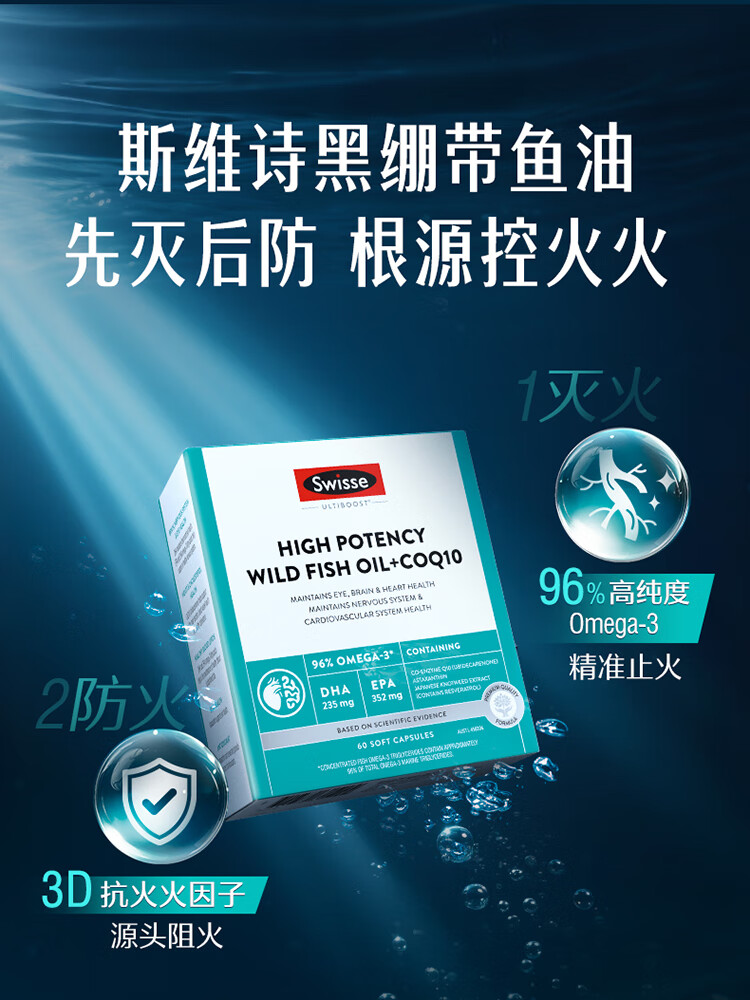 Swisse斯维诗 96%高纯度 深海黑绷带鱼油 辅酶Q10软胶囊Omega-3成人dha 【囤货装】 60粒*2盒