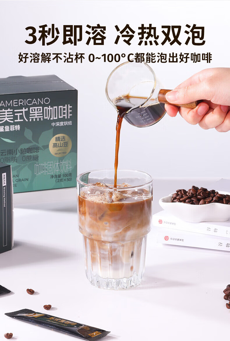 鲨鱼菲特黑咖啡美式速溶咖啡新年年货运动健身减0蔗糖0脂云南咖啡豆粉 【囤货贩量】黑咖啡2g*100条