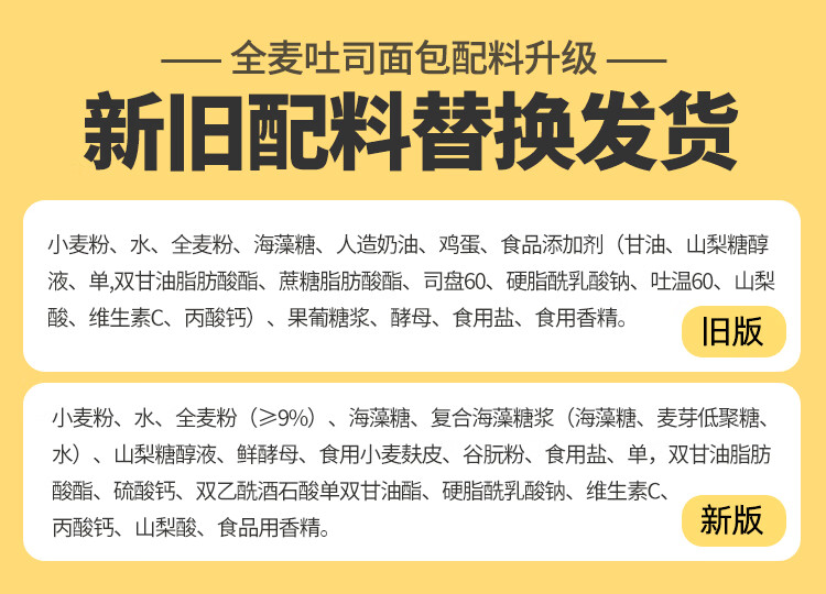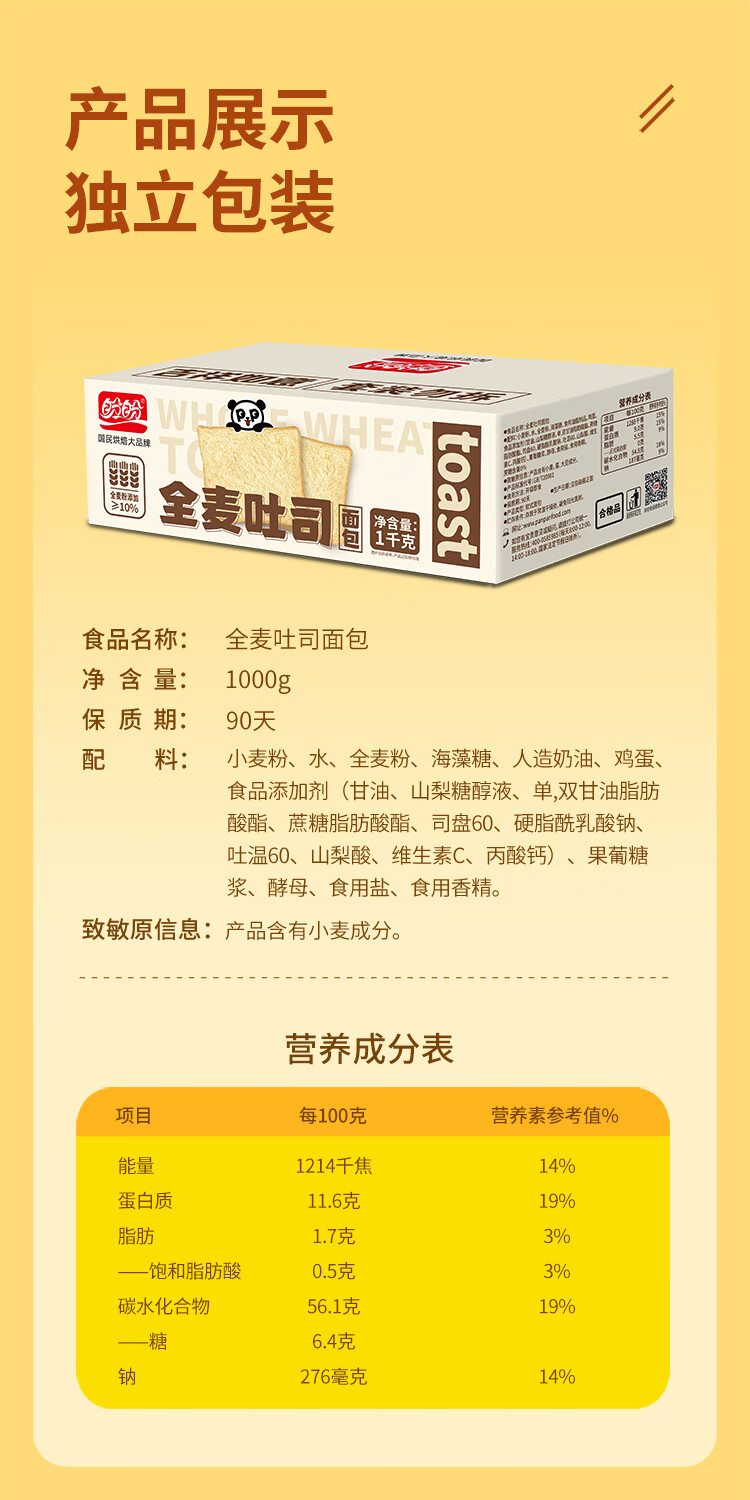 盼盼 全麦吐司面包1000g 切片早餐面包三明治吐司粗粮0蔗糖面包片