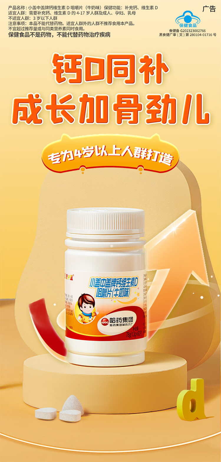 新盖中盖哈药 碳酸钙维生素D3咀嚼片 儿童学生成长补钙钙片 儿童钙片 60片*3瓶 (有效期至2026年6月)