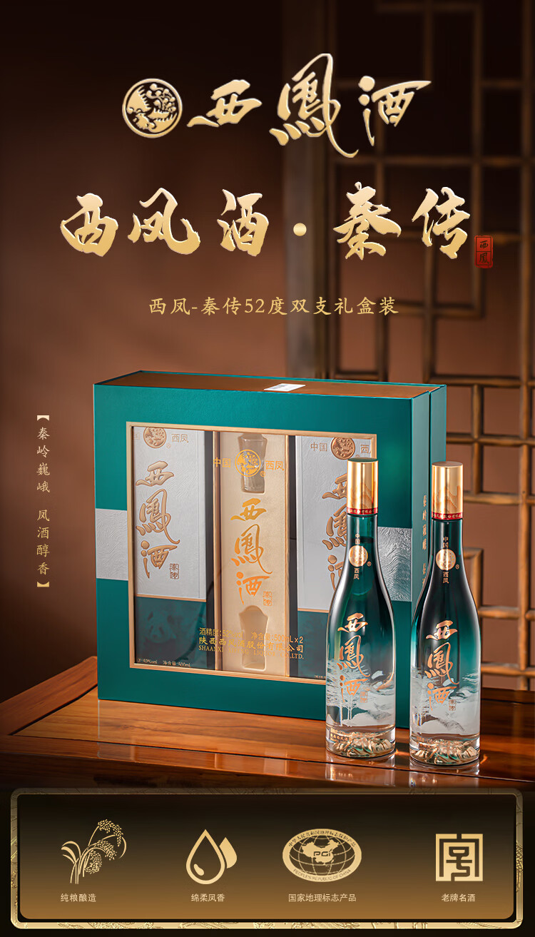西凤52度凤香型 纯粮白酒送礼佳品 官方正品白酒礼盒节日送礼送长辈 52度 500mL 2瓶 山河系列秦传 至臻礼盒装