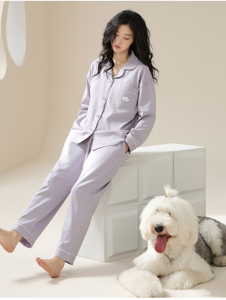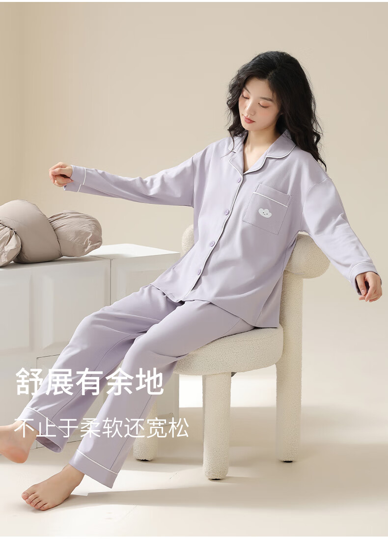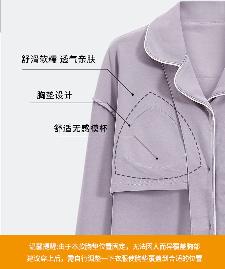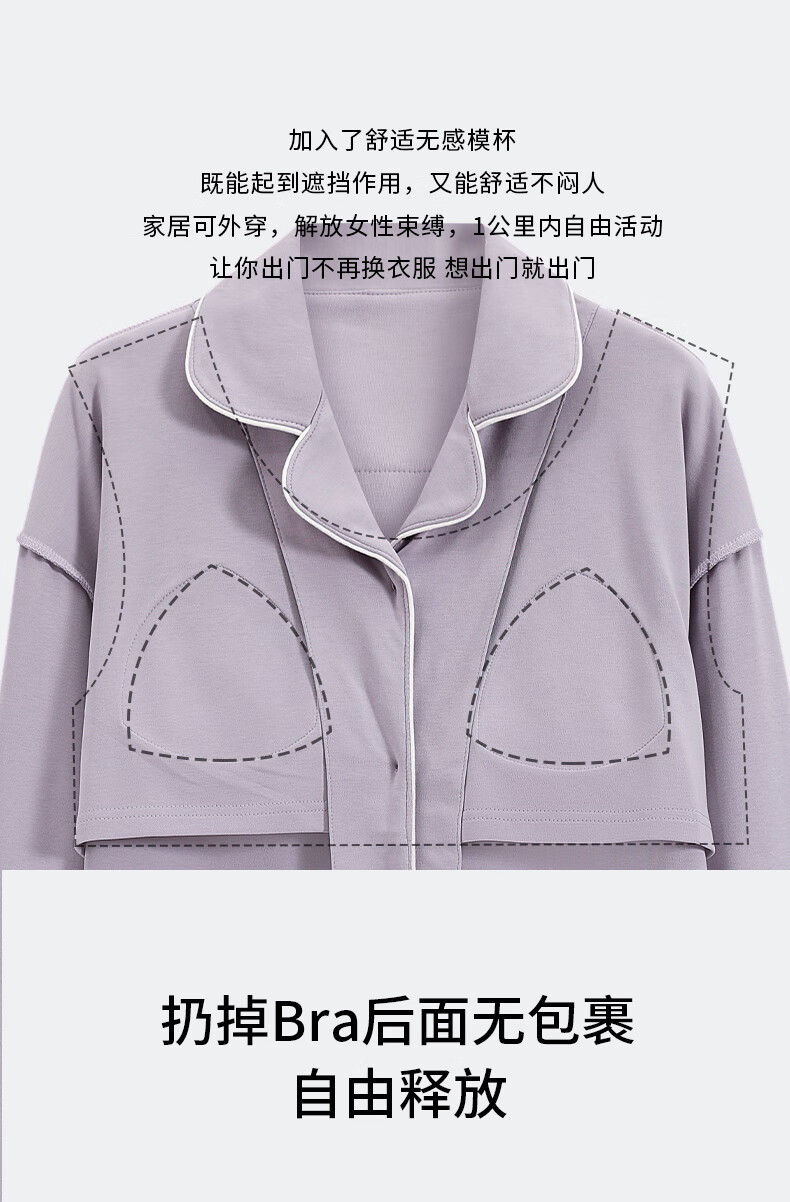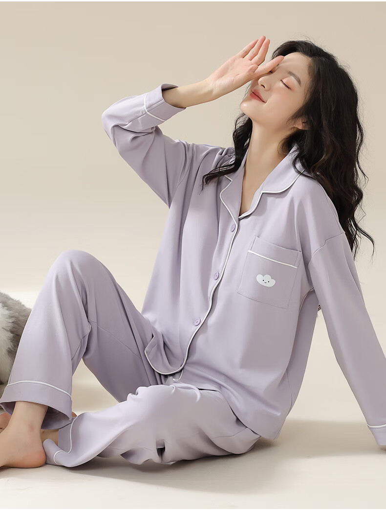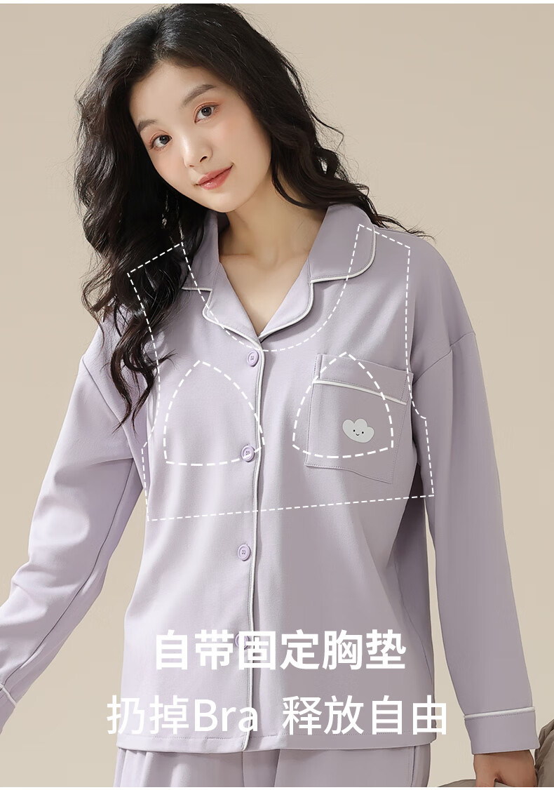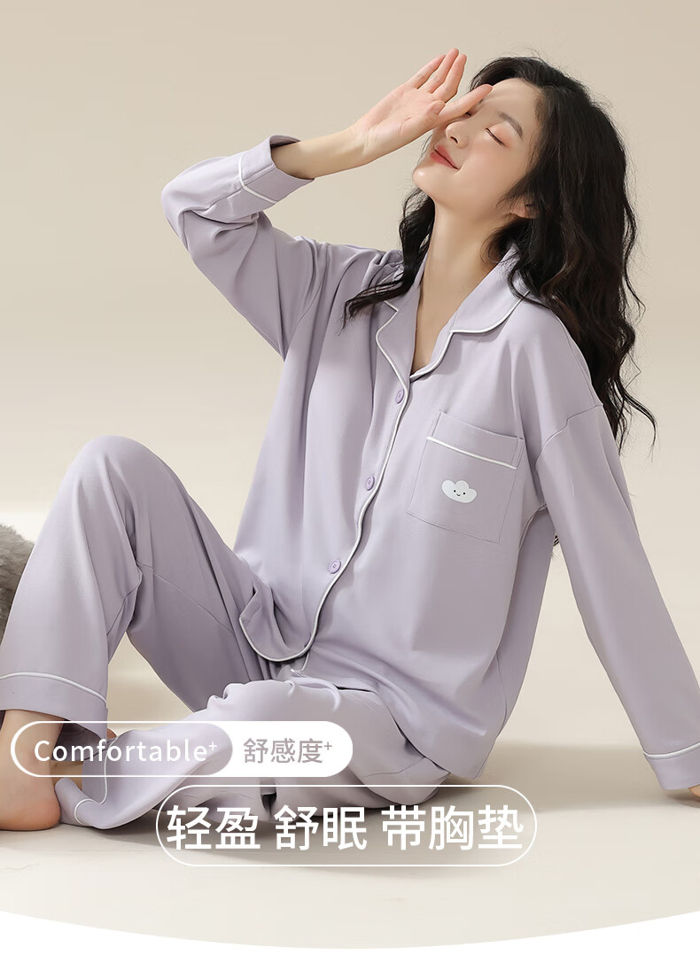 猫人莼棉睡衣女 自带胸垫春秋新款长袖翻领开衫 可外穿家居服大码套装 奶杏色【纯棉紧密 | 自带胸垫】 XL