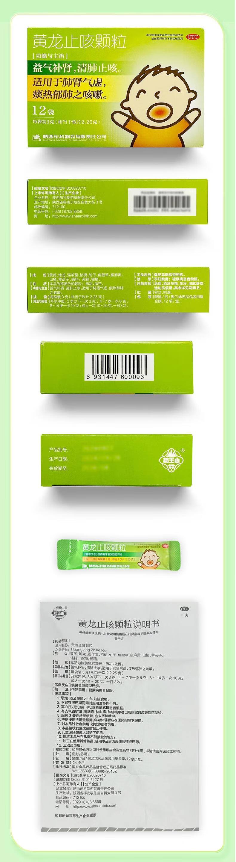药王山 黄龙止咳颗粒3g*12袋/盒 清肺止咳 益气补肾 小儿咳嗽 肺肾气虚 儿童感冒发热 咳嗽药