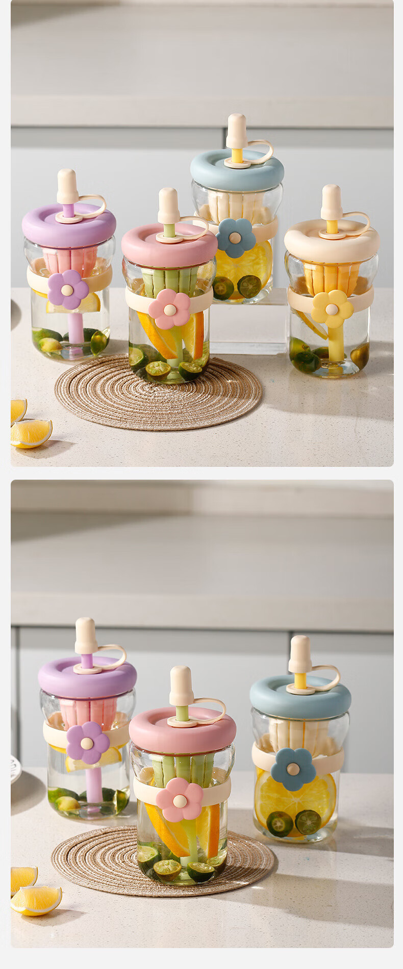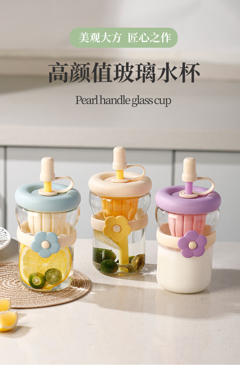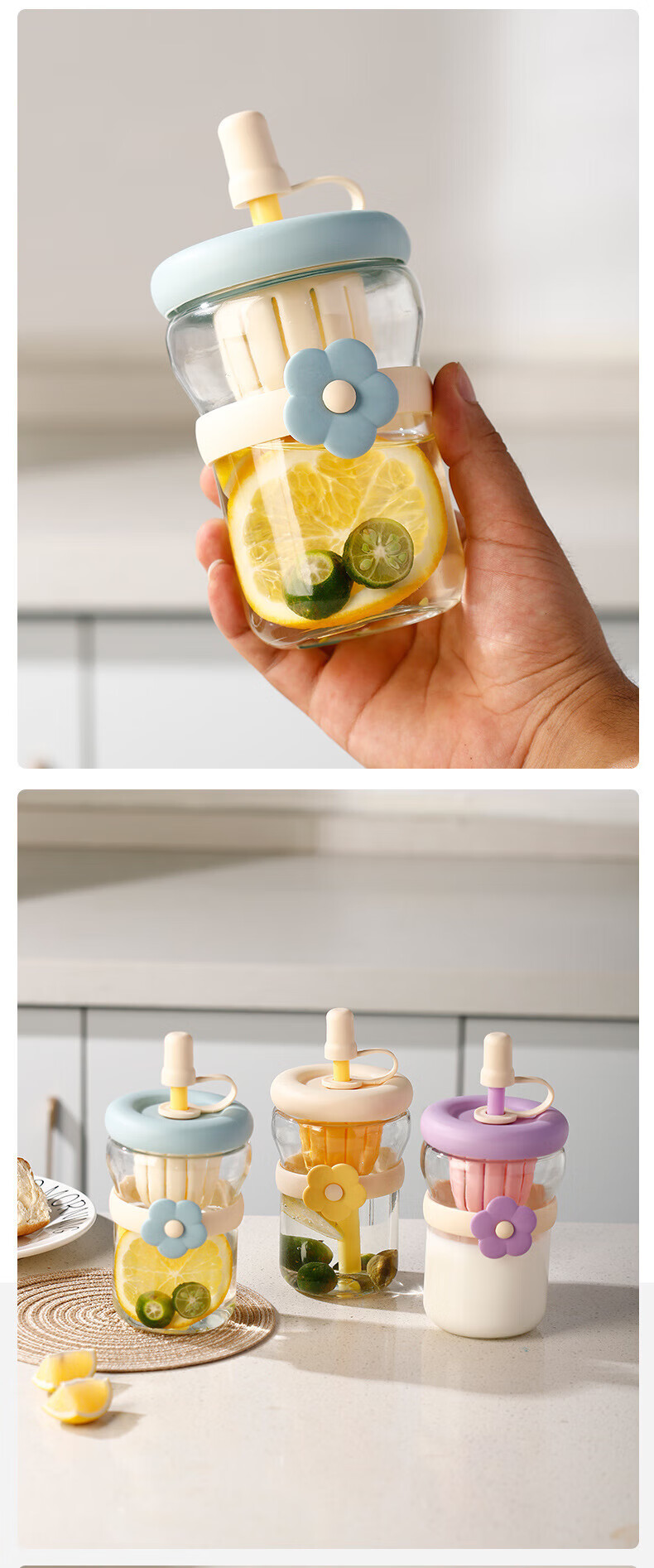 DCYAWS夏季高颜值花朵玻璃杯带吸管简约咖啡水杯女生伴手礼 紫色 401-500ml