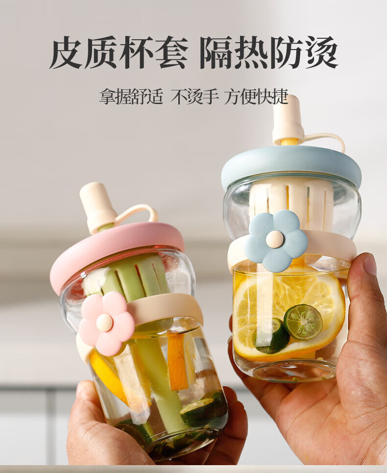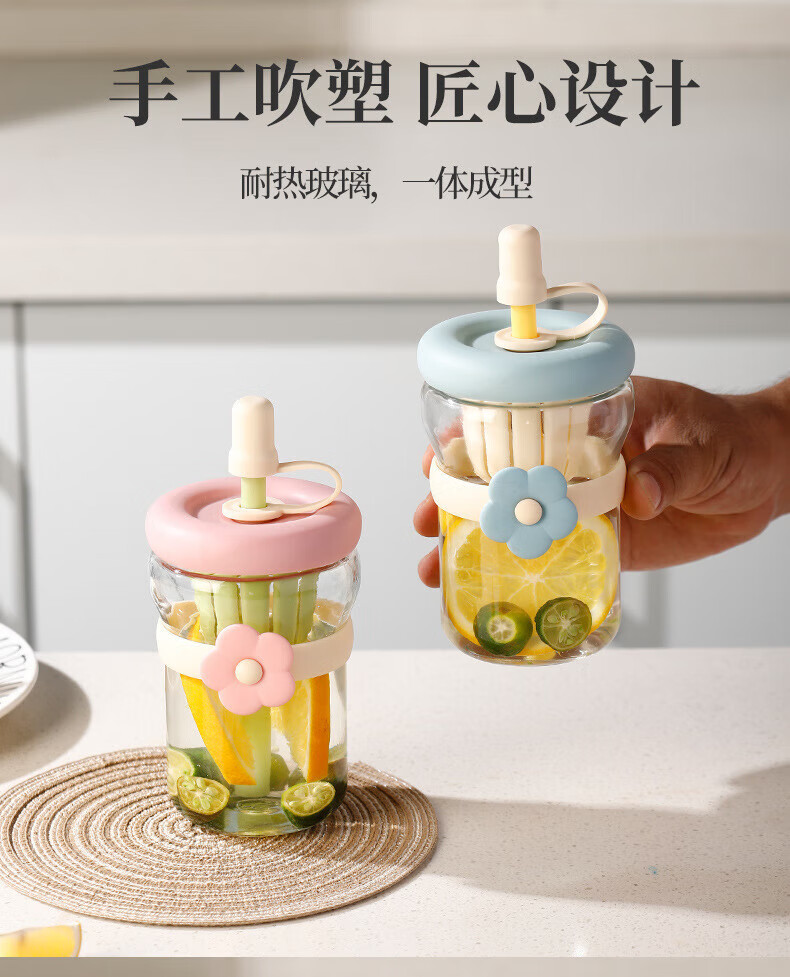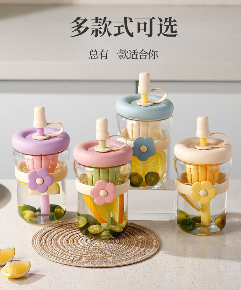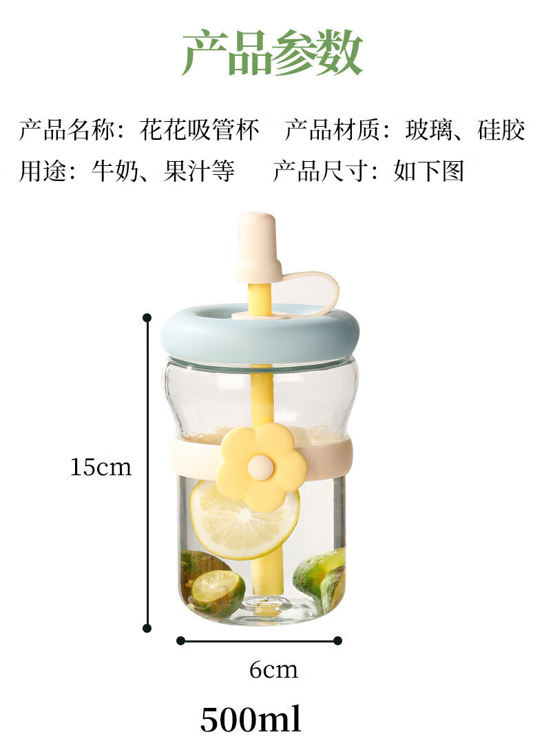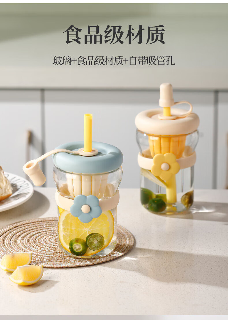 DCYAWS夏季高颜值花朵玻璃杯带吸管简约咖啡水杯女生伴手礼 紫色 401-500ml