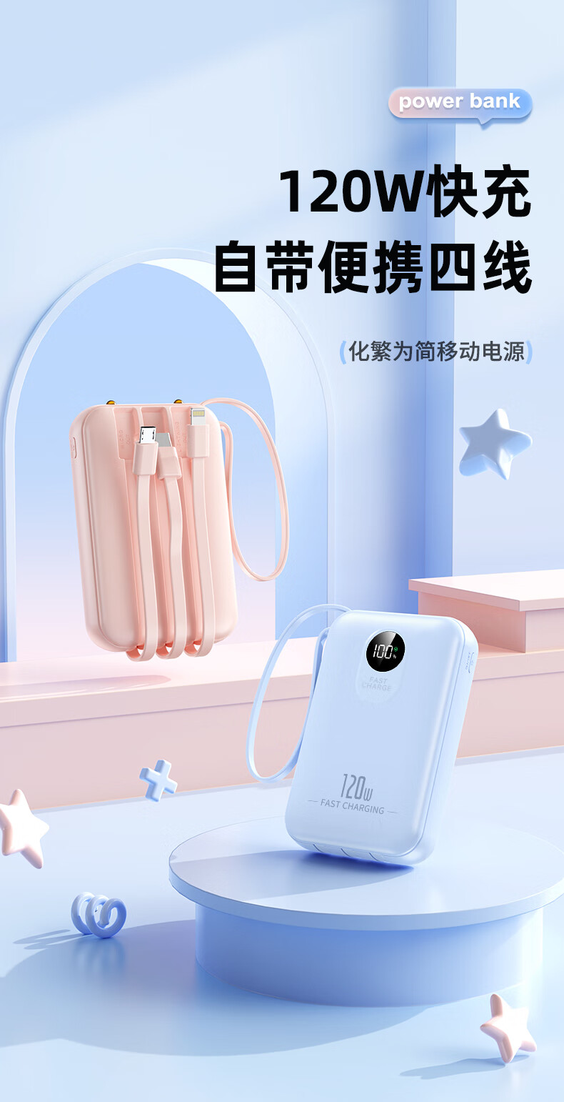 LUOIY直营【有3C认证】【新国标丨可上飞机】120W超级快充自带线充电宝小巧移动电源适用小米苹果iphone 天空蓝【升级版+3C认证】进口电芯 自带四线+免费换新